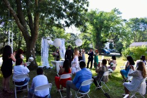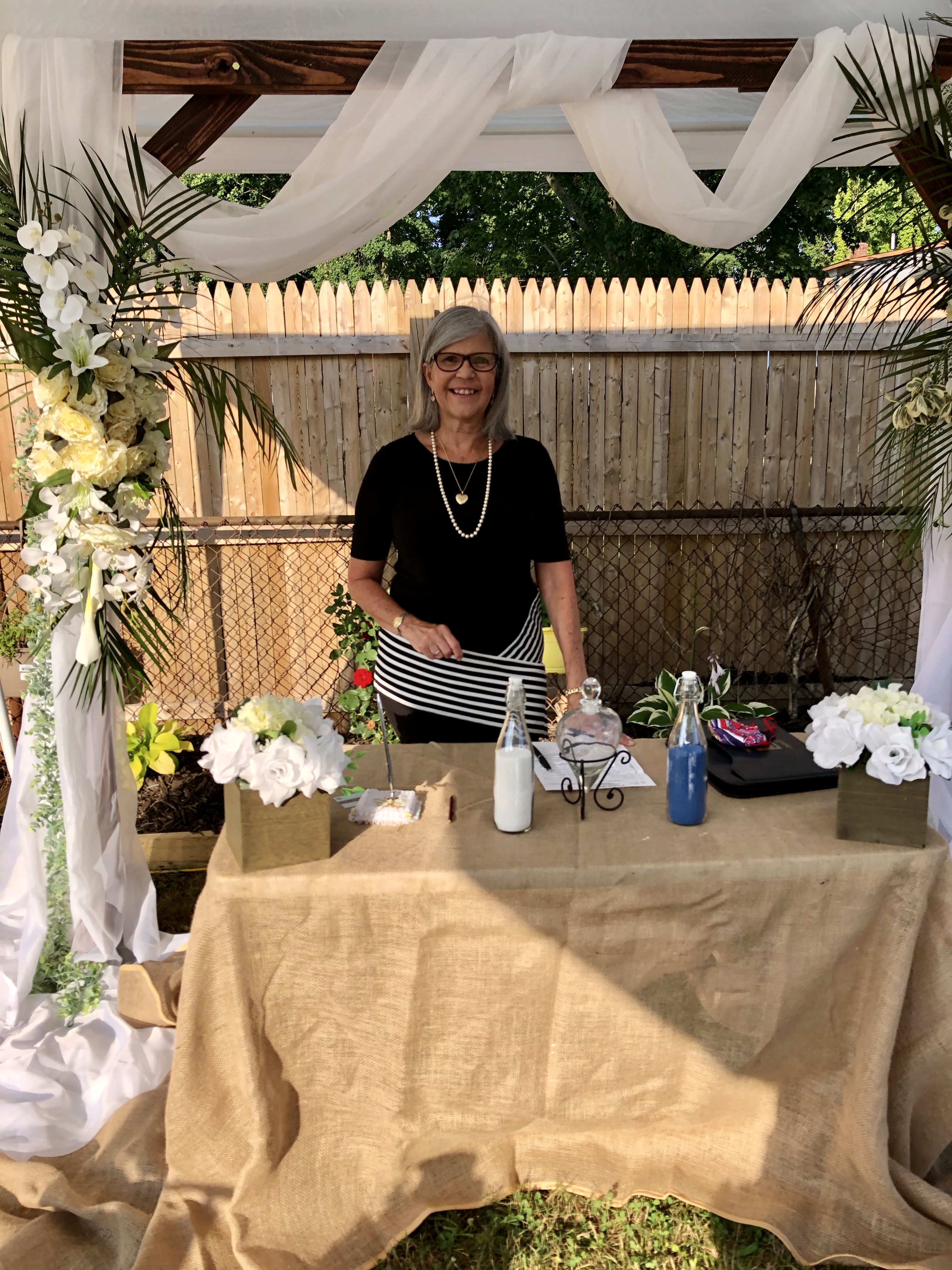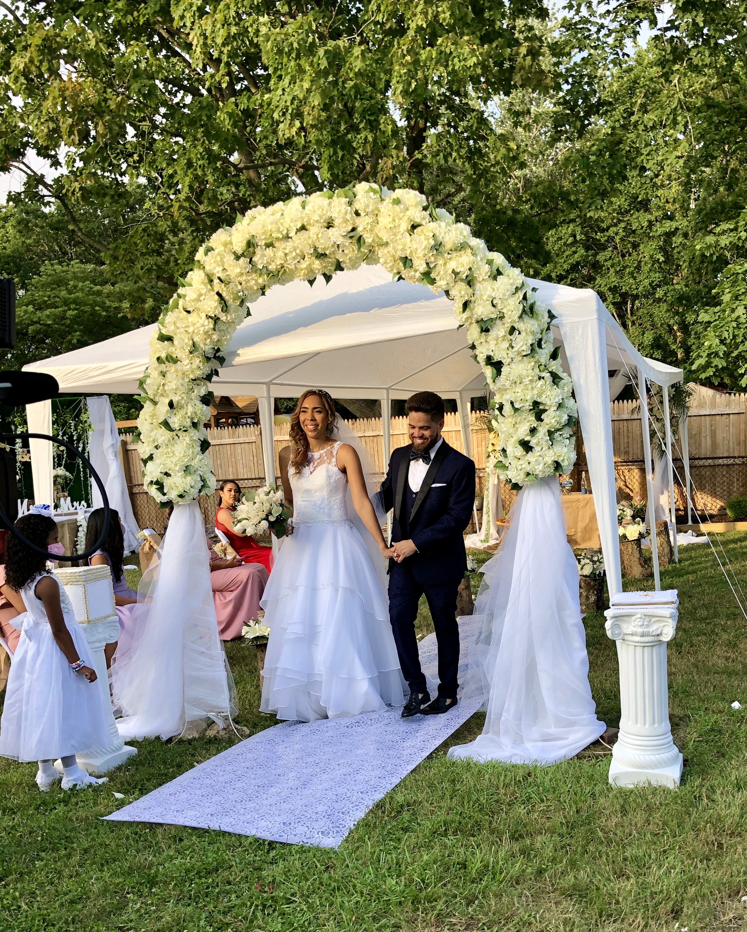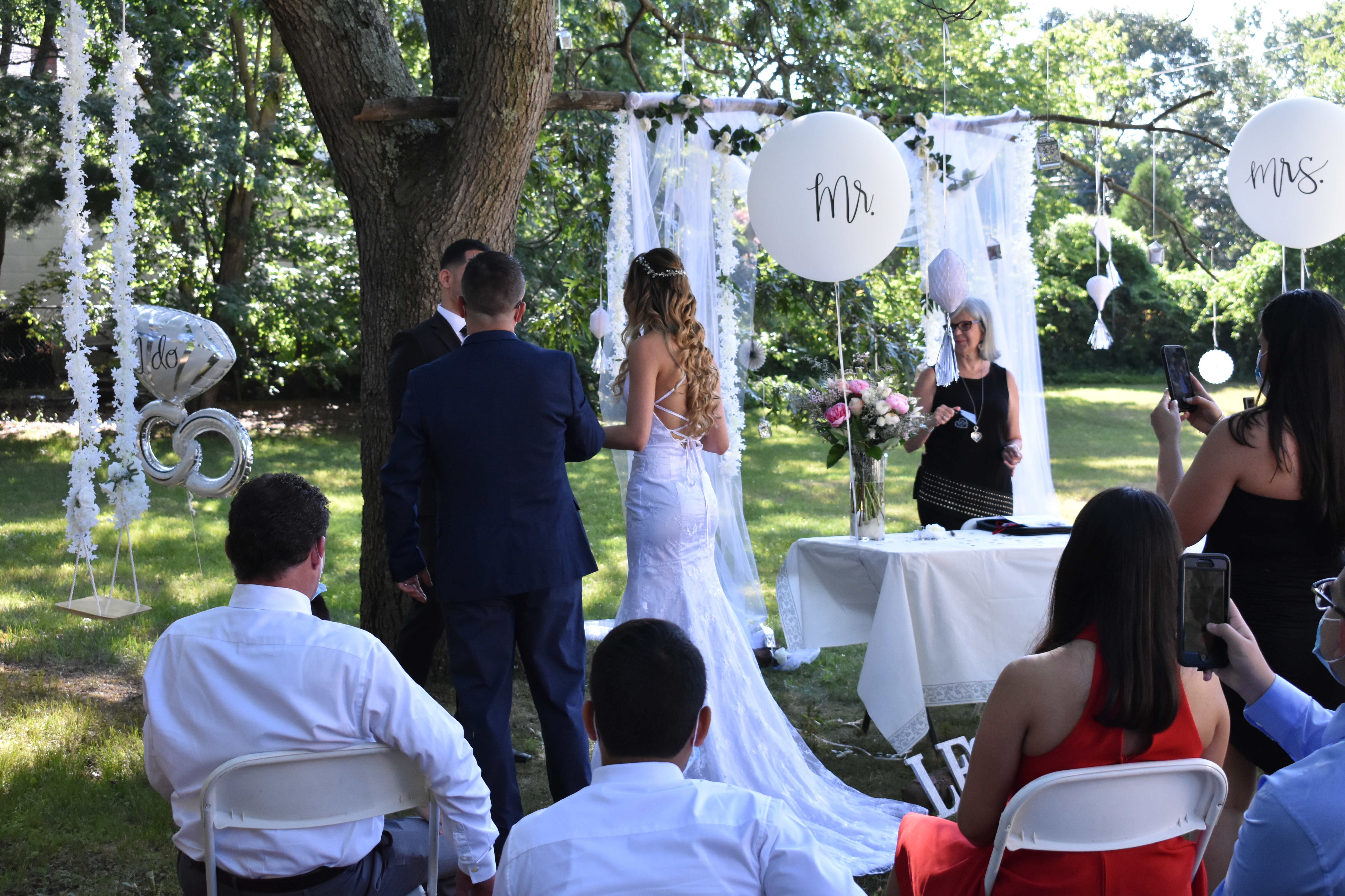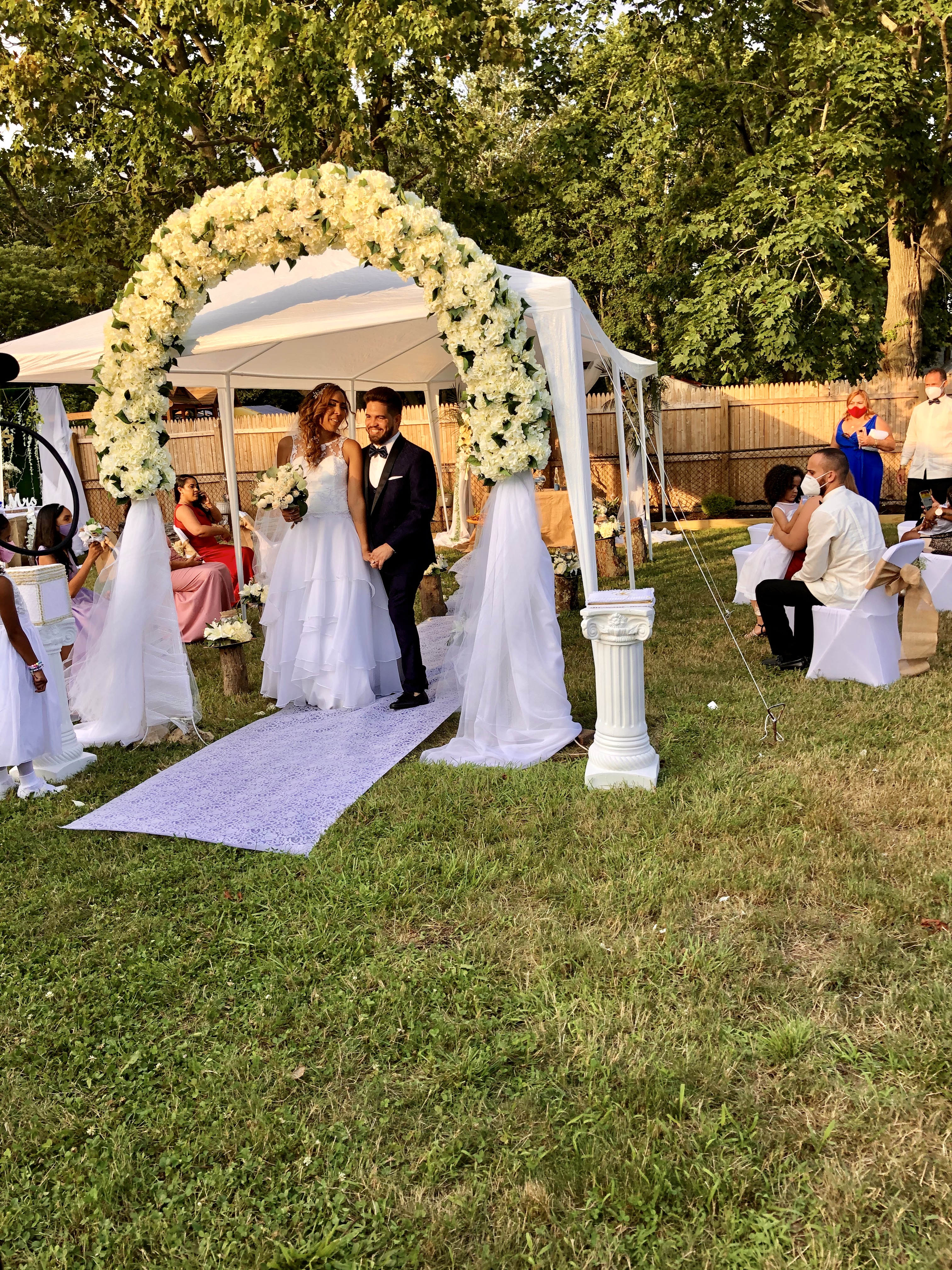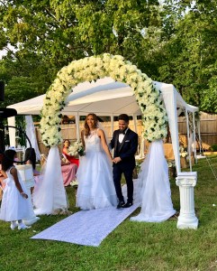 Llegó a Long Island el miercoles 22 y tenia cita en el town de Islip el 23 y para su sorpresa, le fue negada la licencia matrimonial. Favorablemente, el viernes 24 se dirigió a Oyster Bay y allí le otorgaron el documento necesario para poder casarse el sábado 25 de julio, en una fiesta que ya estaba organizada, a distancia, en todos sus detalles. El amor todo lo puede y la ceremonia fue hermosa, en un ambiente maravillosamente decorado. Un grupo de personas con buen humor, cuidando las distancias y usando mascaras durante toda la ceremonia. Posteriormente, pudieron disfrutar en union de familiares y amigos.