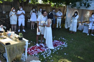 Todos los presentes estaban vestidos de blanco, a requerimiento de la pareja, y así era la decoración que desplegaba fotos y mini plantas en cada rincón del lugar. La ceremonia fue complementada por varios rituales que le dieron un toque único y especial. La campana del amor (creada por mi), lazo del amor infinito, la planta del amor (creada por mi), el cristal del amor (creado por mi), palabras de los padres, anillos, votos y todo con sonrisas y buen humor.