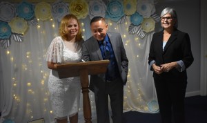 El salón estuvo decorado en blanco con detalles en rojo vino e incluimos varios de los rituales que le dan un toque de romance y espiritualidad al matrimonio. La novia fue entregada por su hijo de 15 años, Isaac, quien muy seriamente la llevó a manos del novio y le hizo una emotiva entrega.