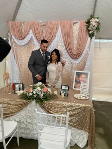 Al llegar al hogar de Maria y Carlos, para oficiar su ceremonia de bodas, las caras de los invitados, a pesar de tener mascaras, me parecían conocidas.  Al finalizar, pregunté y un joven me dijo: “usted me casó el año pasado, soy hermano de la novia por eso estamos los mismo” . Estas referencias me encantan porque significan que las parejas quedan contentas con sus eventos. Carlos y María, son ambos de El Salvador, tienen 20 años juntos y dos hijos adolescentes. Siguen enamorados y felices de formalizar su amor.