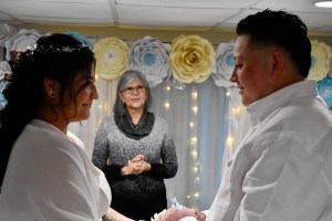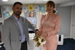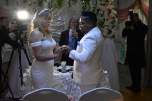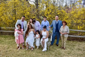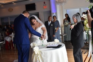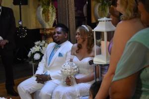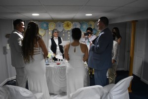 Sandy es de Guyana y Jefry de República Dominicana y han estado juntos desde hace once años. La boda estuvo planificada para abril 2020 y por la pandemia se fue cambiando hasta ser realizada en abril 2021. Desde los inicios, mis conversaciones fueron con el novio, quien es perfectamente bilingüe. A pocos días antes de la boda, hice video llamada con ambos y la novia me dice: “yo no hablo español”. Usualmente, mis bodas son en mi idioma; sin embargo, ya no había tiempo de hacer cambios de oficiantes así que los complací haciendo una boda bilingüe para que ambas familias comprendieran la ceremonia.