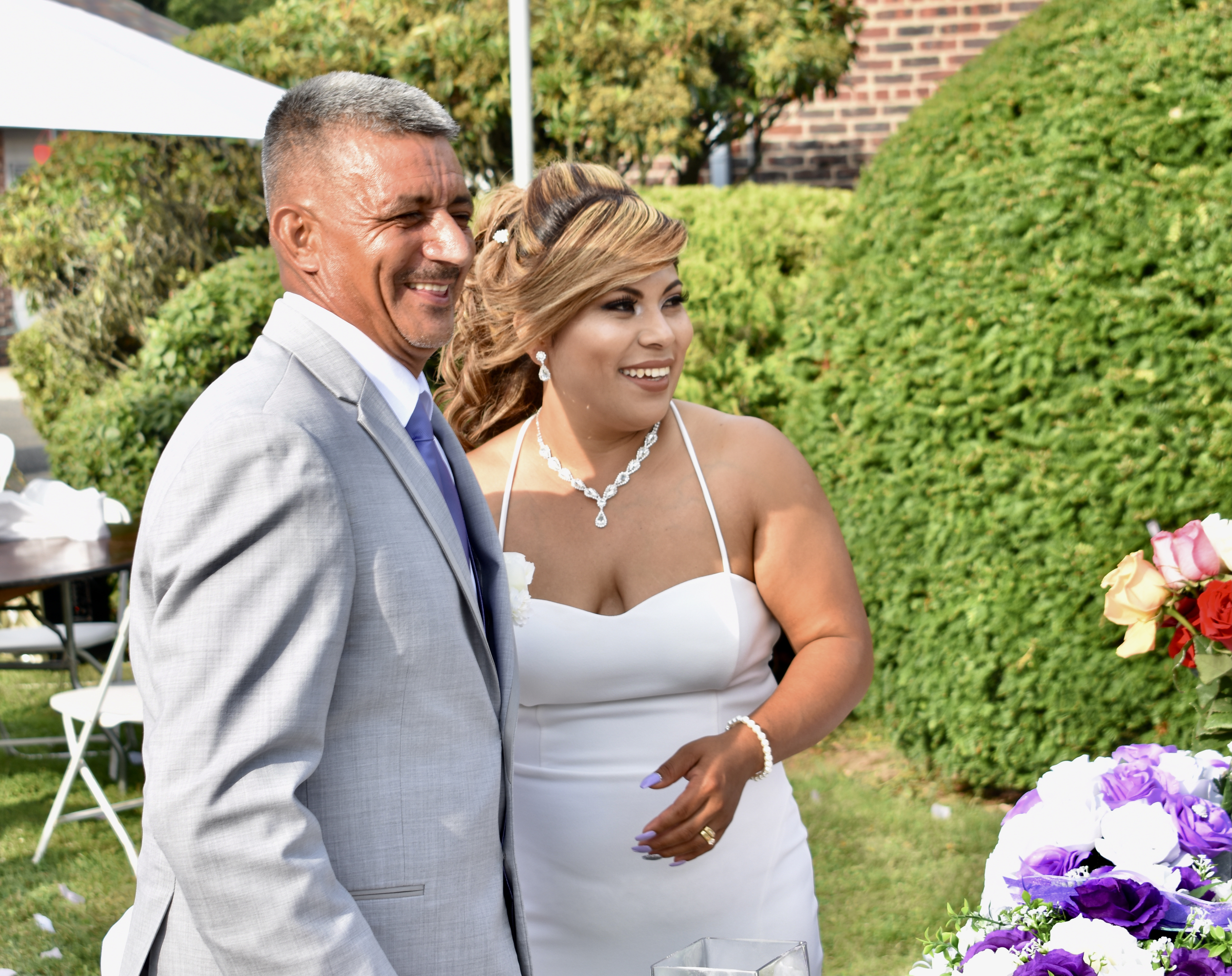 Nolvia y José, son ambos de Honduras y tienen 19 años juntos. Su amor ha florecido en tres hijos de 16, 13 y 9 años de edad. La decoración era blanca con tonos lila y estaba en el jardin del hogar de la familia. Todo lindamente preparado y para sellar esa unión, hicimos mi versión del ritual de las rosas de amor. Participaron todos los presentes y fueron momentos de emoción que ninguno de ellos va a olvidar.