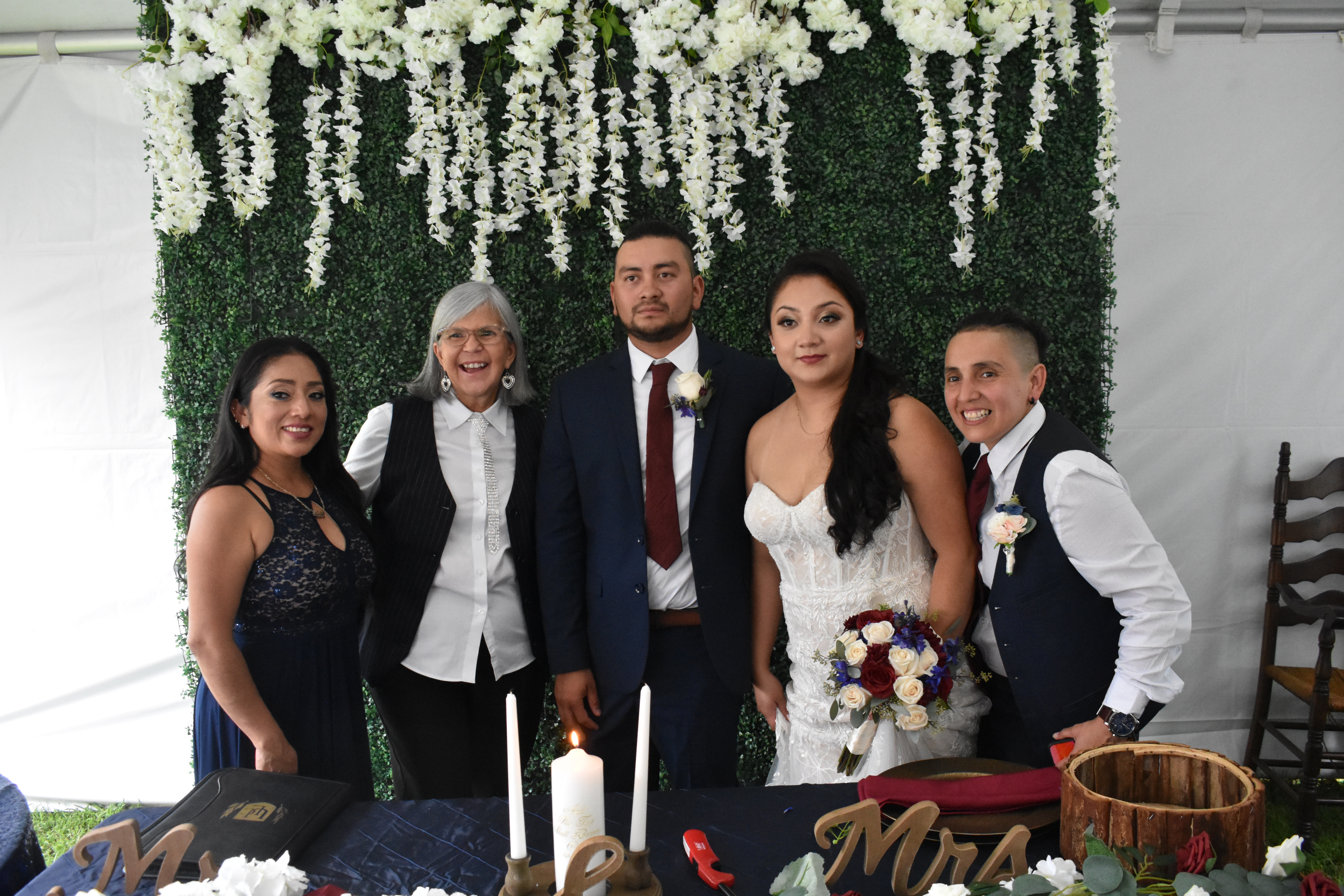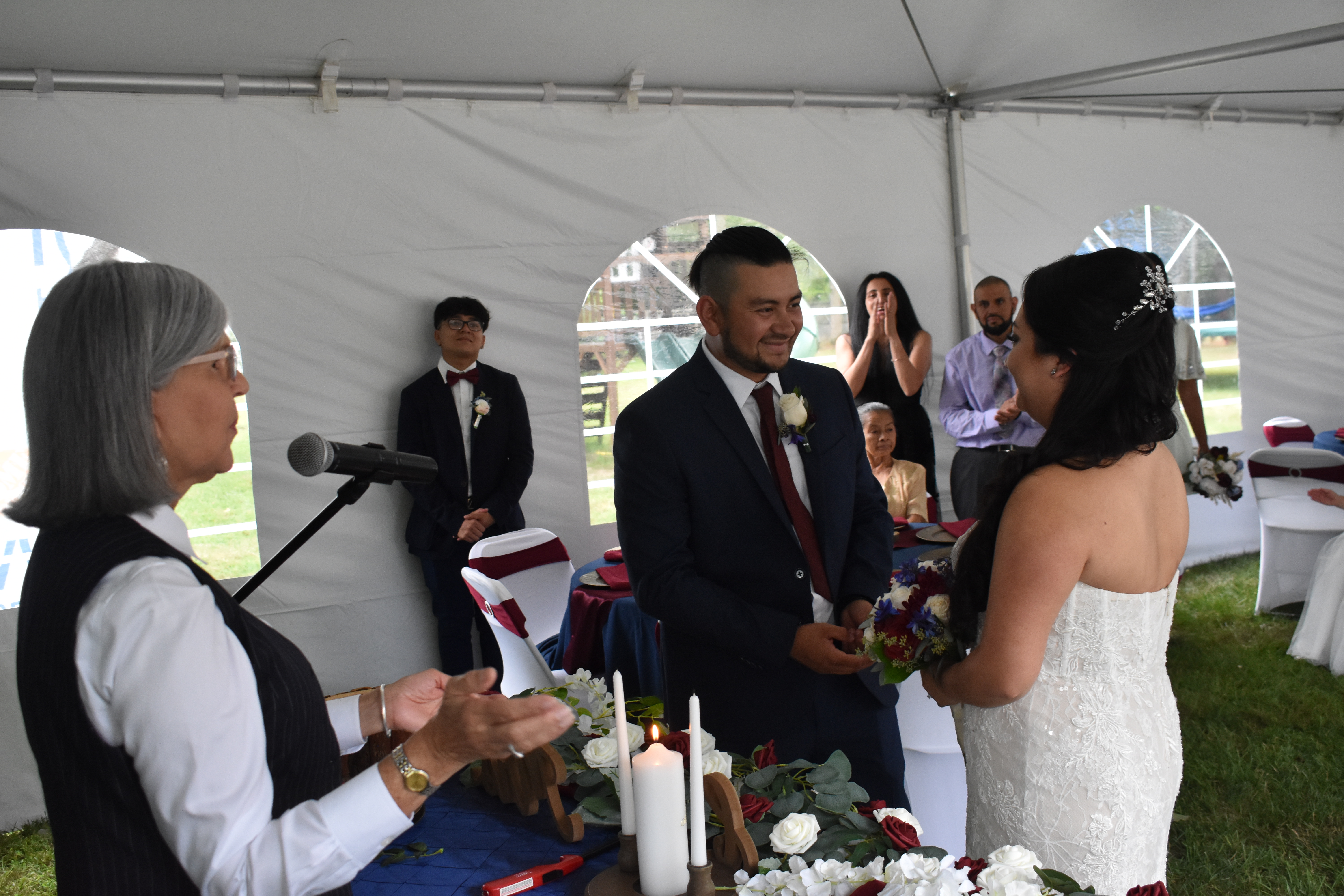 Regina y Jonathan son de El Salvador. Se conocieron en Long Island, estudiando bachillerato y recordando ese momento, la novia dice: “el me enamoró”. El amor se les nota en miradas y gestos tiernos que tienen el uno con el otro. Hace dos años tuve el placer de casar a la madre de Regina y ahora fue un honor compartir nuevamente con el grupo familiar. Apenas terminó la ceremonia, comenzó a llover. Las personas mayores se quedaron en la carpa, mientras que los jóvenes novios se quitaron los zapatos y acompañados de sus amistades, bailaron y disfrutaron bajo la lluvia. Como dicen en algunos países; cuando llueve en una boda, la pareja esta siendo bendecida con agua celestial.