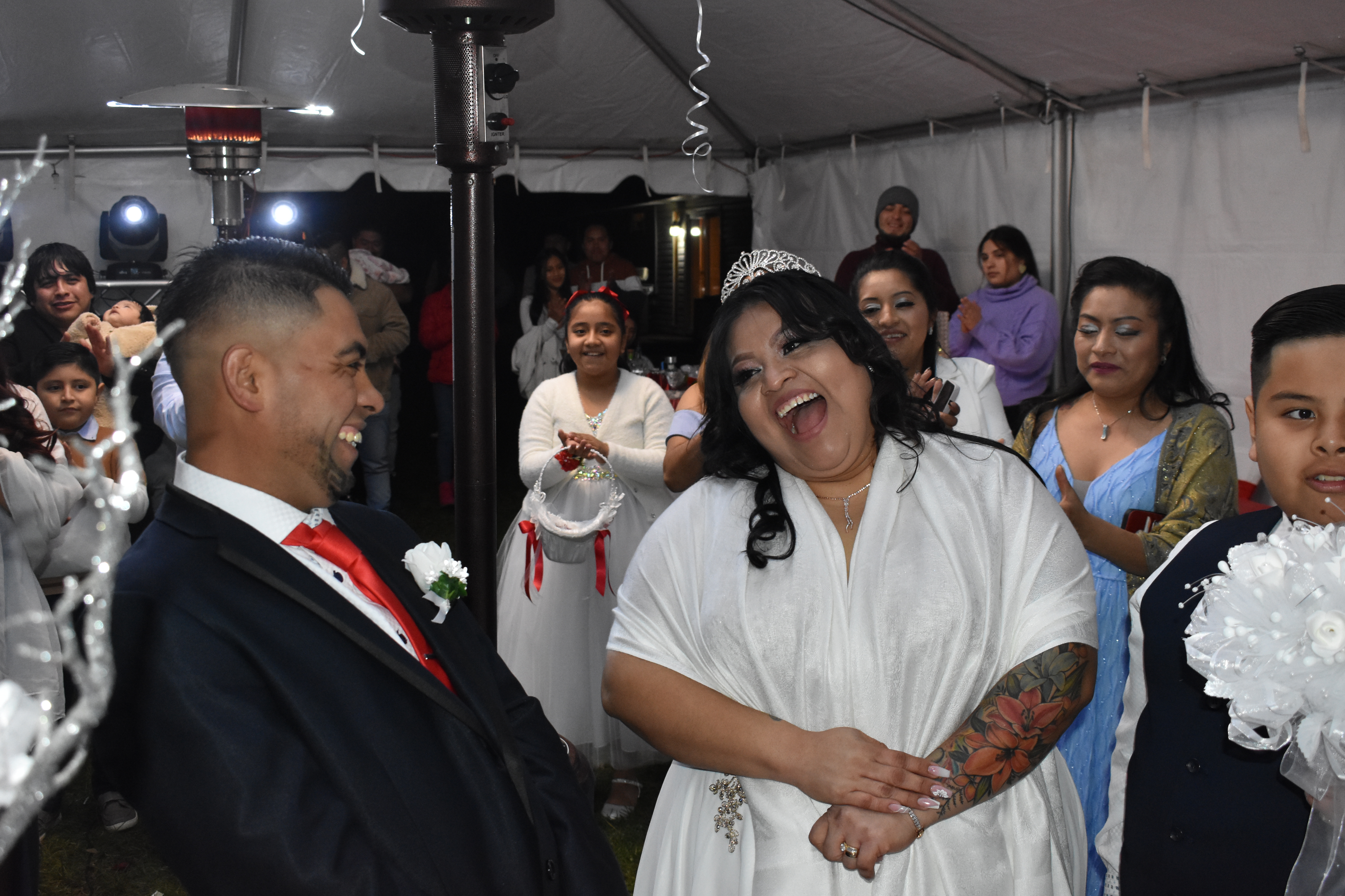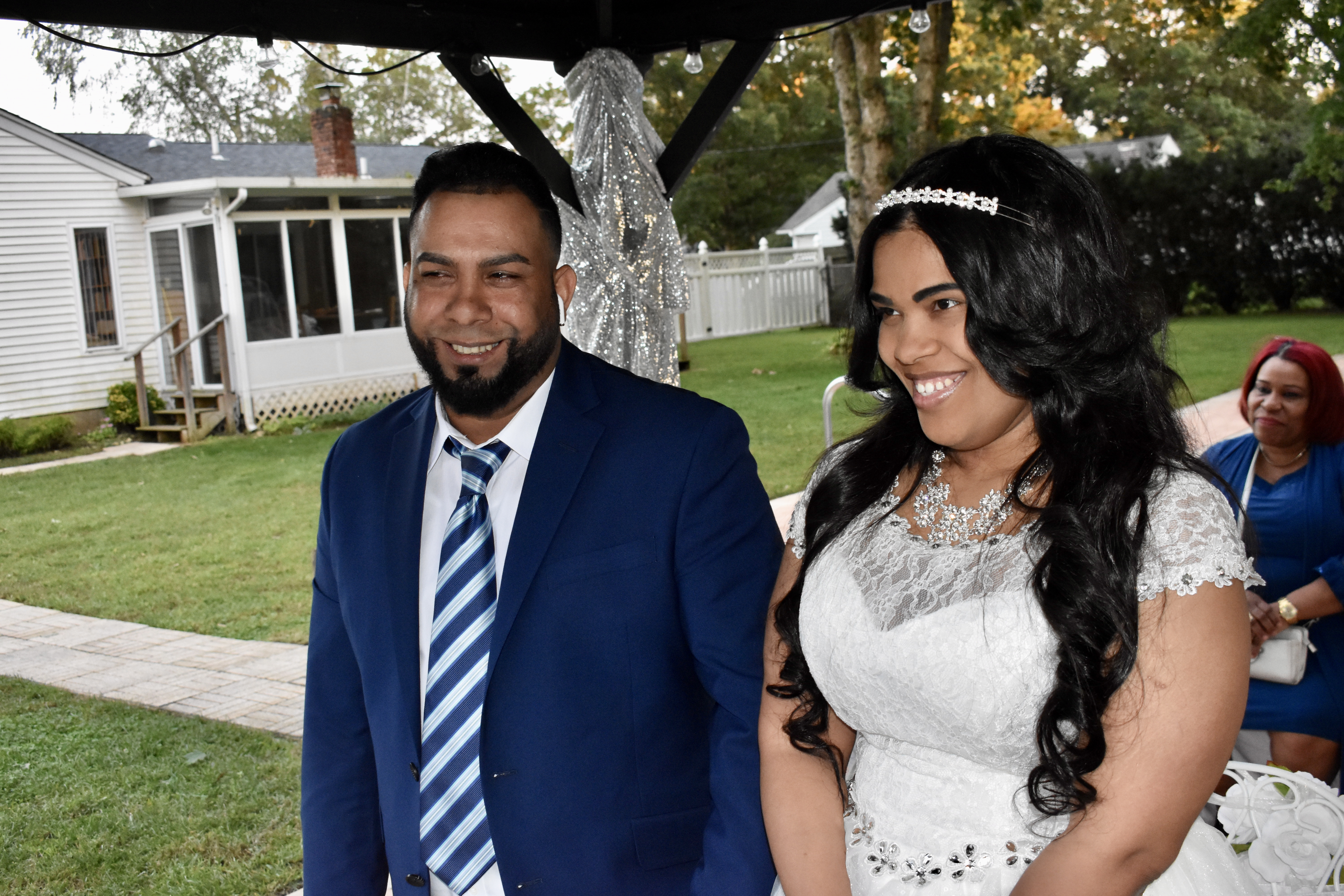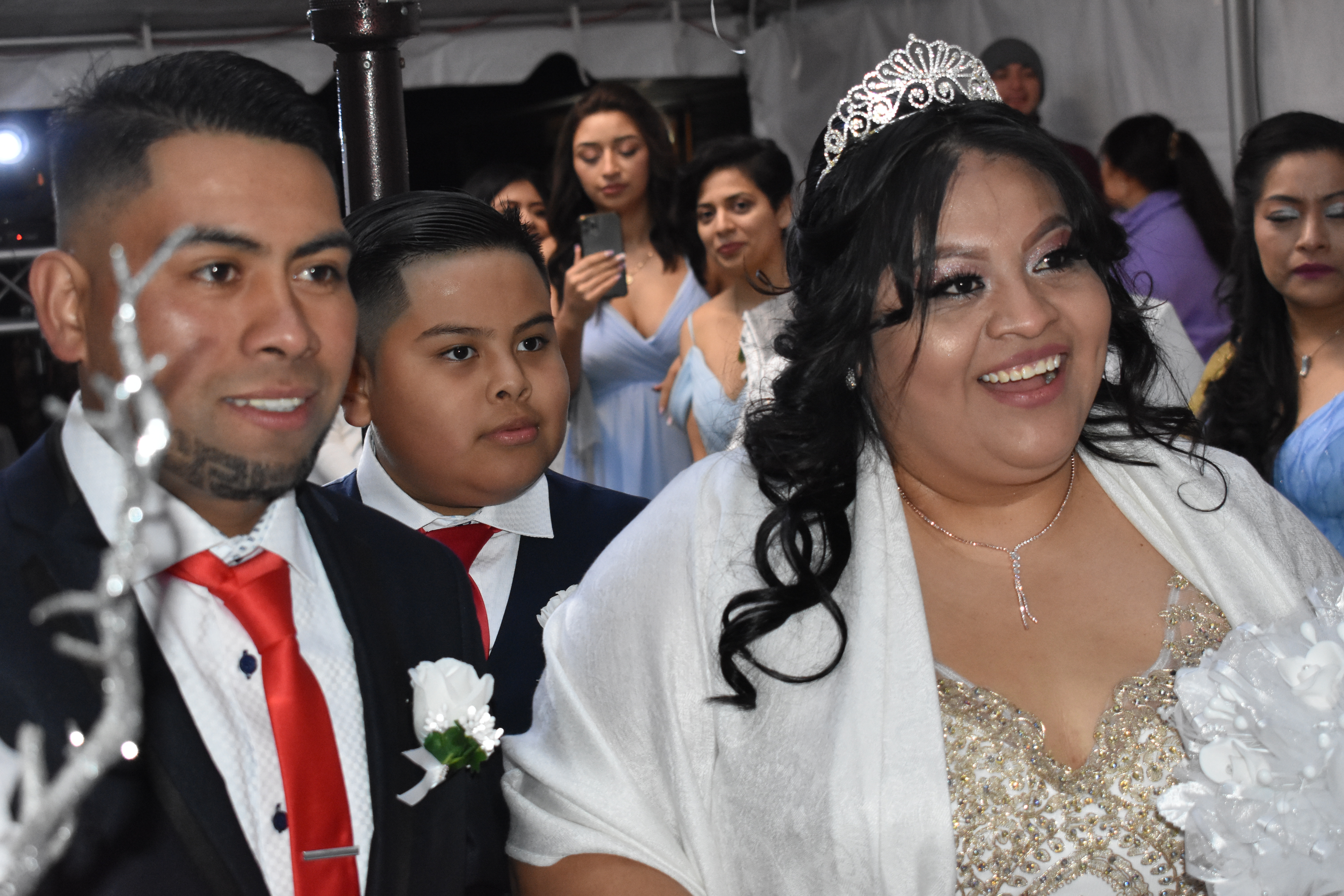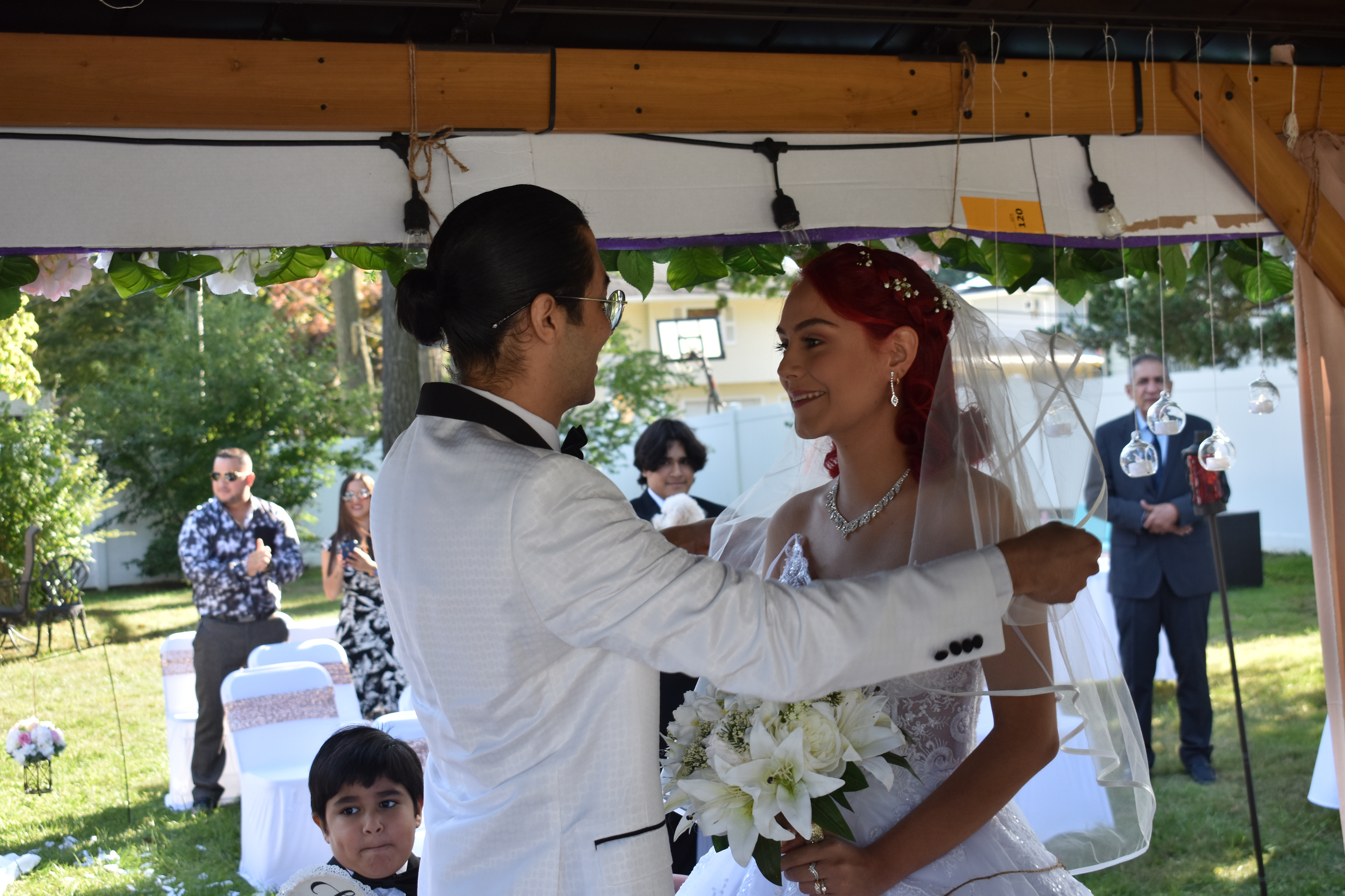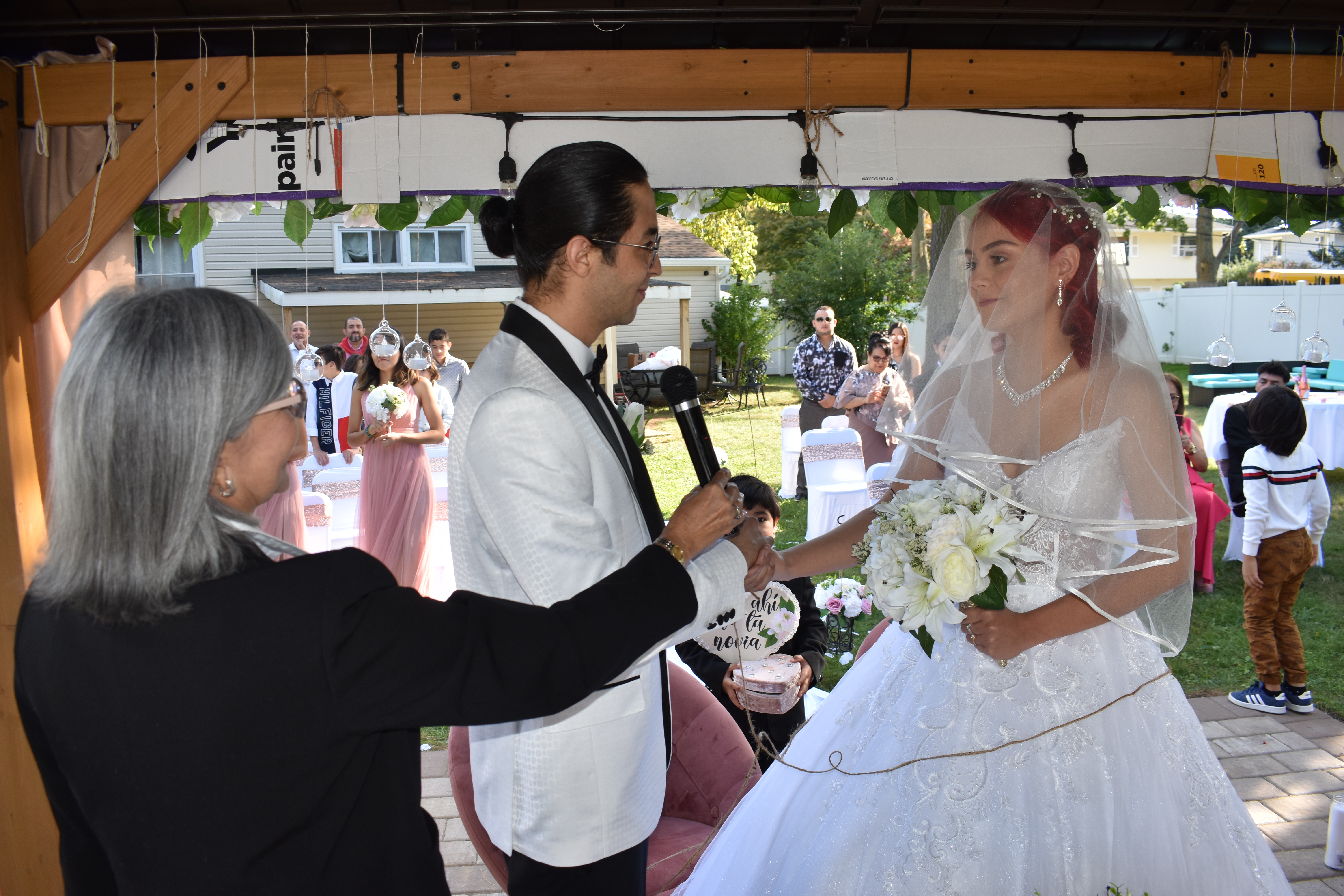 Andrea y Fabian, crecieron en el mismo barrio, en Colombia. Están juntos como pareja, desde que tenian 11 y 14 años de edad, respectivamente. Tienen dos perritos que formaron parte del cortejo. La decoración tenia tonos rosa viejo y habían detalles de su amor en cada rincón del jardín. Los padres de ambos estuvieron presentes, así como un grupo de familiares y amigos. Para el ritual del lazo, la novia, divertidamente, en lugar de usar el tradicional, hizo que su madre les uniera con un mecatillo, lo cual dio un toque diferente y simpático al momento. La boda fue el 2 de octubre, 2021.