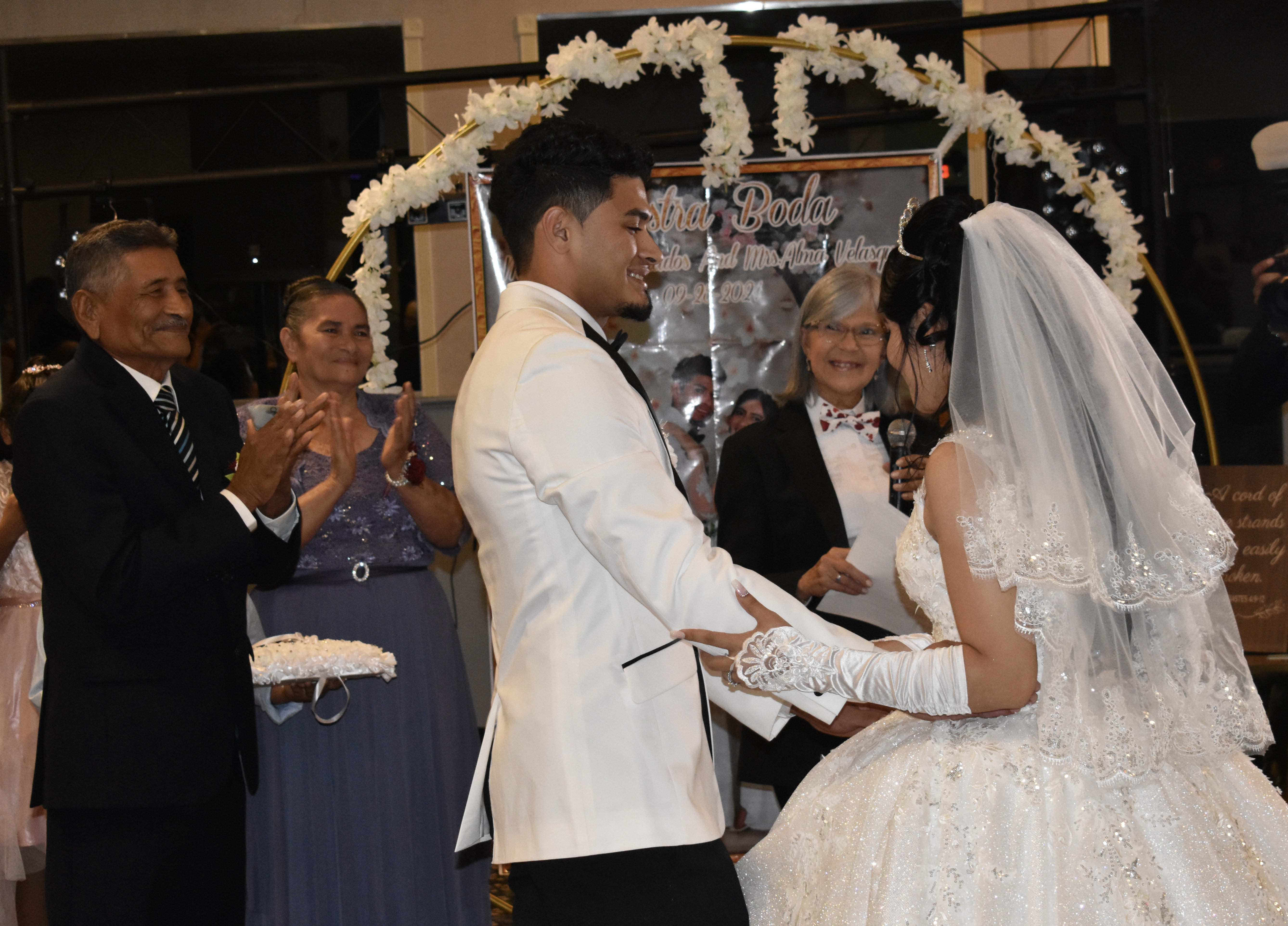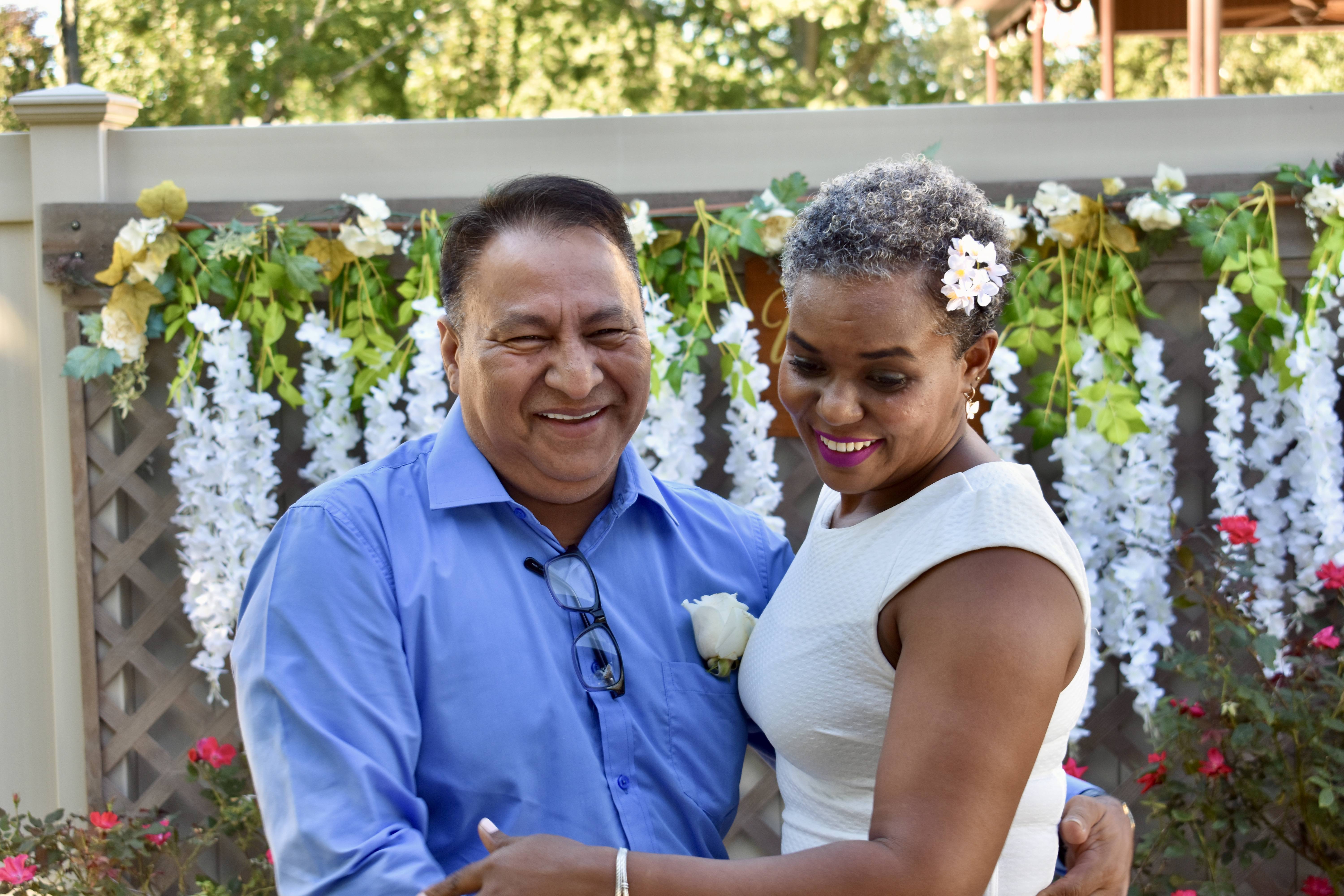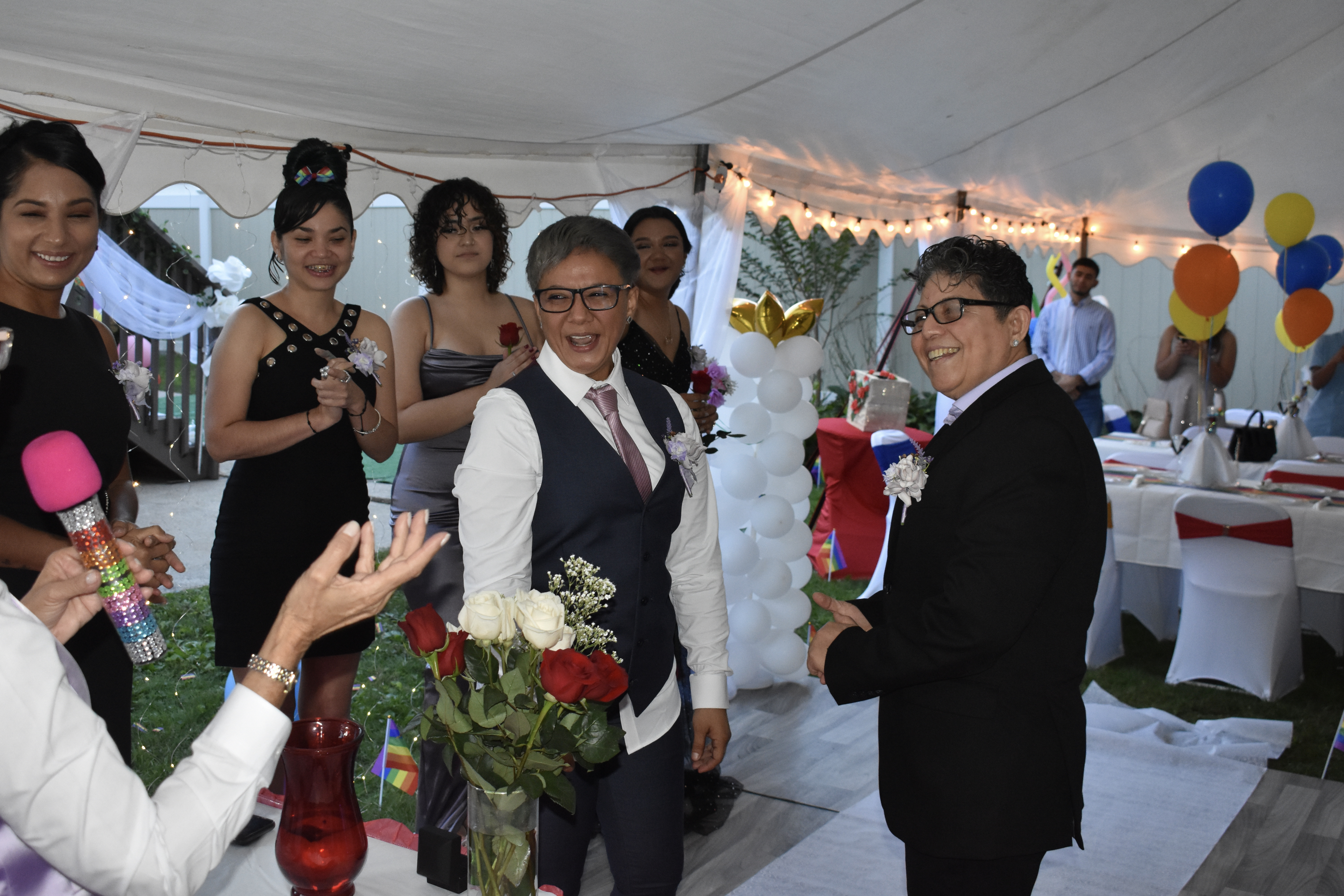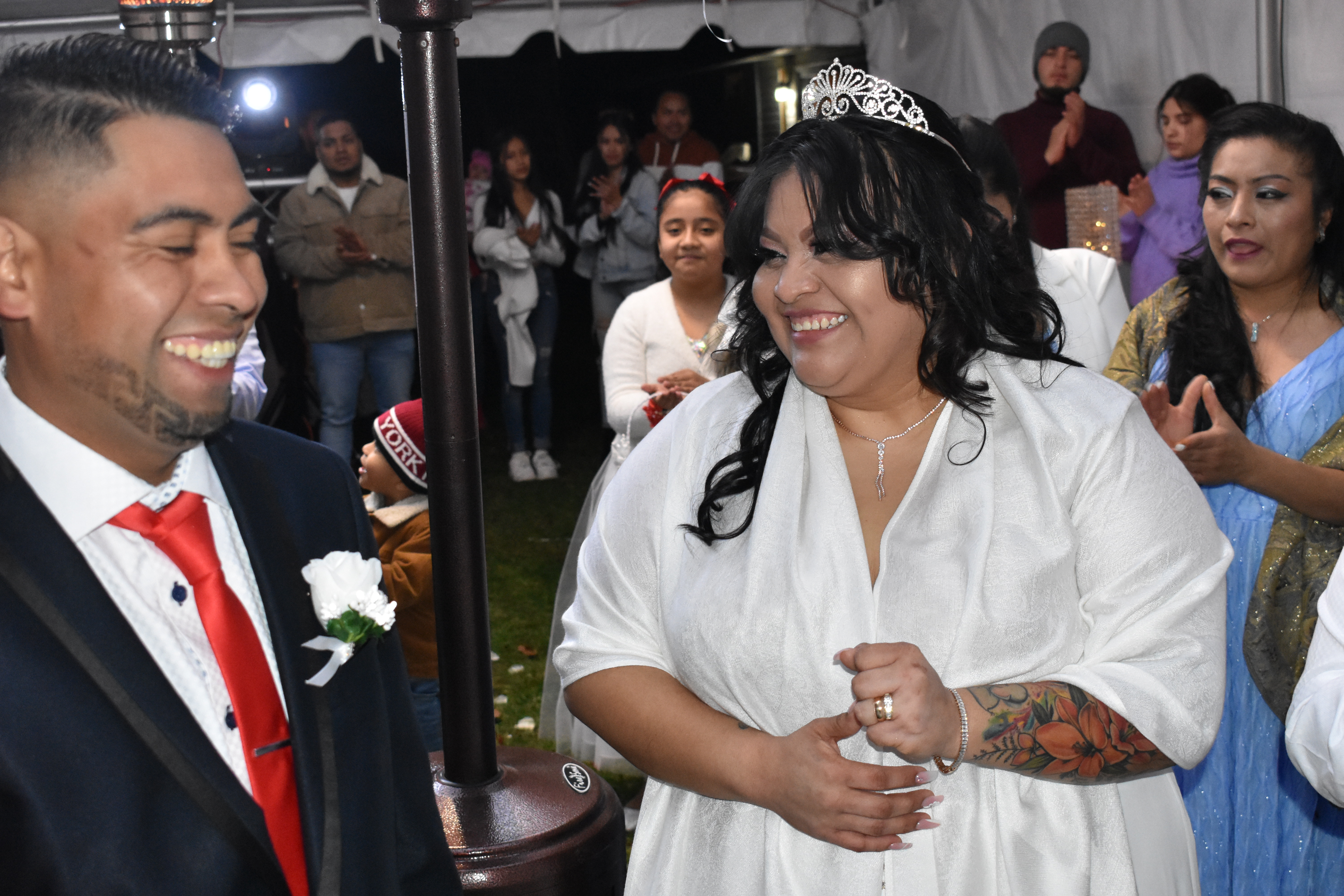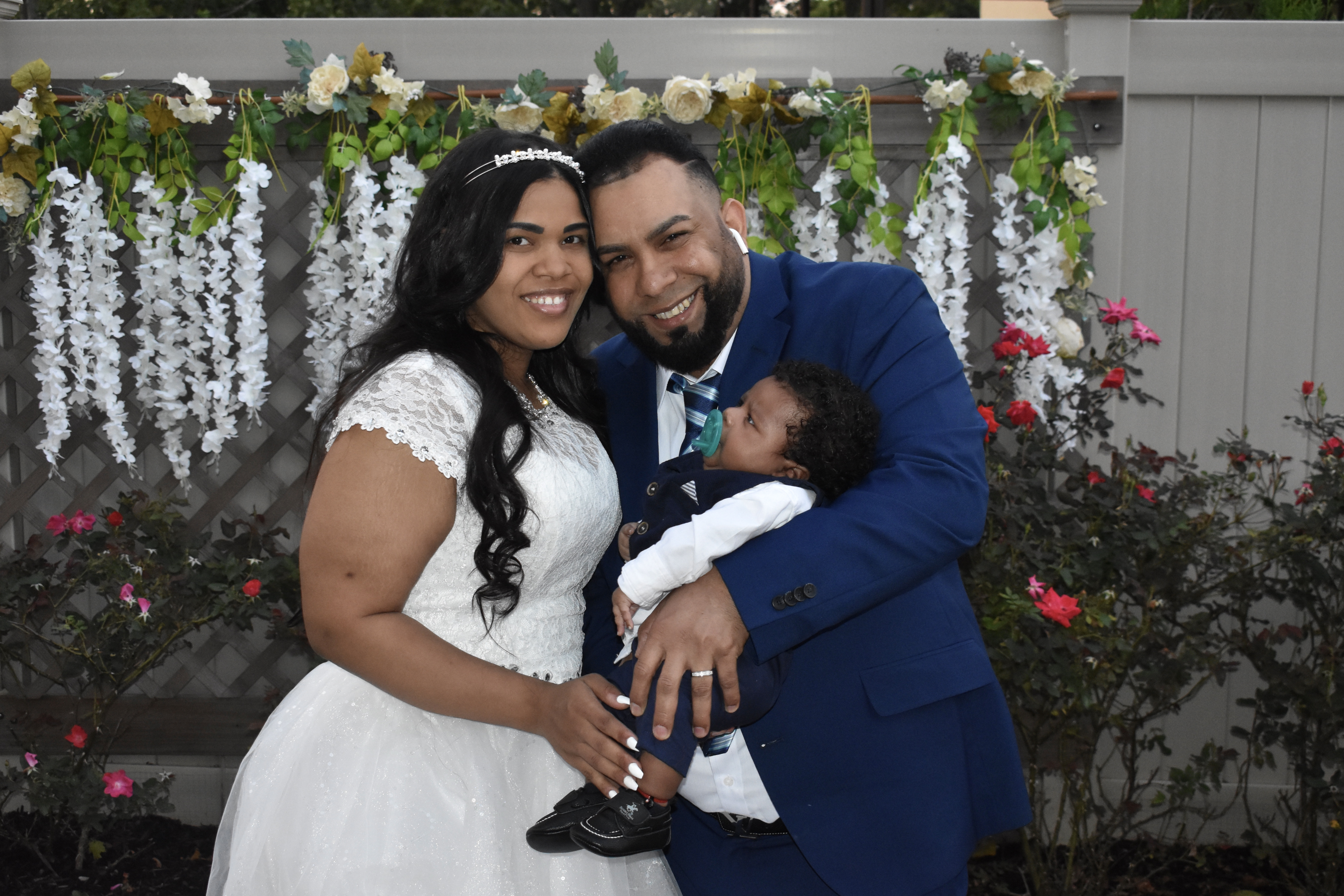 Andrea y Fabian, crecieron en el mismo barrio, en Colombia. Están juntos como pareja, desde que tenian 11 y 14 años de edad, respectivamente. Tienen dos perritos que formaron parte del cortejo. La decoración tenia tonos rosa viejo y habían detalles de su amor en cada rincón del jardín. Los padres de ambos estuvieron presentes, así como un grupo de familiares y amigos. Para el ritual del lazo, la novia, divertidamente, en lugar de usar el tradicional, hizo que su madre les uniera con un mecatillo, lo cual dio un toque diferente y simpático al momento. La boda fue el 2 de octubre, 2021.