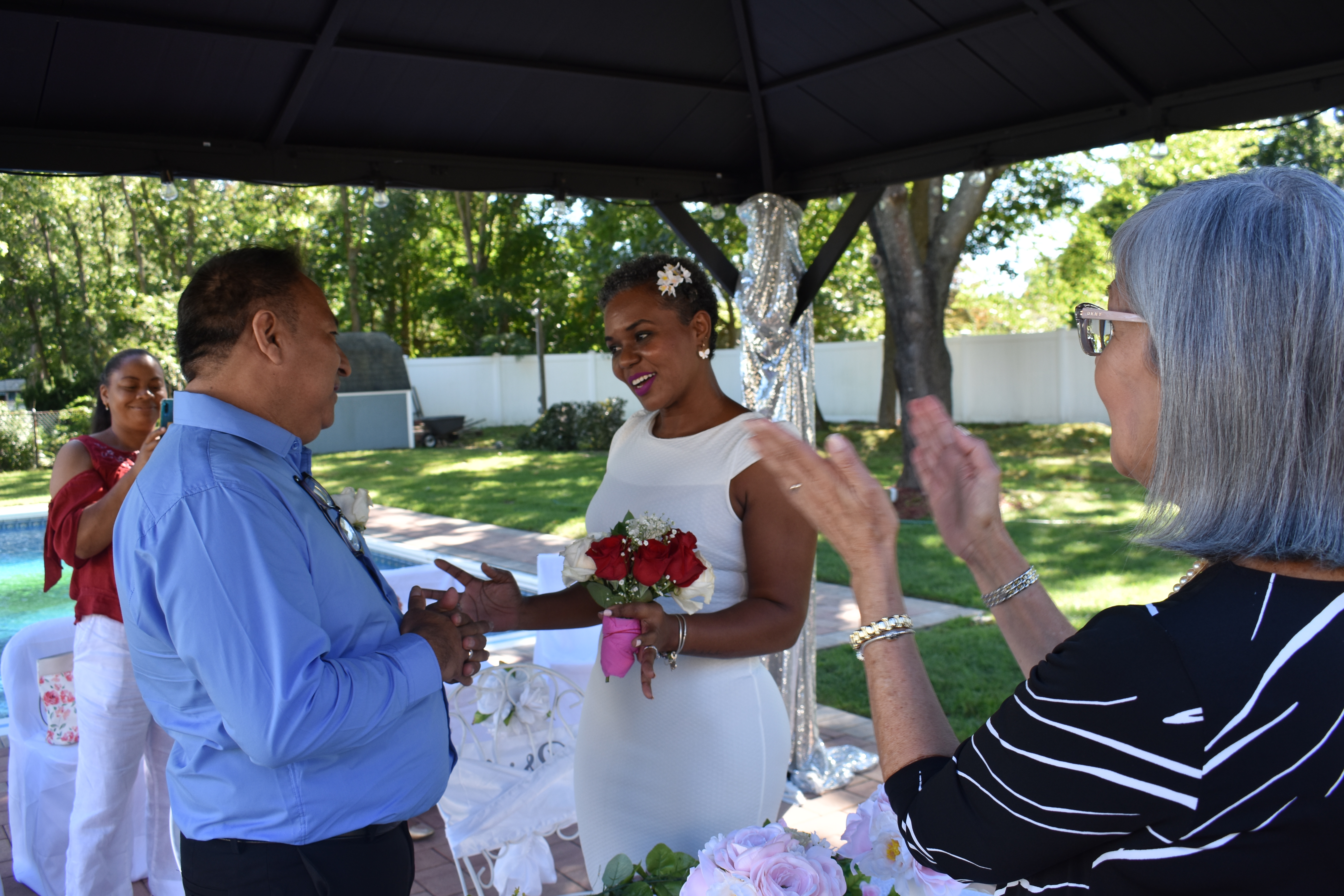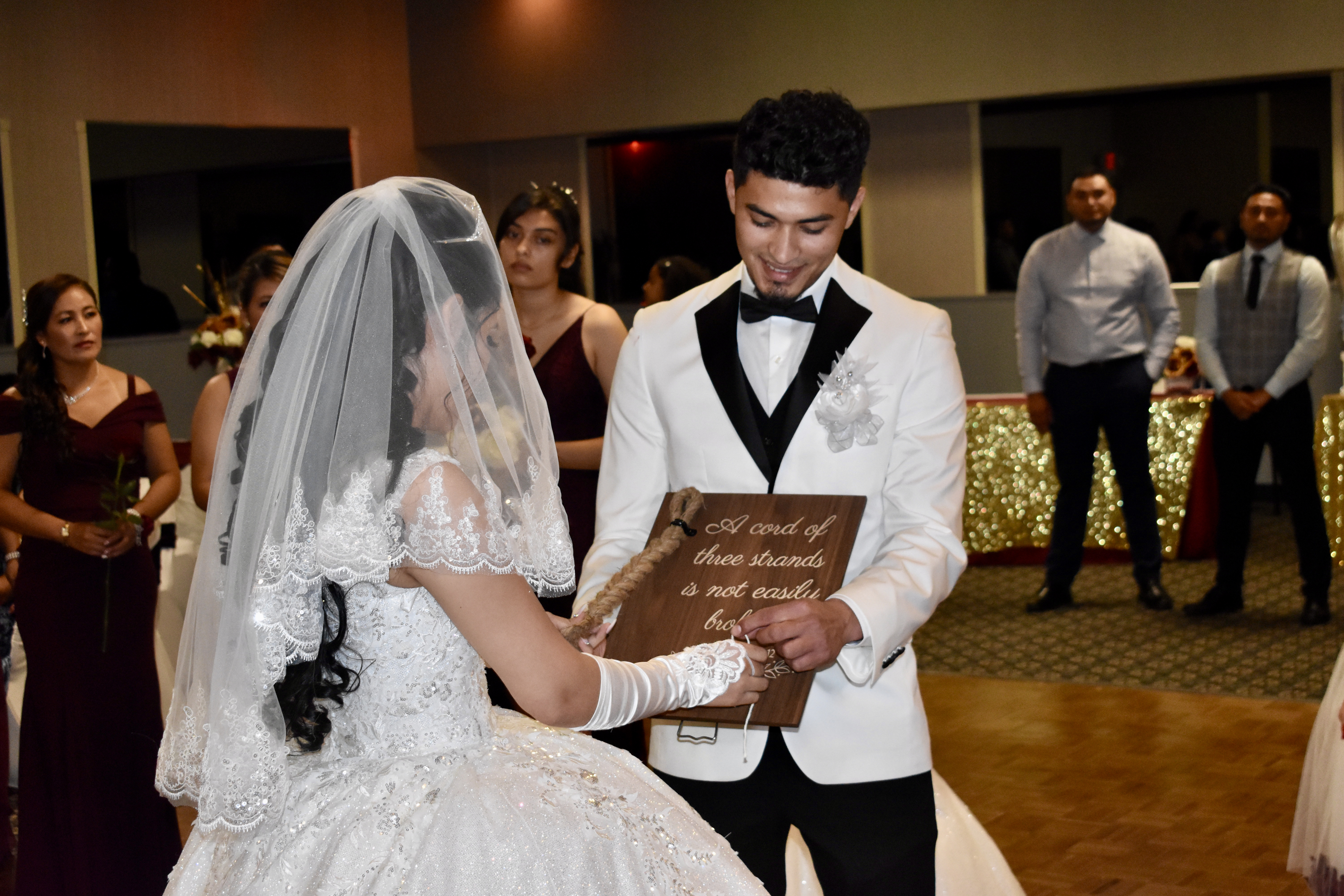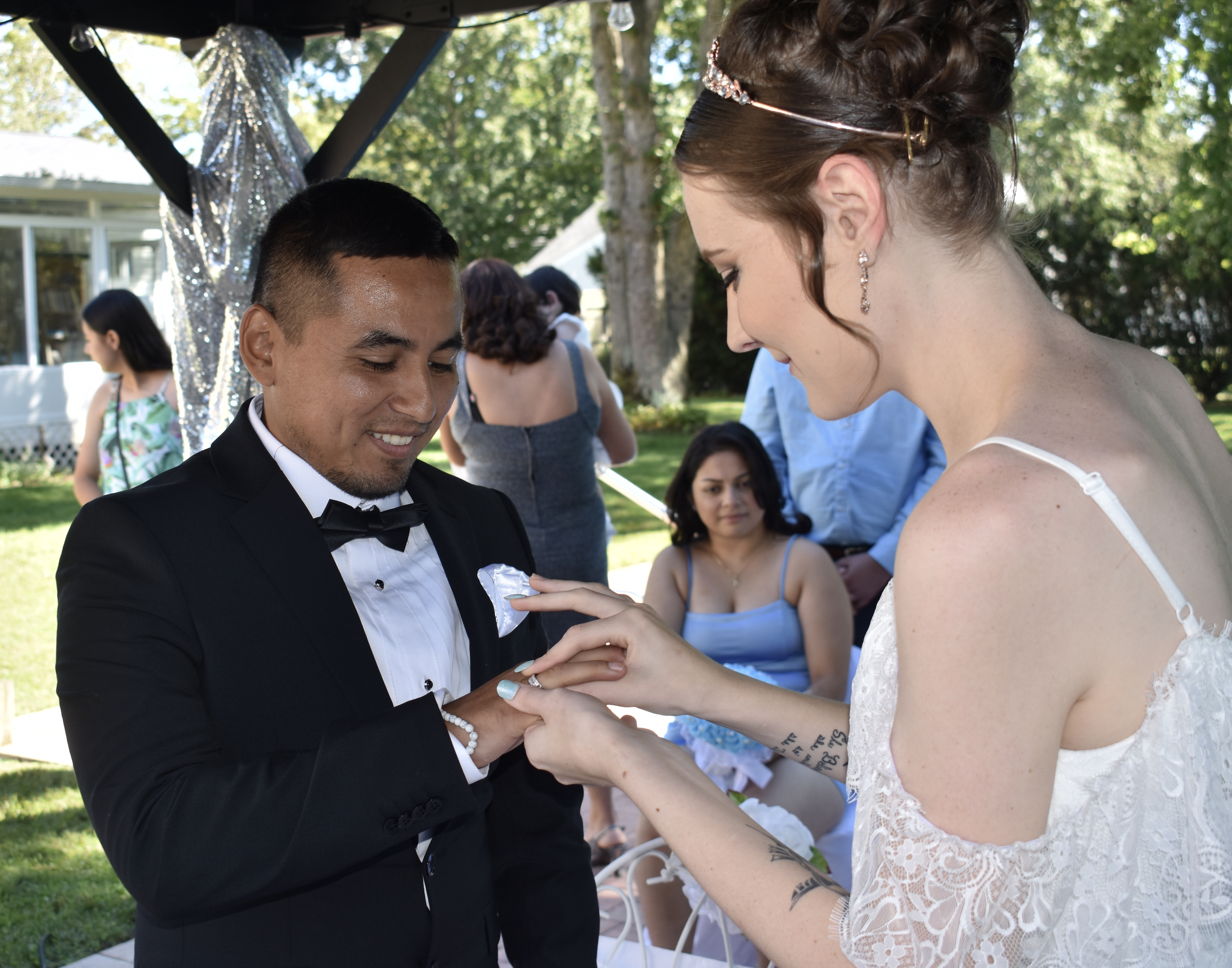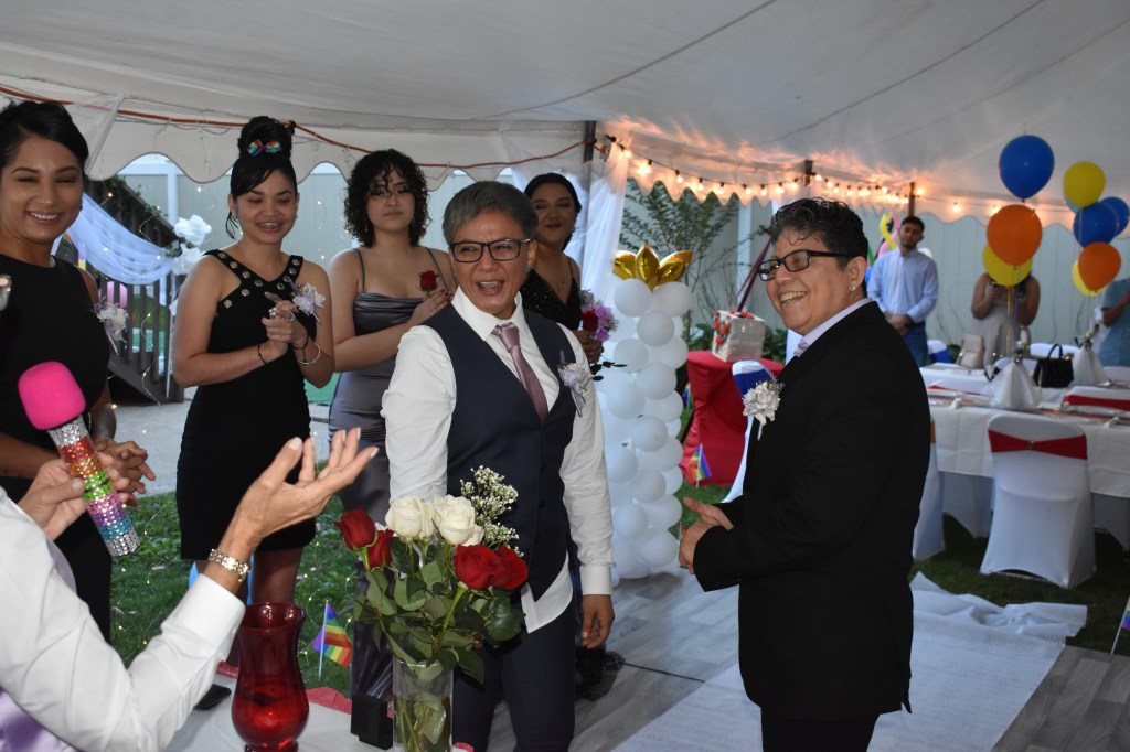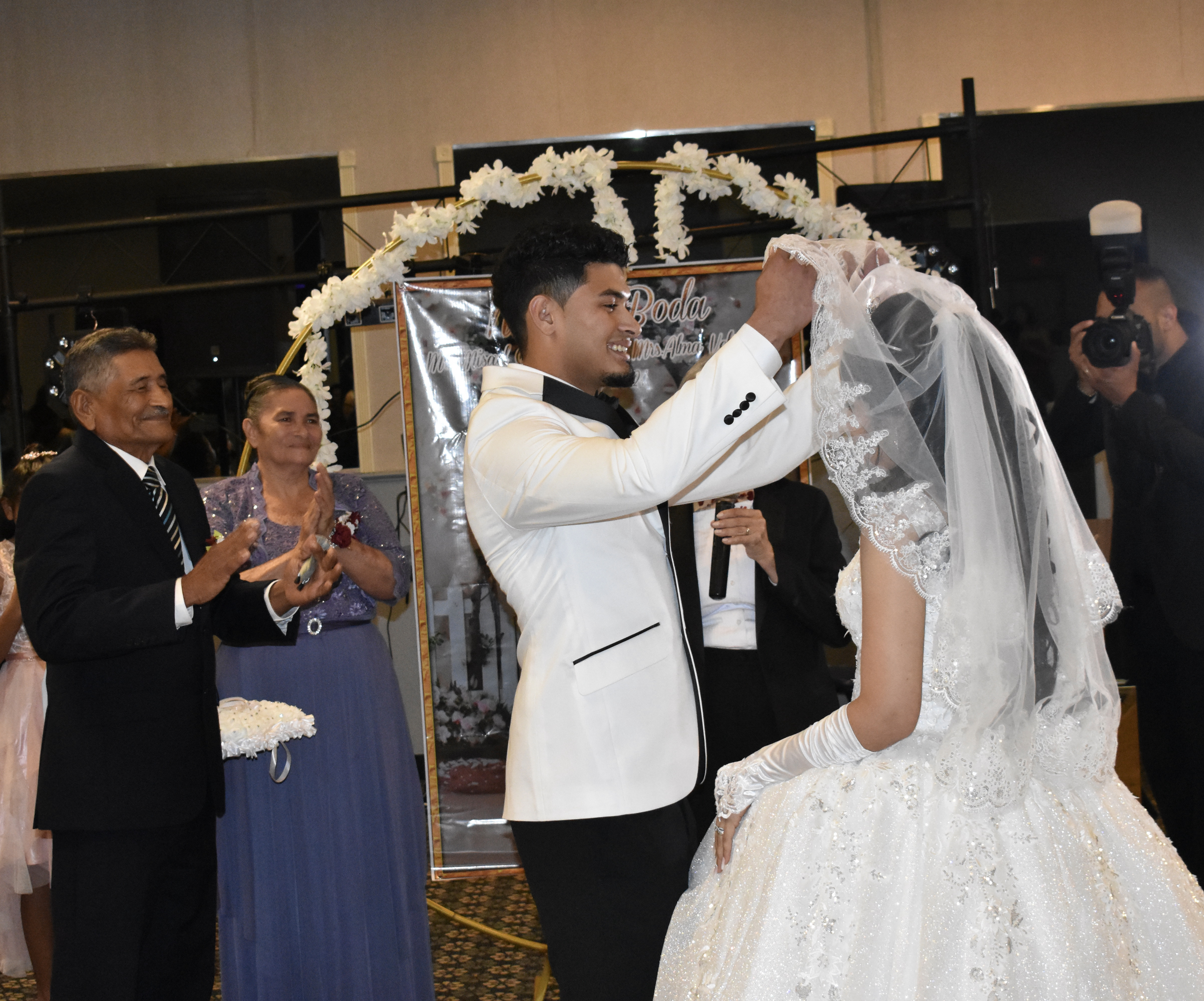 Andrea y Fabian, crecieron en el mismo barrio, en Colombia. Están juntos como pareja, desde que tenian 11 y 14 años de edad, respectivamente. Tienen dos perritos que formaron parte del cortejo. La decoración tenia tonos rosa viejo y habían detalles de su amor en cada rincón del jardín. Los padres de ambos estuvieron presentes, así como un grupo de familiares y amigos. Para el ritual del lazo, la novia, divertidamente, en lugar de usar el tradicional, hizo que su madre les uniera con un mecatillo, lo cual dio un toque diferente y simpático al momento. La boda fue el 2 de octubre, 2021.