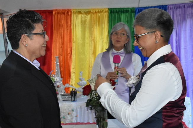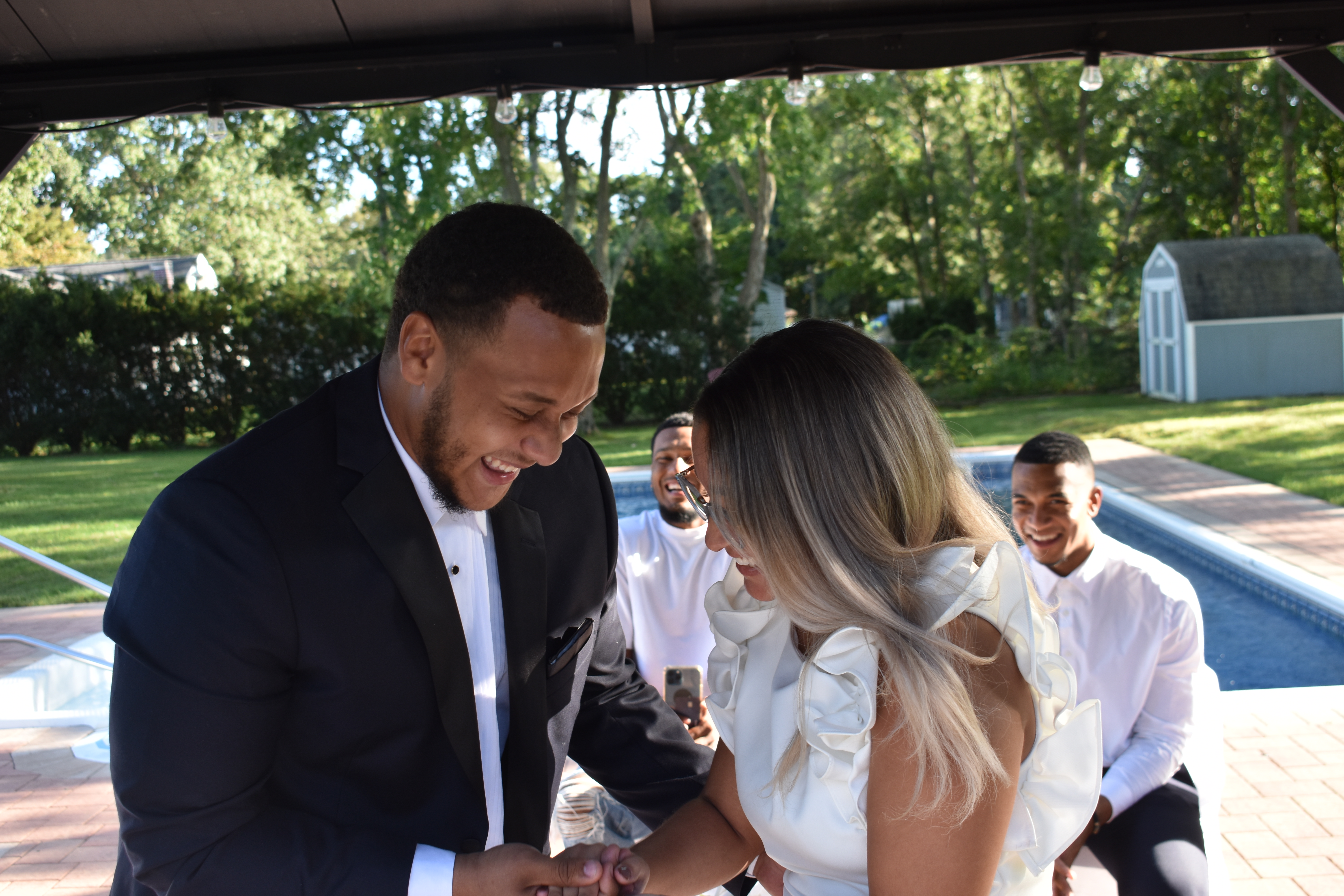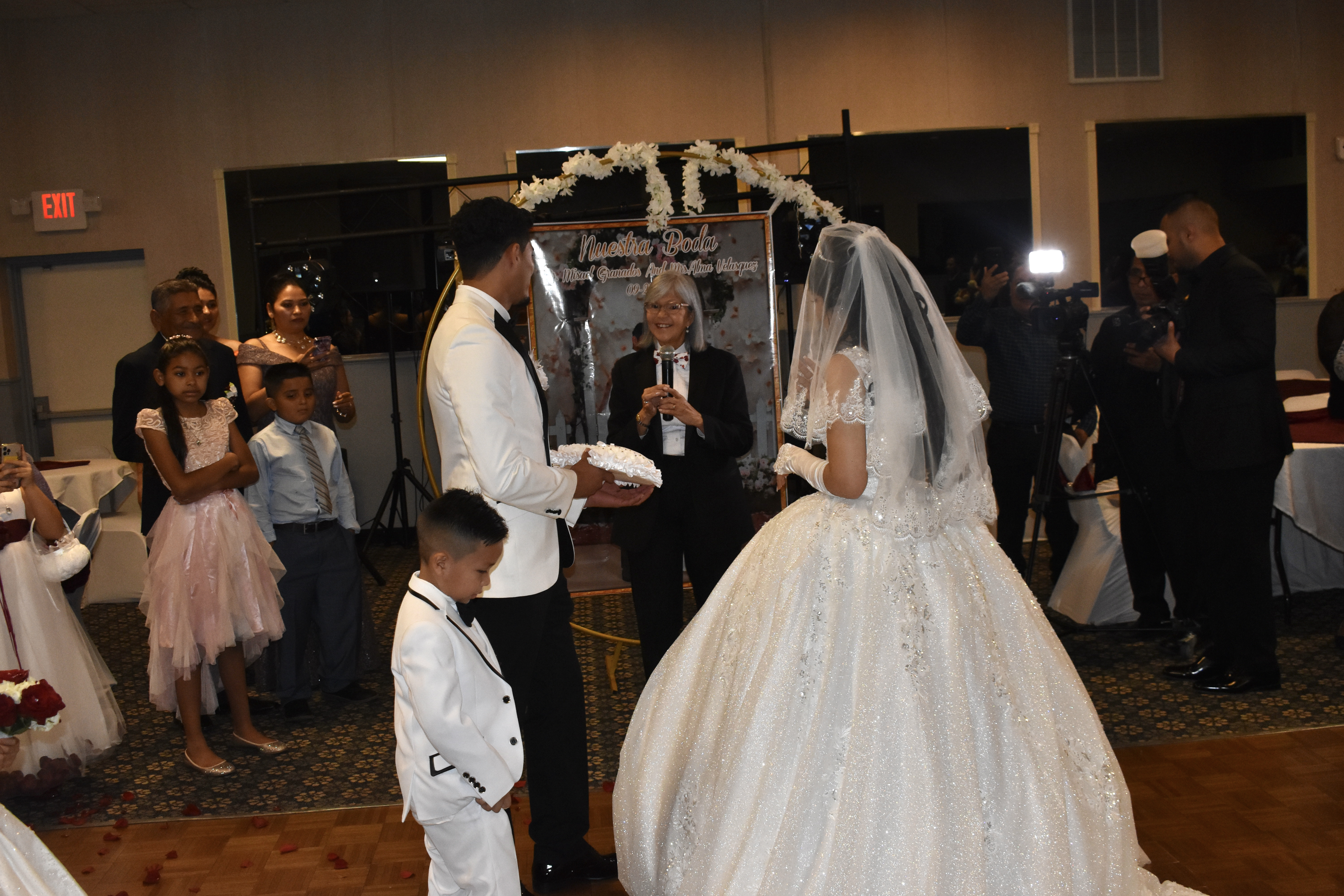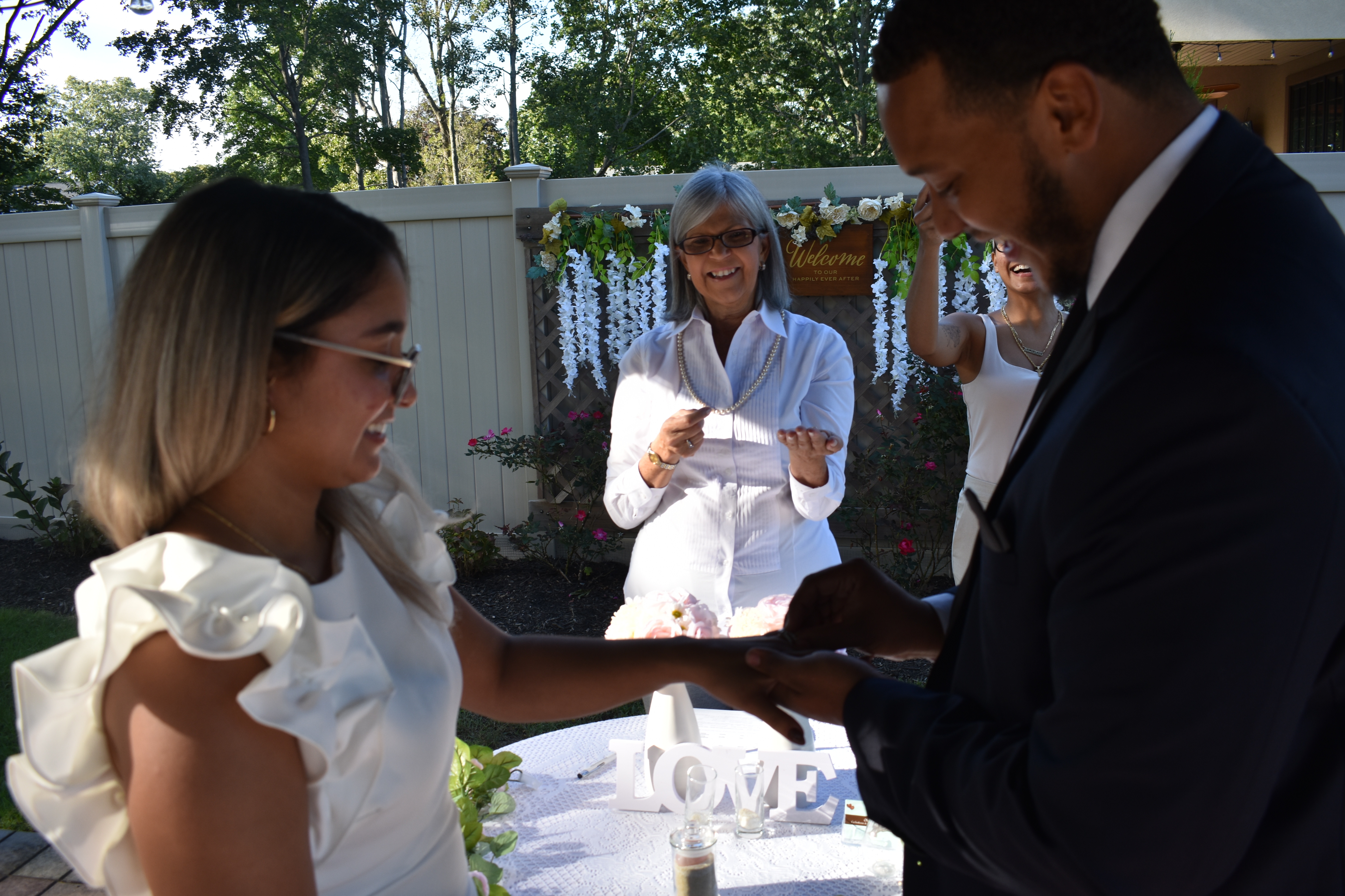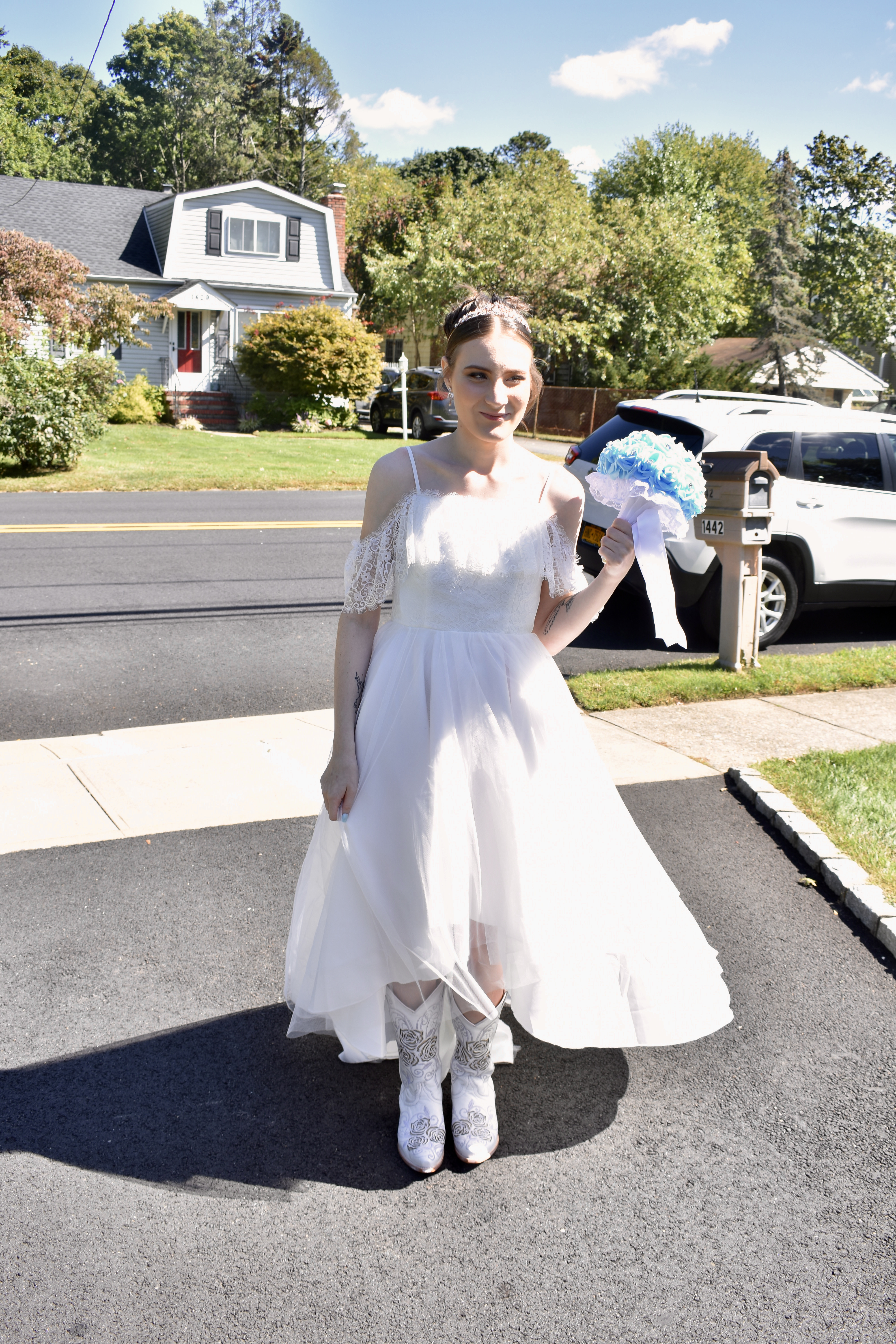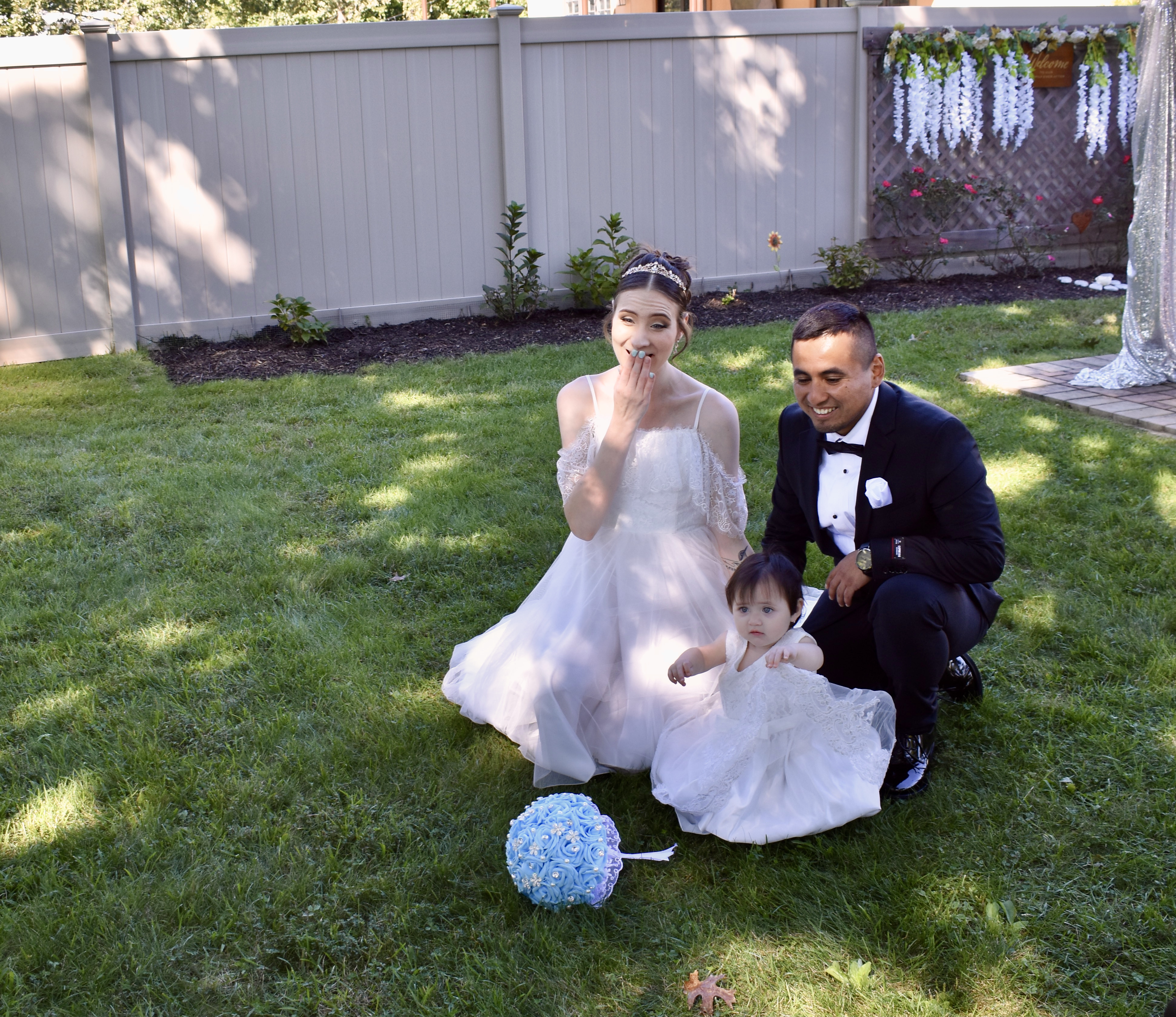 Andrea y Fabian, crecieron en el mismo barrio, en Colombia. Están juntos como pareja, desde que tenian 11 y 14 años de edad, respectivamente. Tienen dos perritos que formaron parte del cortejo. La decoración tenia tonos rosa viejo y habían detalles de su amor en cada rincón del jardín. Los padres de ambos estuvieron presentes, así como un grupo de familiares y amigos. Para el ritual del lazo, la novia, divertidamente, en lugar de usar el tradicional, hizo que su madre les uniera con un mecatillo, lo cual dio un toque diferente y simpático al momento. La boda fue el 2 de octubre, 2021.