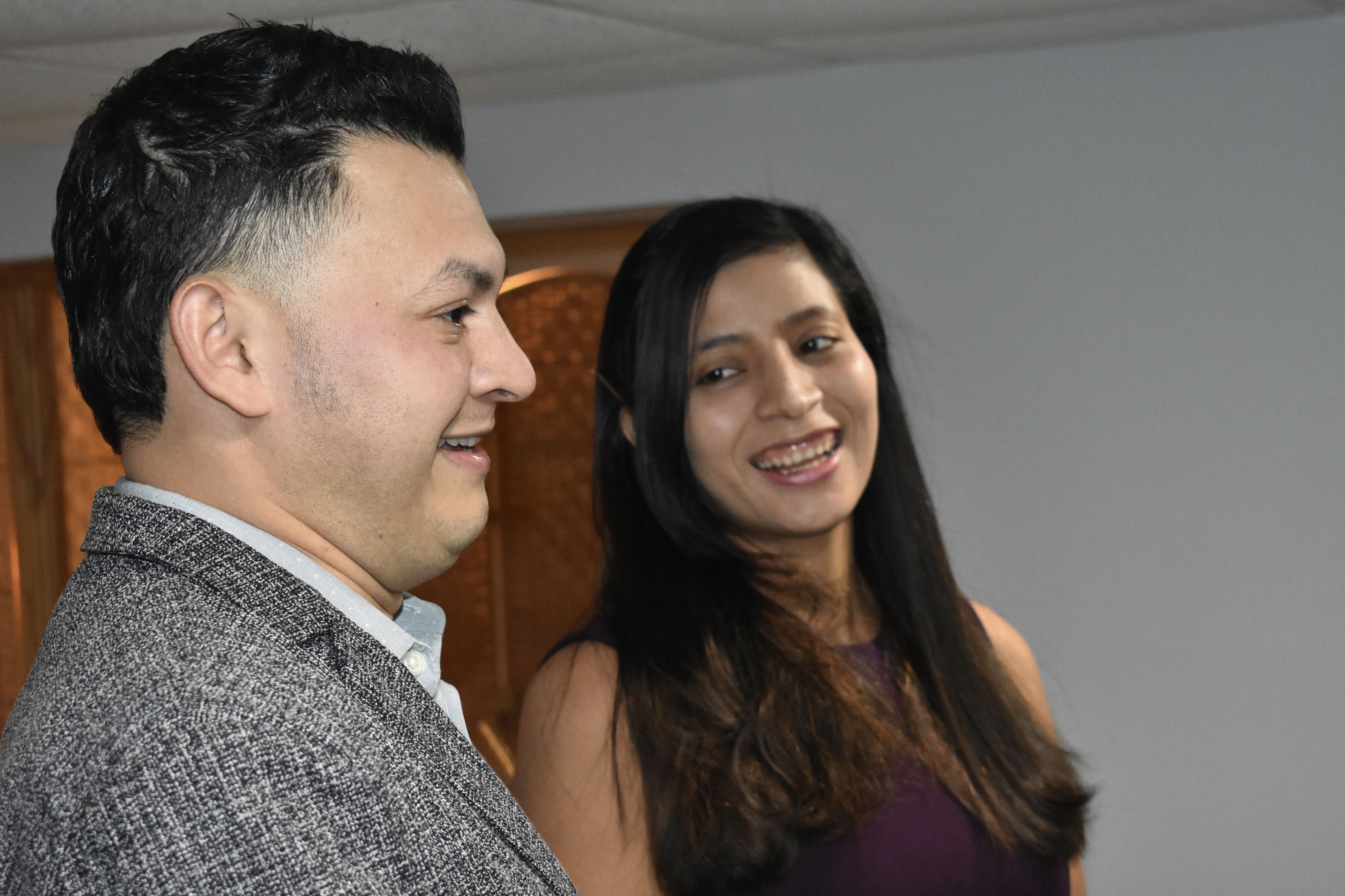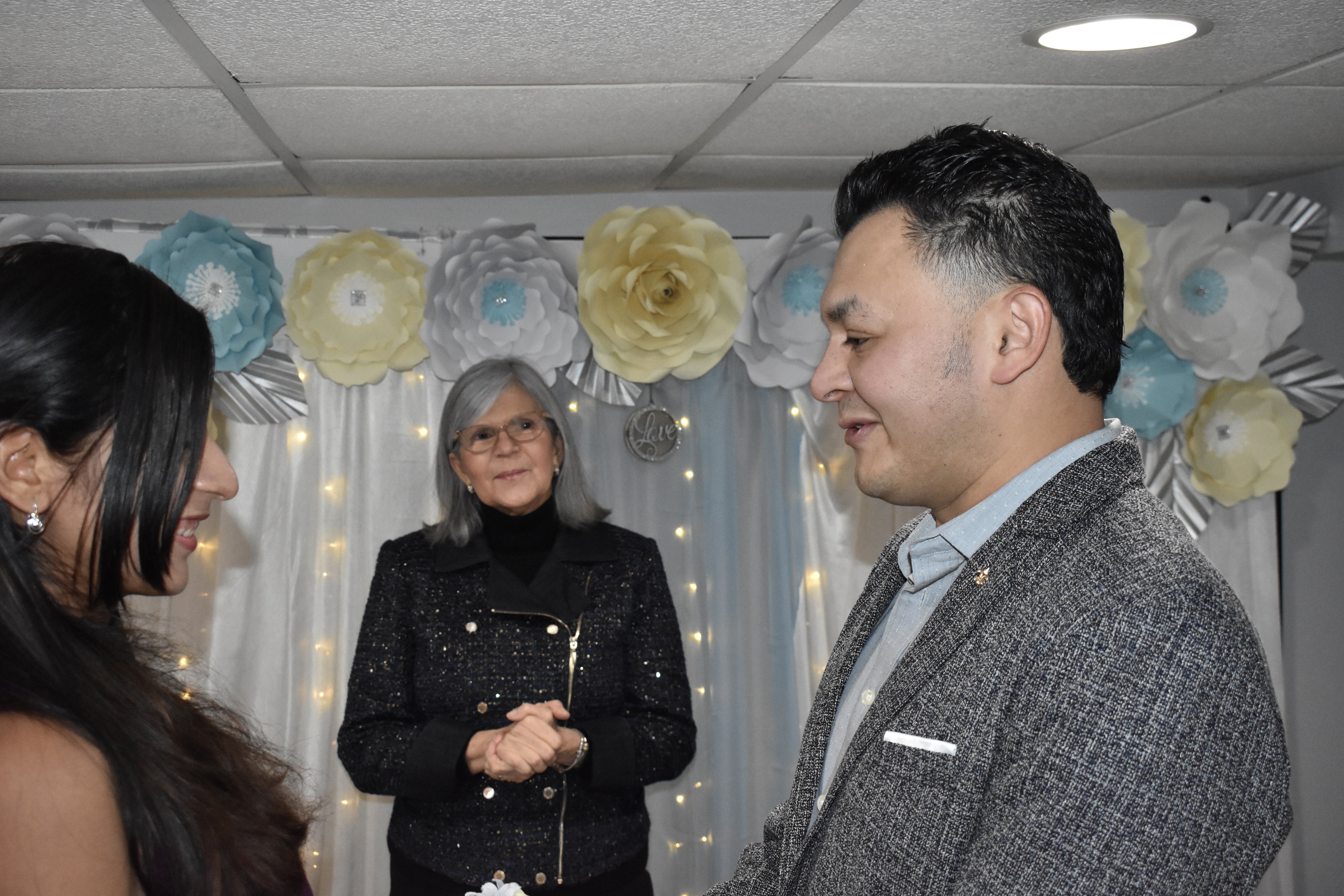Herminia es una linda joven de Guatemala y Roger es de Honduras. Se conocieron en Long Island, hace varios años, ya que el hermano de Roger esta casado con la hermana de Herminia. En el mes de septiembre 2020, planificaron una boda con familiares y amigos. Fue suspendida por la pandemia. Después de varios intentos fallidos, se fijó la fecha de bodas para el 30 de enero, 2022 y el dia antes hubo la tormenta que dejó cantidad de eventos suspendidos. Sabiendo todo lo que habían pasado, logré resolver que se desocupara suficiente nieve para abrir camino a la capilla y pudieran realizar su matrimonio. Vinieron acompañados de una amiga y esta vez, el amor les ayudó a triunfar. Están felizmente casados.