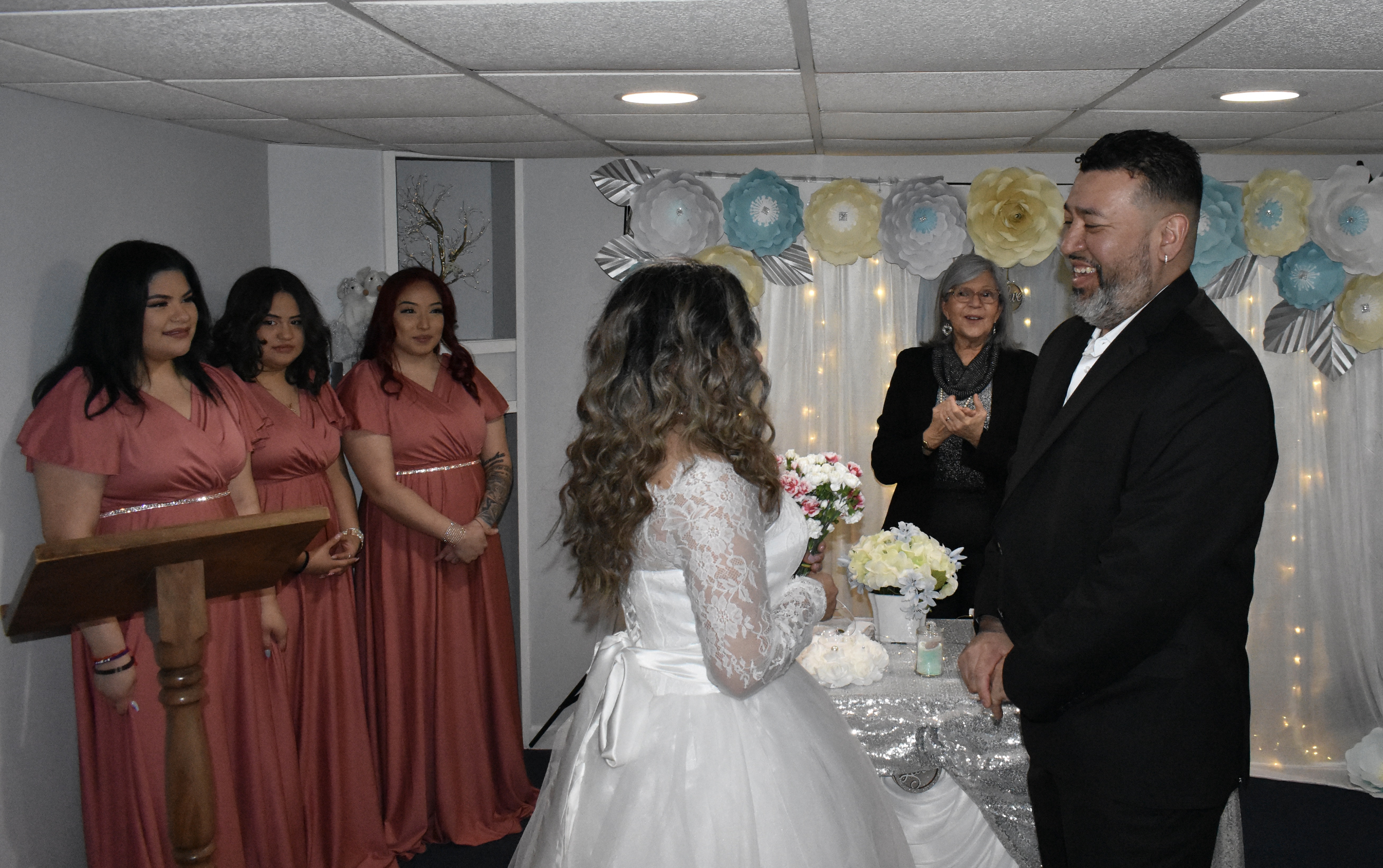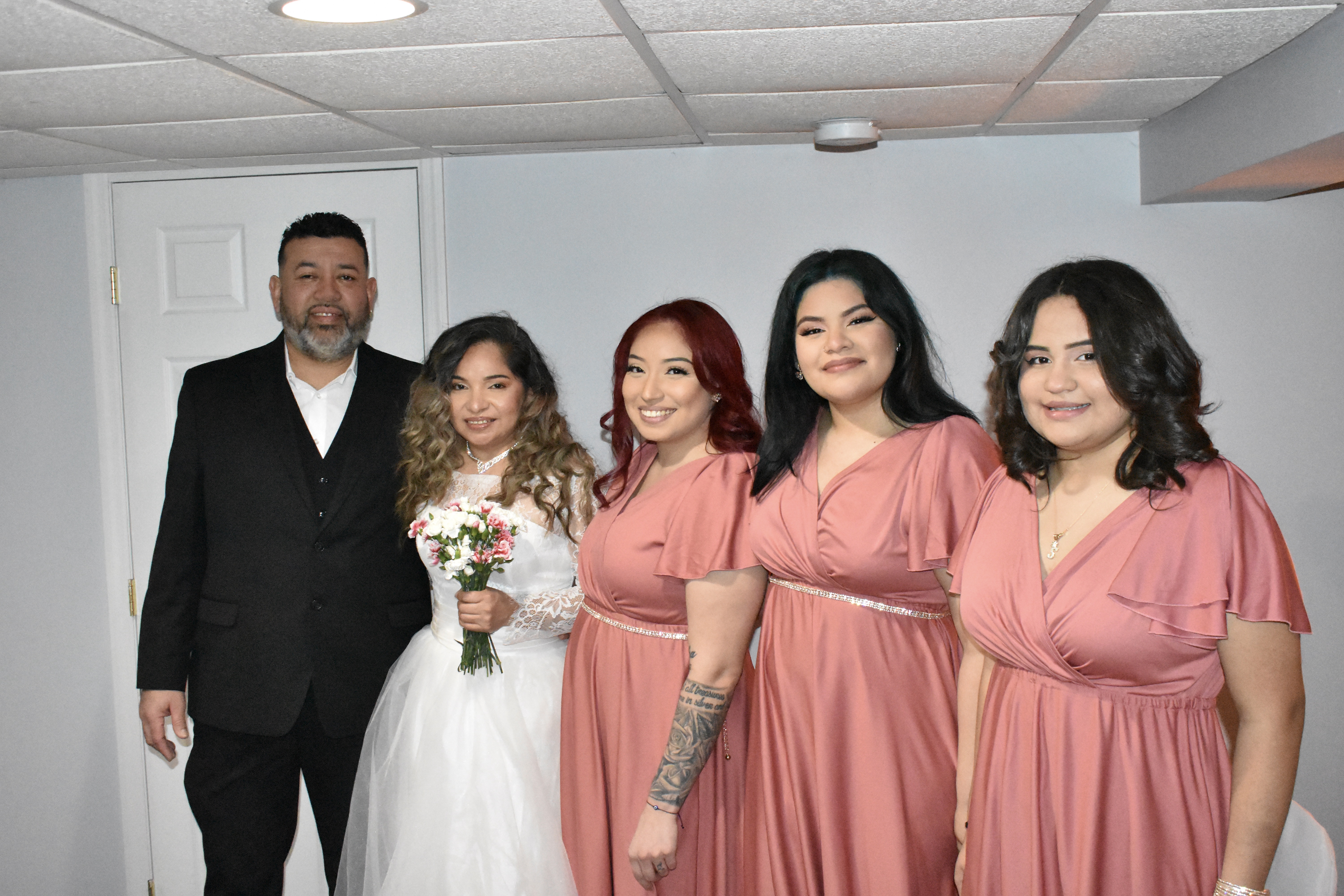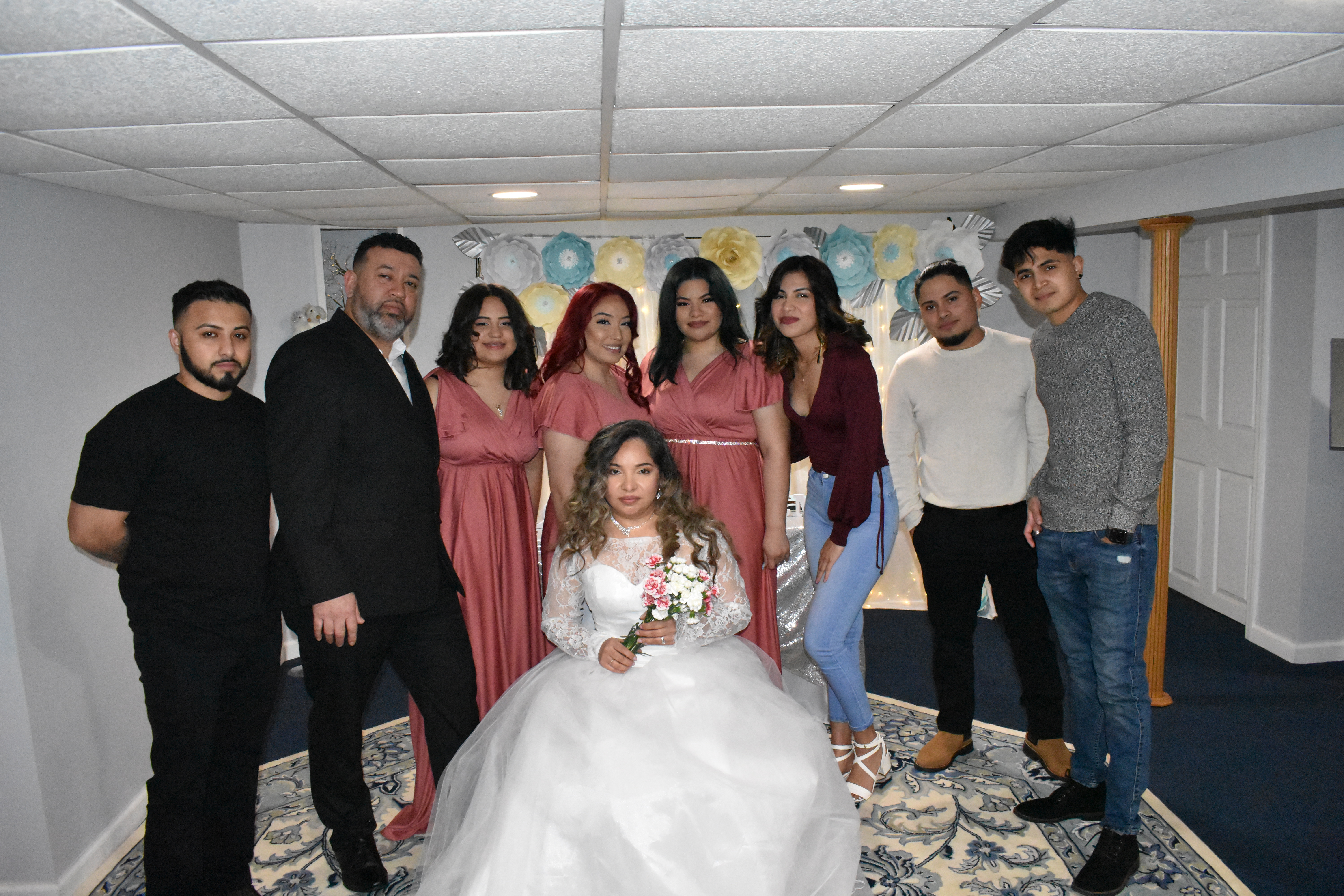 Sandra y Carlos, son de El Salvador y estudiaron en la misma escuela. Siendo jóvenes adolescentes, fueron novios. La vida los llevó por diferentes caminos y 20 años después, se reencontraron en Facebook, se dijeron : “nunca es tarde” y re iniciaron la historia de amor que había quedado inconclusa debido a la corta edad que tenia en ese momento. La novia, lucia hermosa en un lindo vestido blanco, y sus tres hijas fueron el cortejo con un vestido color salmón. Evento del 12/2/2022
