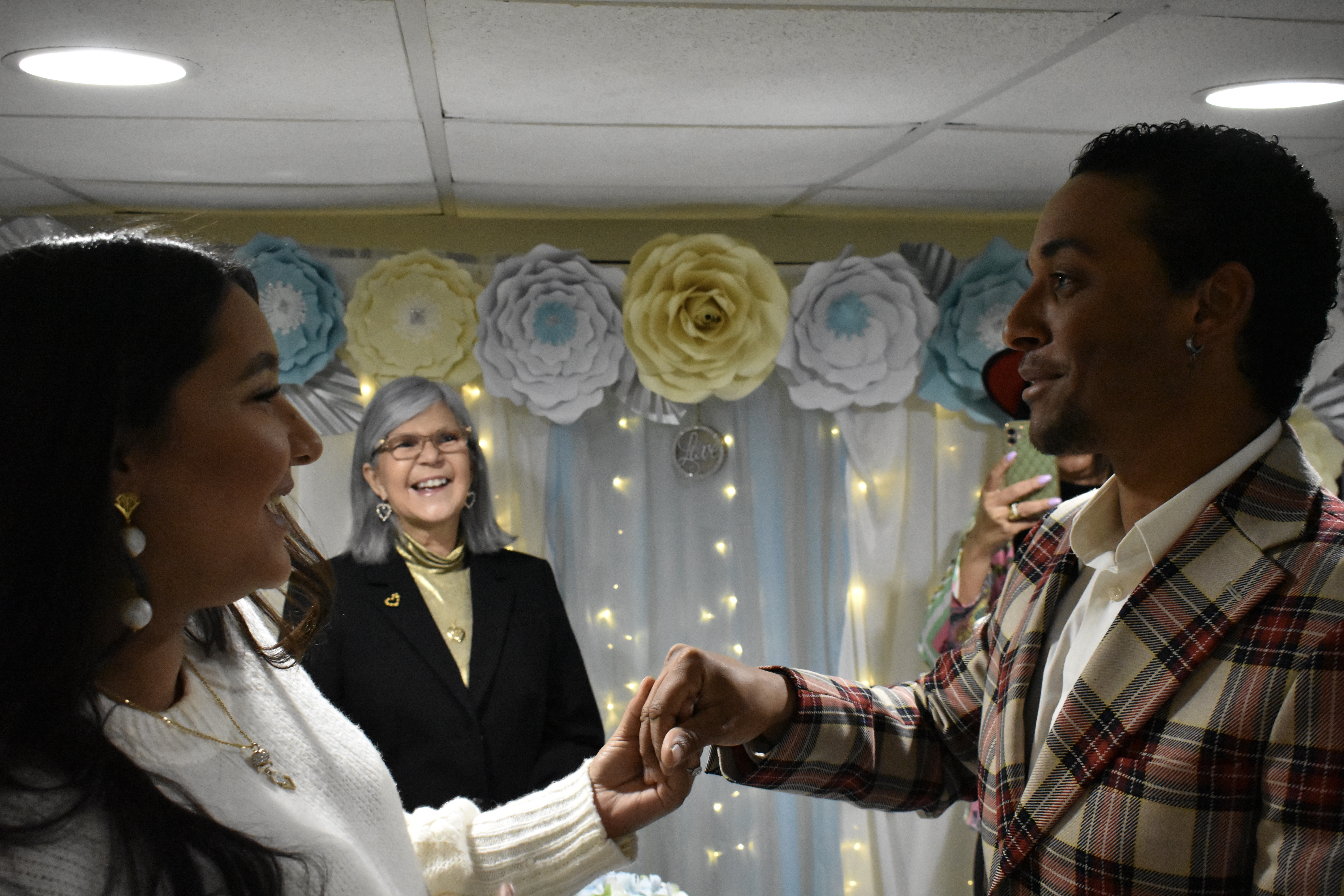 Nicole es Dominicana y Nelson es Puertorriqueño; ambos jóvenes y de muy buen humor. Sus risas eran contagiosas y constantemente, le hacían cariño al bebé que Nicole lleva en ella. Al yo preguntarles: cuándo nace el hijo? Todos, riendo, dijeron: ” en cualquier momento. Ya está en la semana de parto” Favorablemente, para ellos, el momento de nacer no se presentó en la boda. En el 2018 tuve el placer de casar a la tía del novio, Marilu, y en el 2021 a la madre del novio, Yolanda. Ambas estaban presentes en la ceremonia. En los votos, el novio emotivamente dijo:” tu, el baby y yo estaremos juntos hasta que la muerte nos separe”