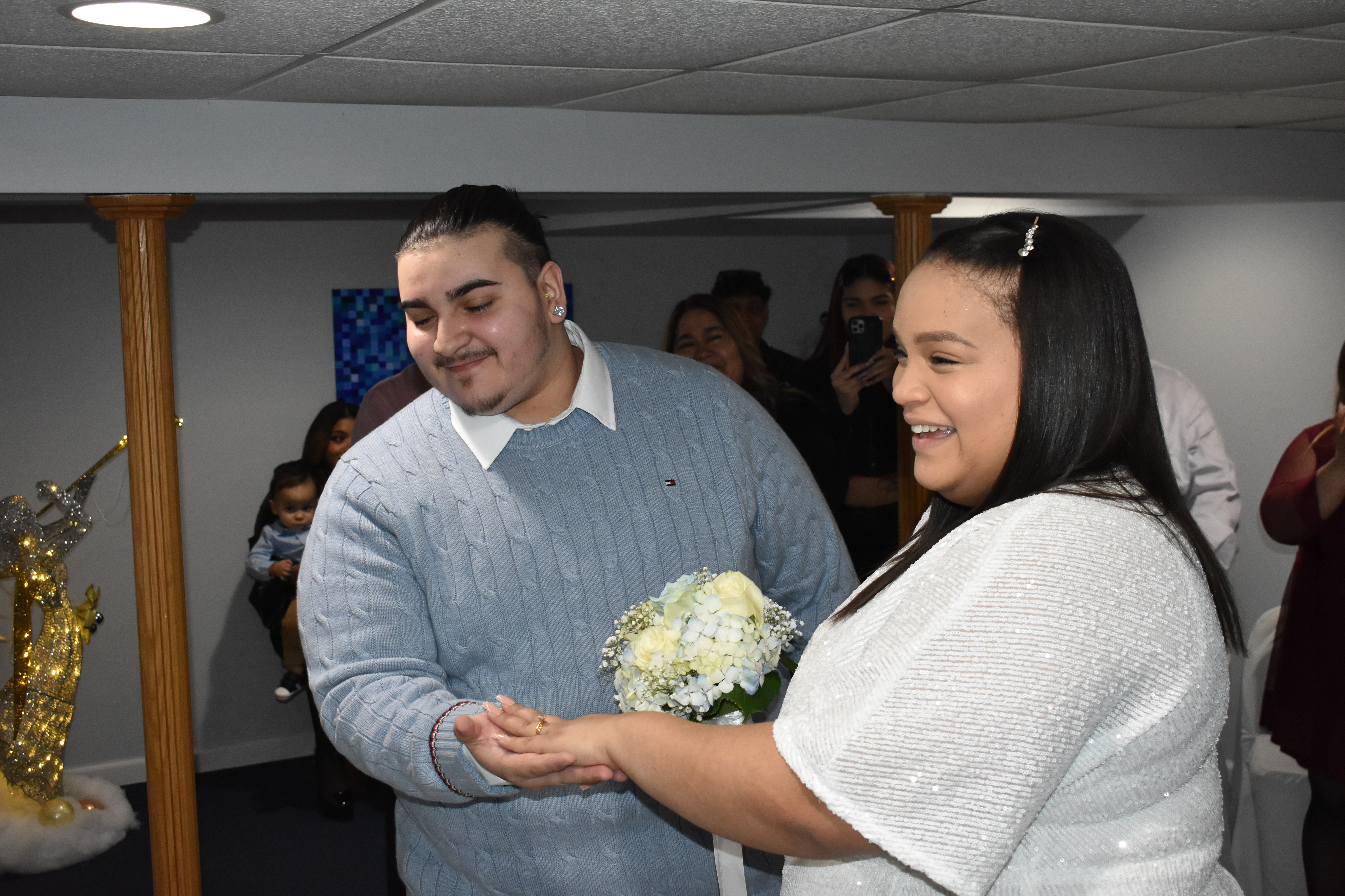 Johanna es dominicana y Eric es ecuatoriano; ambos cursaron bachillerato en Queens; allí se conocieron y comenzaron un amor colegial. Tres años después, con un lindo bebé de un año de nacido, dicen “Si acepto” para confirmar la continuidad de la linda familia que han iniciado. Acompañados de sus padres y familiares, vinieron a mi capilla para cumplir su sueño de unirse en matrimonio.El amigo de la familia, Hernán Hernandez hizo de testigo y casualmente, fue el que recomendó mis servicios, ya que estuvo presente en la boda de Enma y Fredy, el 16/10/2021 y guardó mi tarjeta. Feliz con cada recomendación.