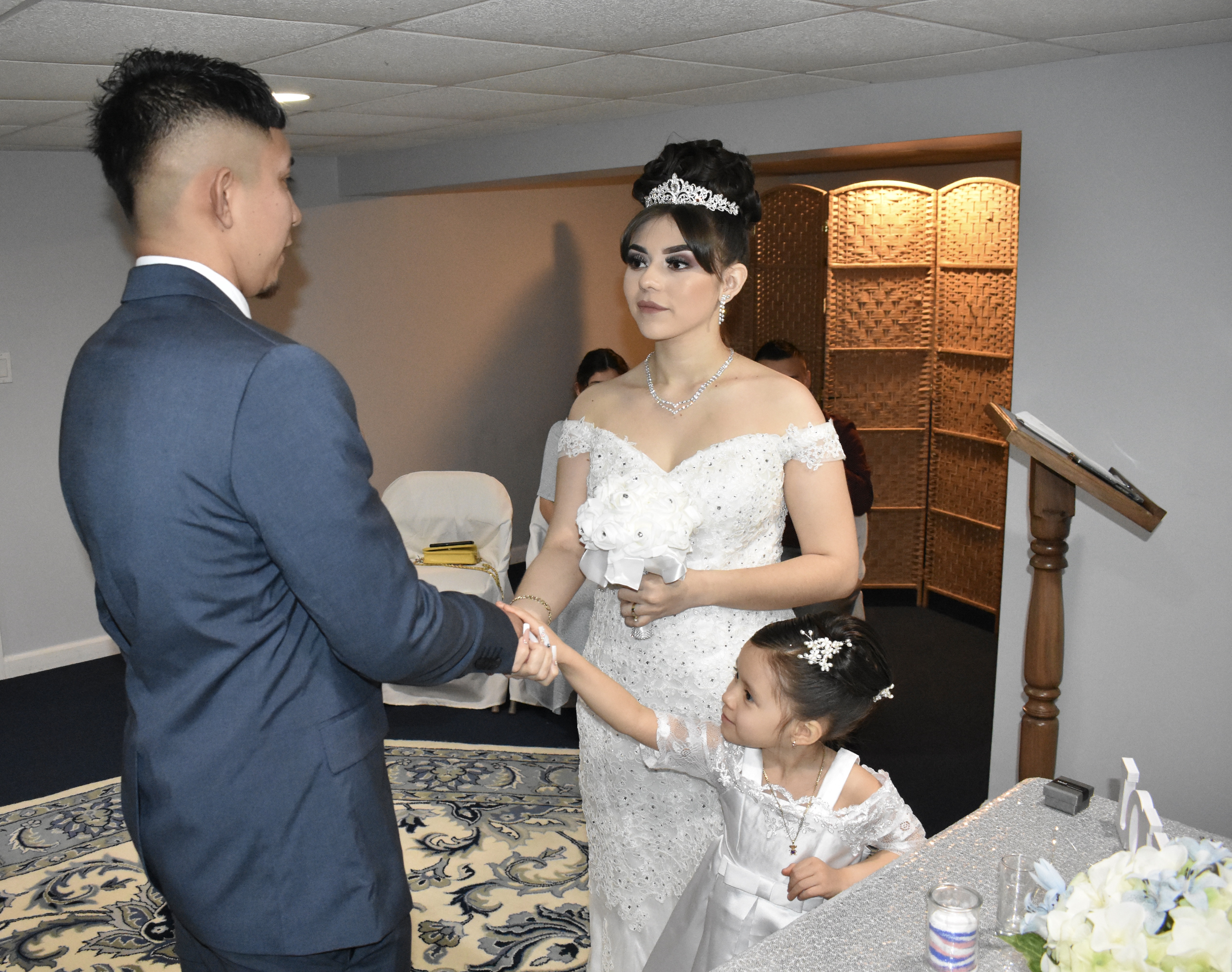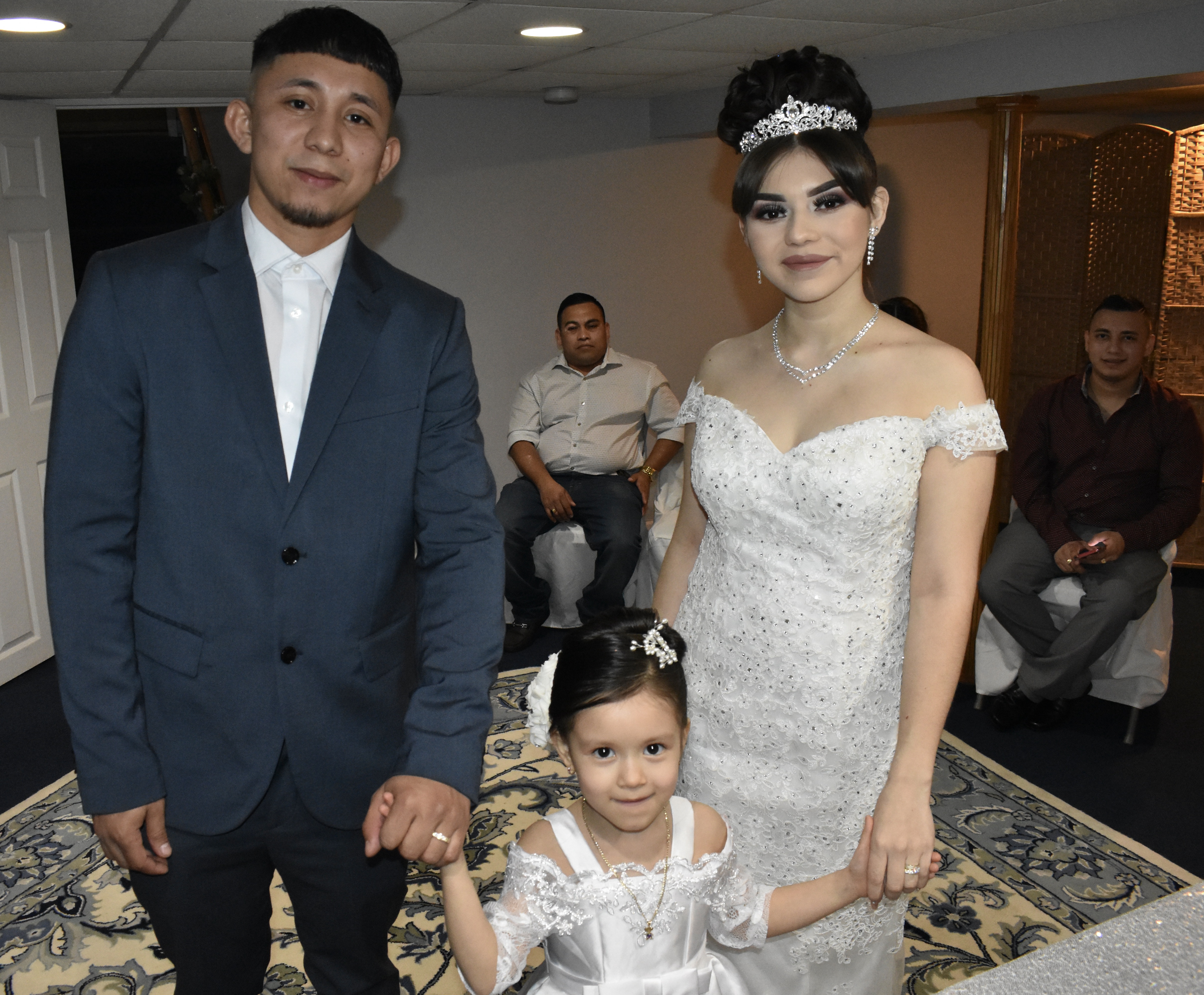 Yenny y Adonis son salvadoreños, tienen cinco años de noviazgo y una linda y simpática hija, que participó activamente en el evento, por lo cual, podemos decir que fue un matrimonio de tres. La chiquilla entregó los anillos, agregó su arena en el ritual, y al los padres decir sus votos, ella de inmediato colocó su mano cubriendo la de sus padres. Los novios estuvieron acompañados de sus padres, los abuelos de la novia, y el hermano de la novia con su respectiva pareja. Un grupo pequeño en cantidad y grande en el amor que mostraban unos a los otros.