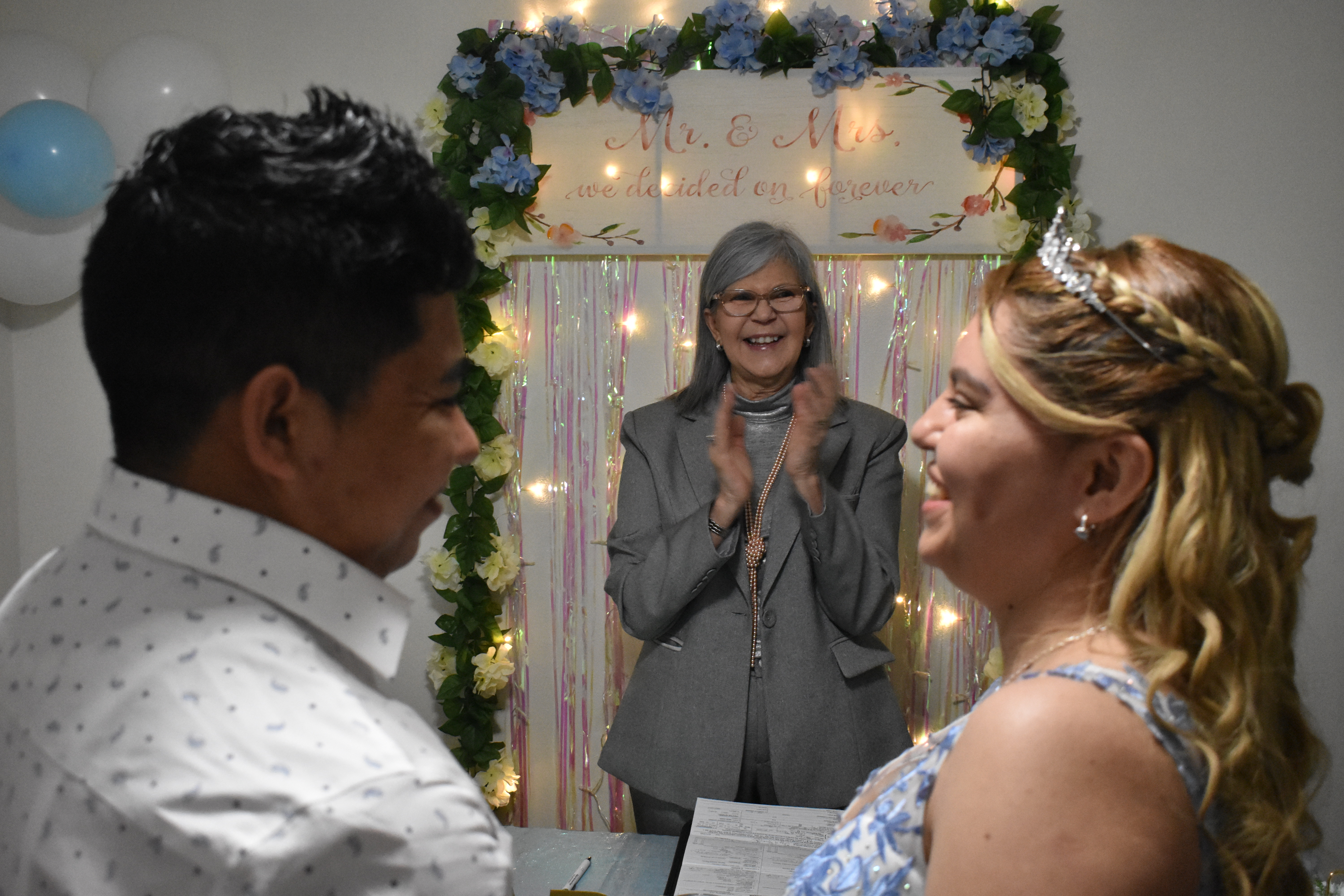 Dalila es salvadoreña y Mefi es guatemalteco. Tienen cinco años juntos y una hija, Bianca. En un pequeño salón del hogar de los novios, fue colocada la decoración, mesa y sillas para hacer la boda. Estaban presentes los abuelos y hermanos de los novios. El invitado especial, fue un sobrino, Dario, un chiquillo de dos años, que constantemente gritaba “foto” y reía para que el fotografo le viera a el. Un toque divertido de fondo en un lindo evento familiar.