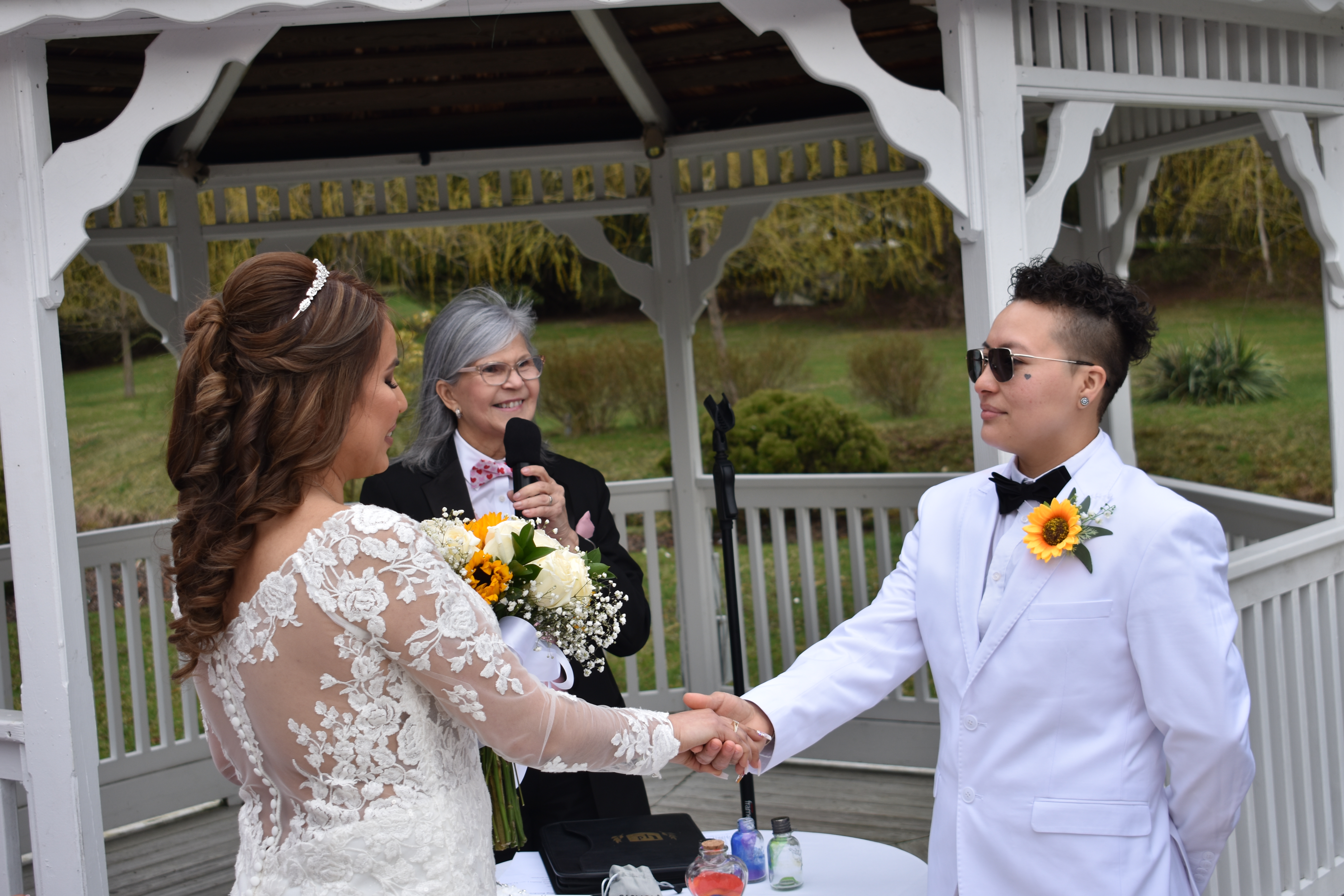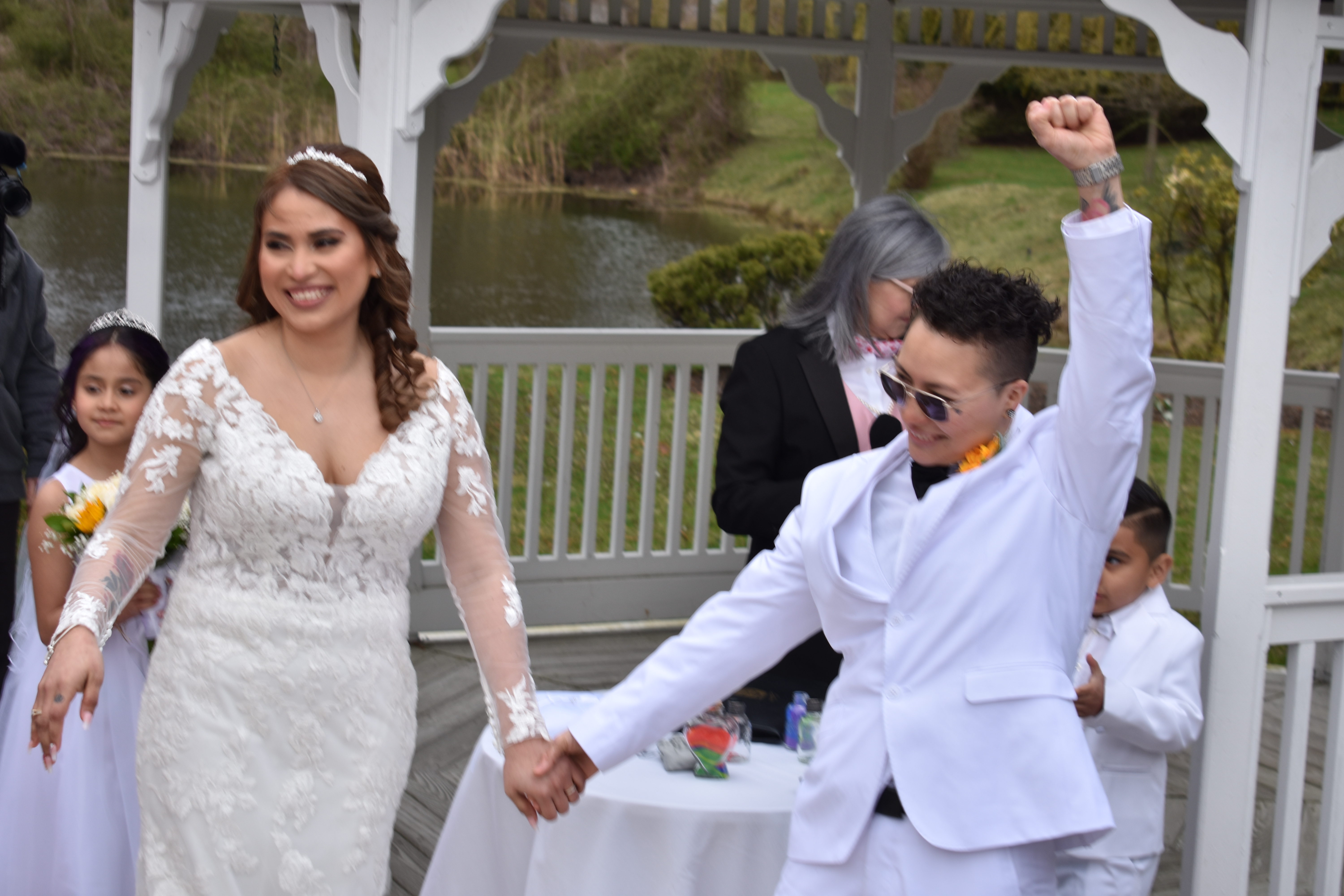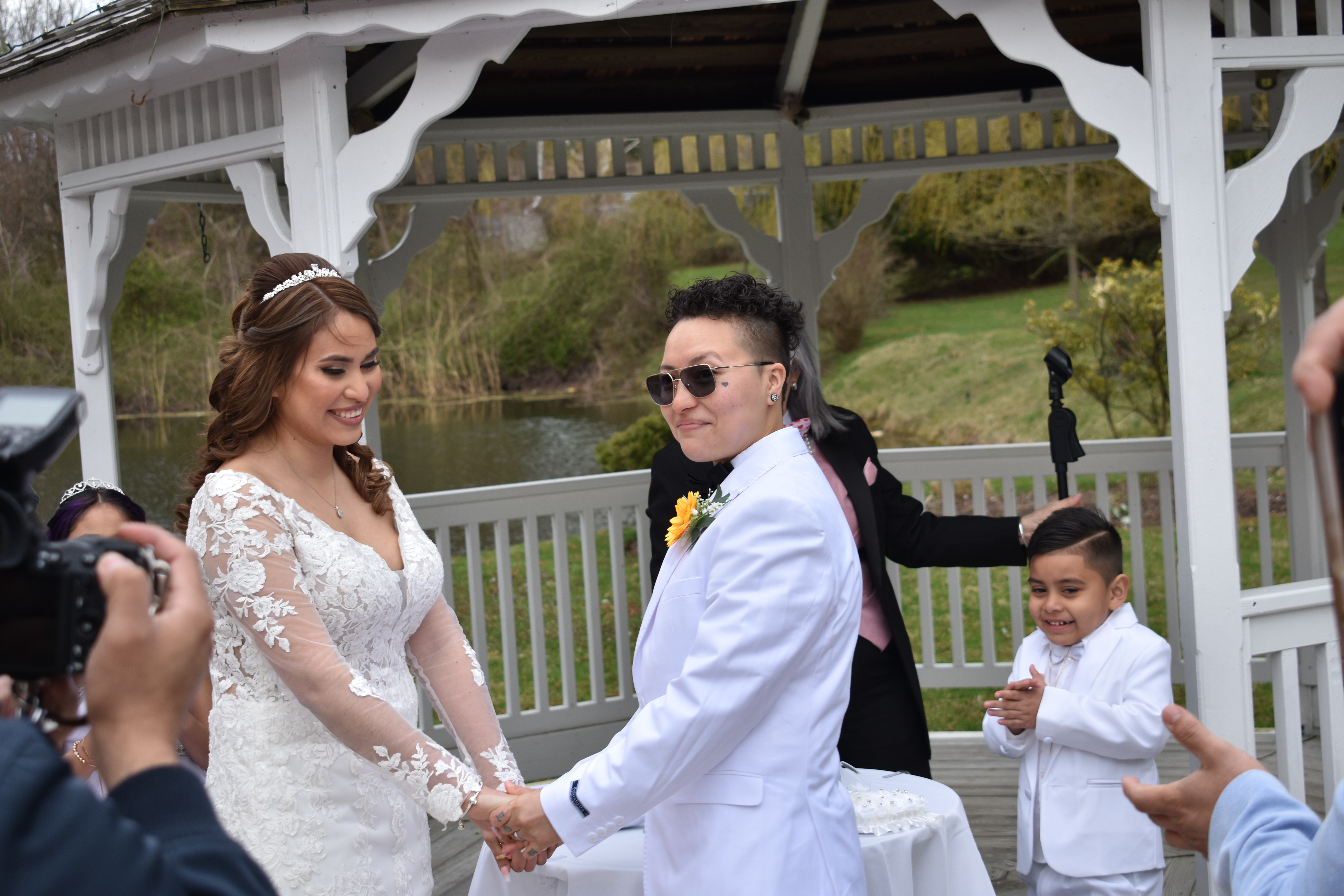 Jessica y Sandra son salvadoreñas y tienen ocho años de relación. Se conocieron en el trabajo y pícaramente, Jessica me dice: “Sandra me enamoró”. Jessica tiene una hija de 8 años quien fue parte del cortejo, en el cual las damas lucían colores pasteles, diferentes la una de la otra, simbolizando los tonos de la bandera LGBT. Sandra entró acompañada de su madre, Dinora Alvarado. Los testigos de la boda fueron Walter Alvarado y Olga Guevara. Jessica llegó acompañada de su hermano, Edgar Alvarenga. La ceremonia fue al aire libre, a pesar de estar un poco frio, sin embargo, todo quedó hermoso y luego entraron al bello salón de Flowerfield para brindar, bailar y celebrar.