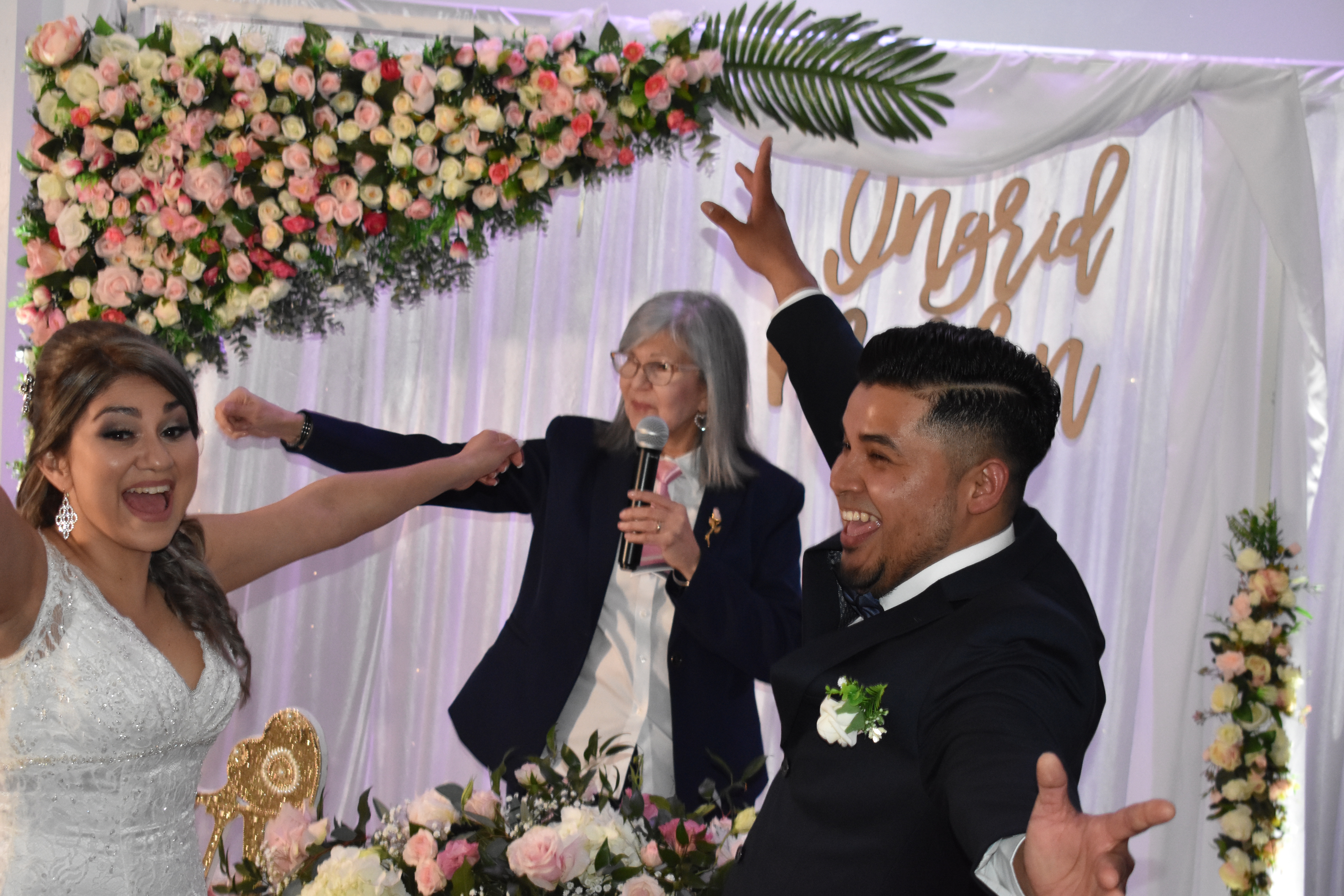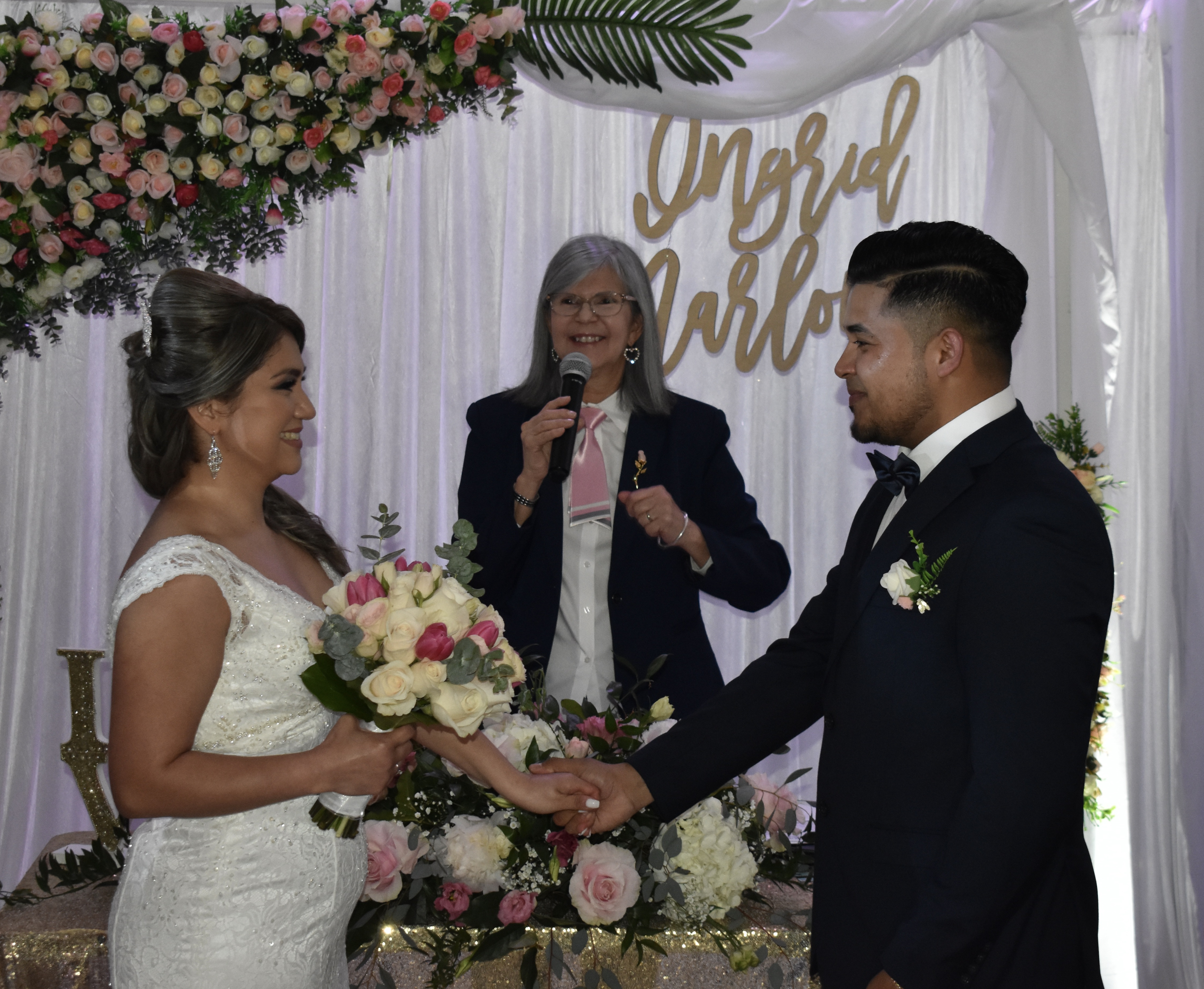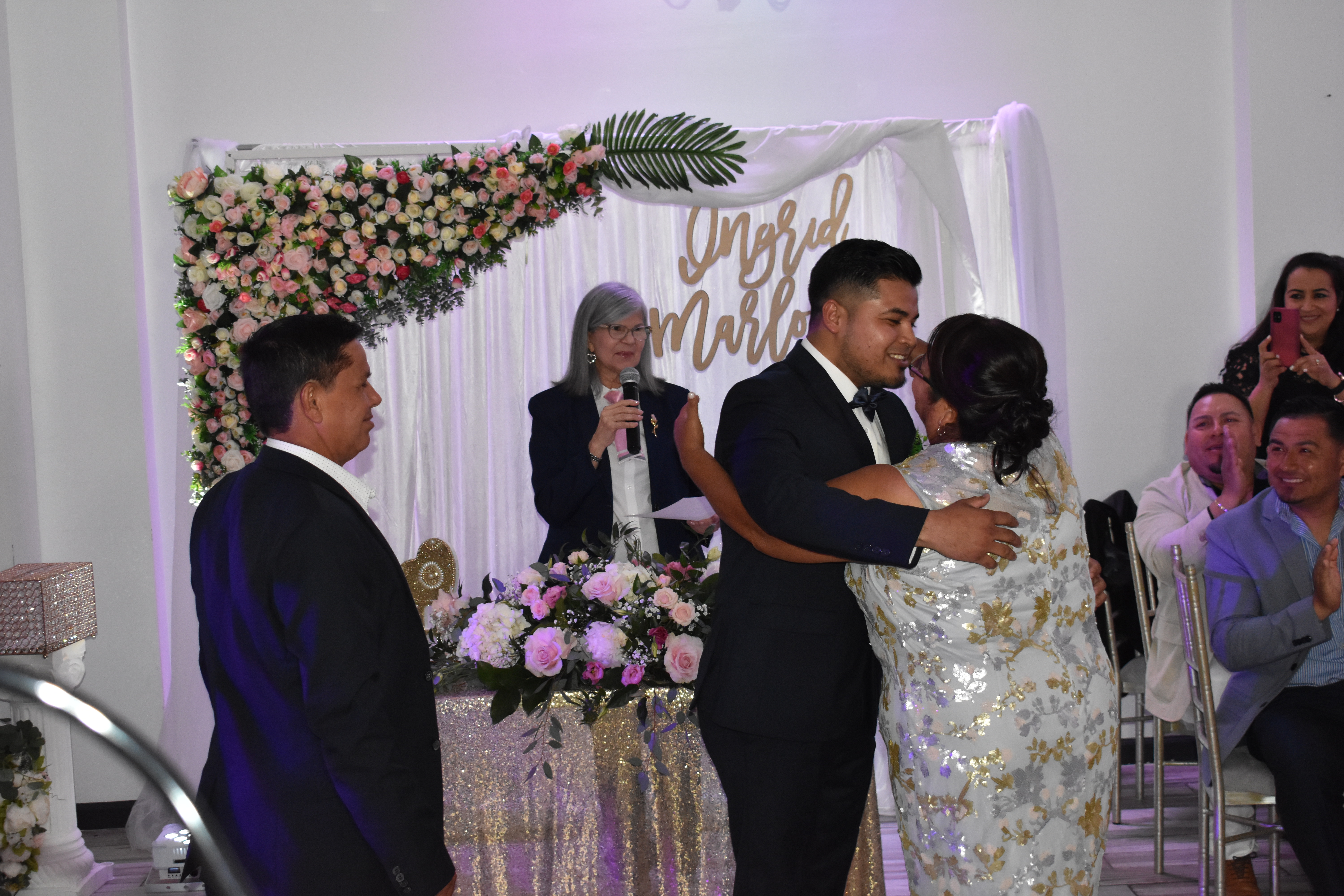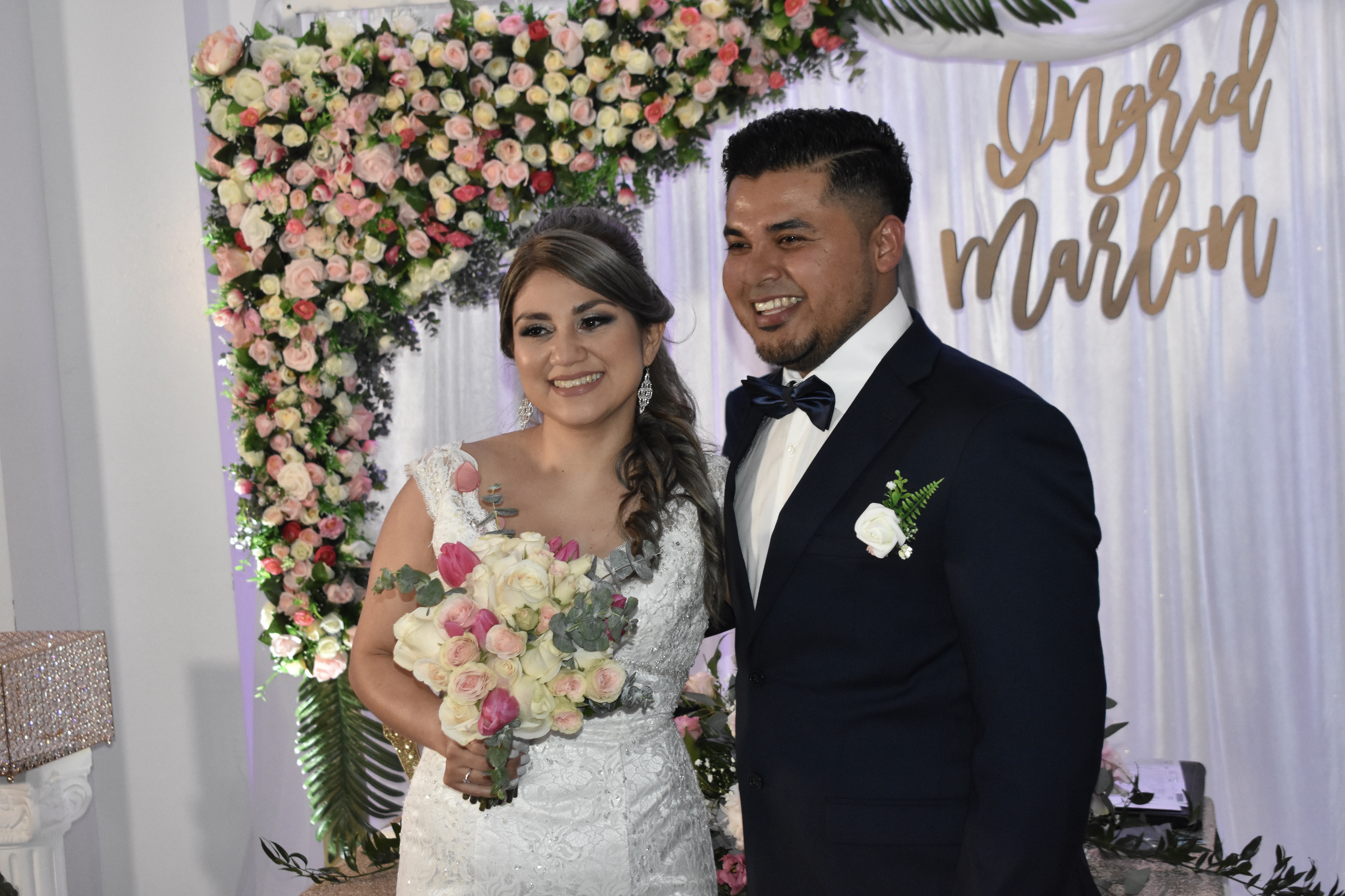 Ingrid y Marlon son salvadoreños, tienen ochos años de relación y una hija de siete años de edad. El evento fue realizado el dia 16 de abril en el Royal Event Party Hall en Freeport. Marlon entró acompañado de sus padres; Lilian Ramirez y Antonio Ayala. La hija de la novia, Chelsea, fue la encargada de regar los pétalos y su hermana, Paola, de traer los anillos. La decoración fue en blancos con detalles rosados. Los padres de la novia, asistieron desde la distancia, a través de video llamada.
