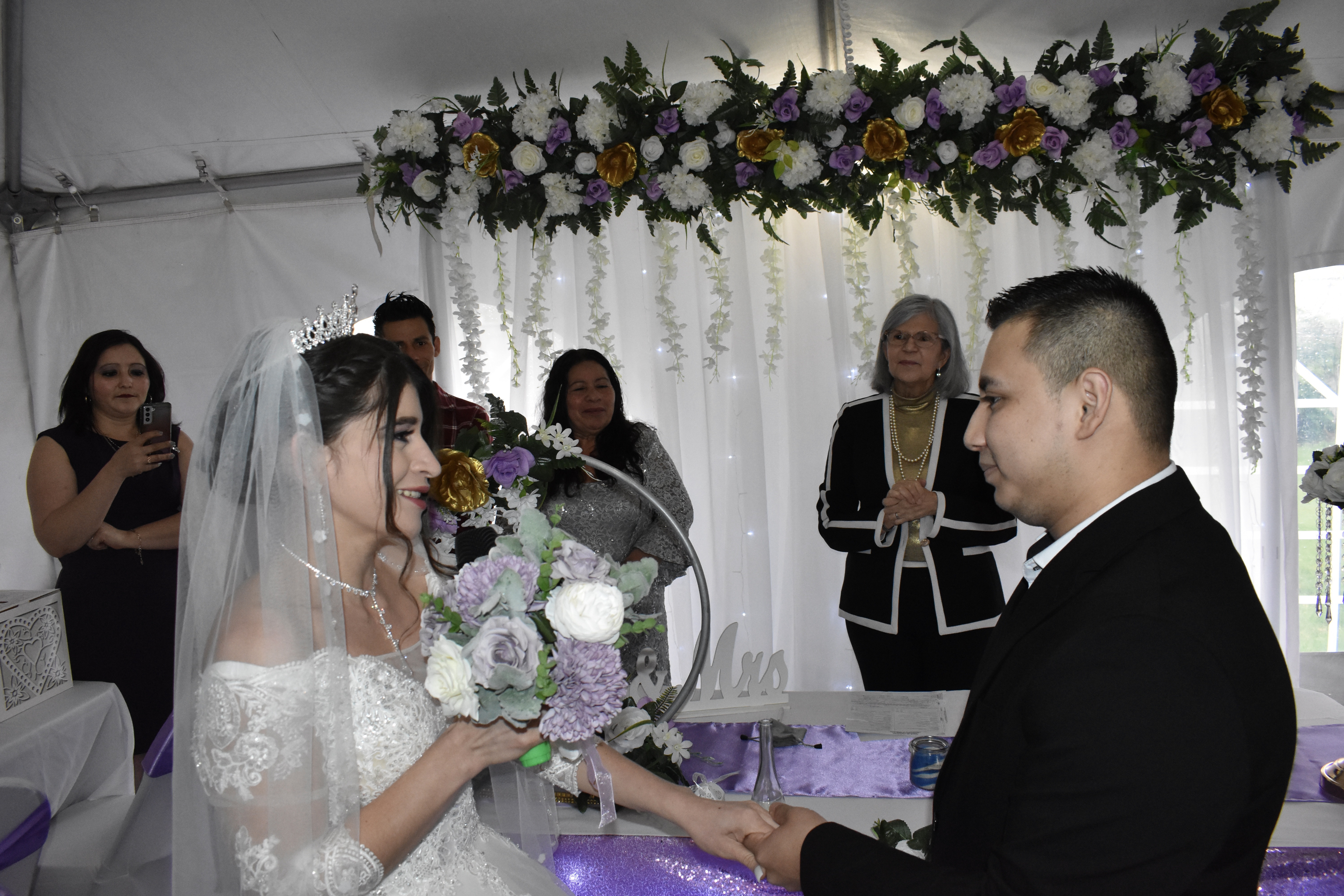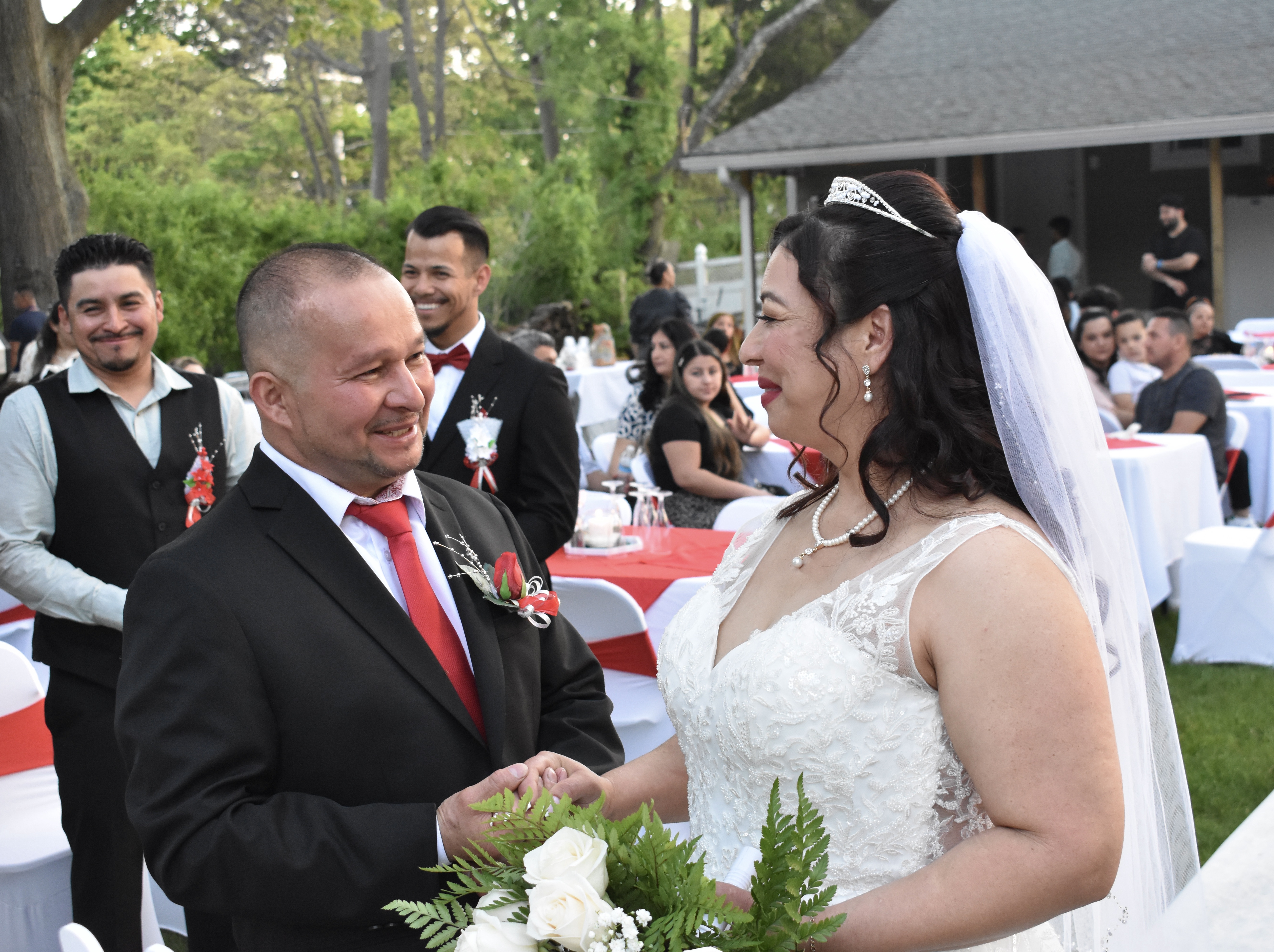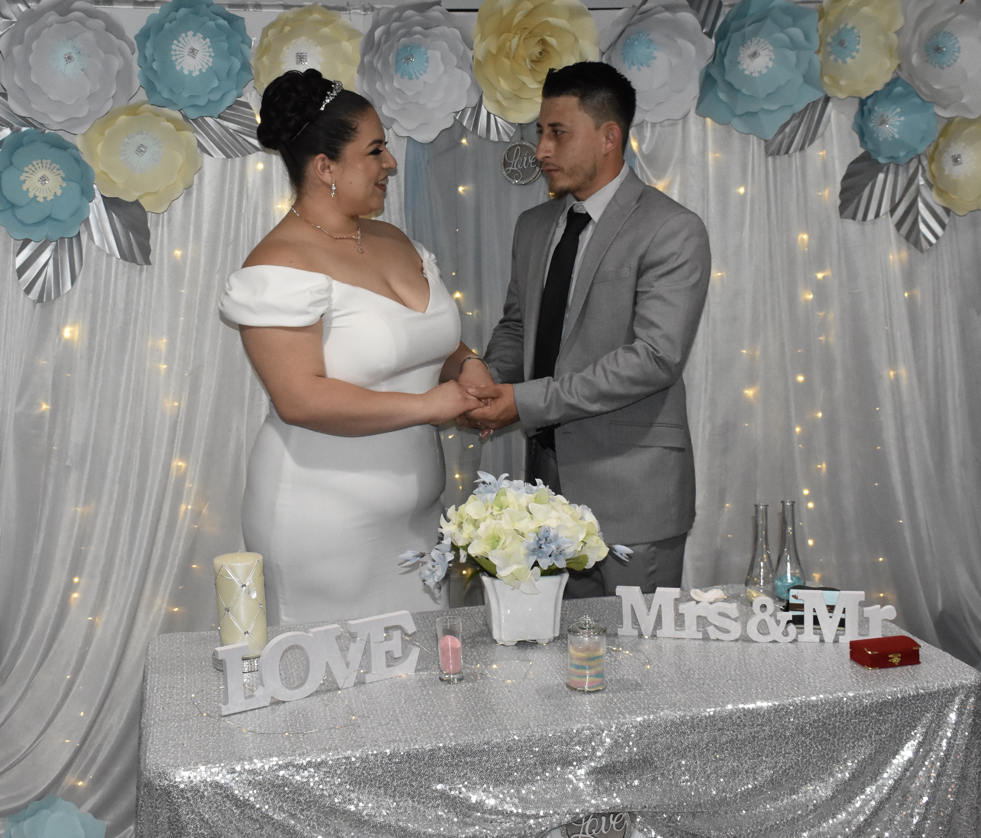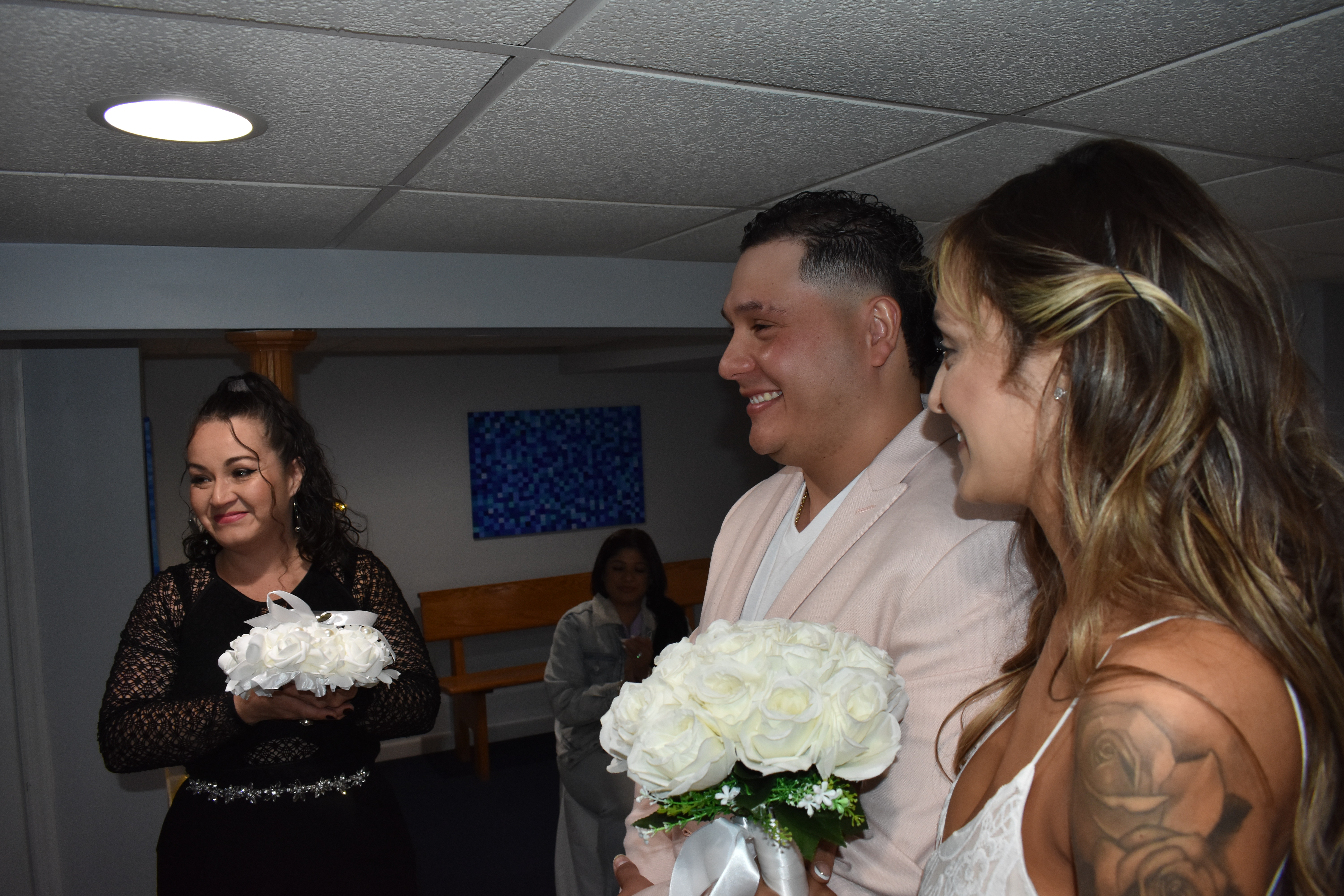 Fatima y Gilberto son salvadoreños, se conocieron en Long Island y tienen diez años viviendo juntos. Disfrutan de una linda familia conformada con sus dos hijas, Katherine y Belen. Gilberto llegó acompañado de su abuela, Herminia Mejía. Las damas de honor fueron las hermanas del novio; Cruz, Griselda y Maria Mejias, y la hermana de la novia, Erika Alfaro. Los pétalos los regaron las hijas de los novios. La novia llegó acompañada de su madre, Maria Arias. La boda fue el dia 22 de mayo a las 4:30 y cómo rara vez sucede, antes de las hora fijada, ya estaban presentes los novios, familiares y amigos.