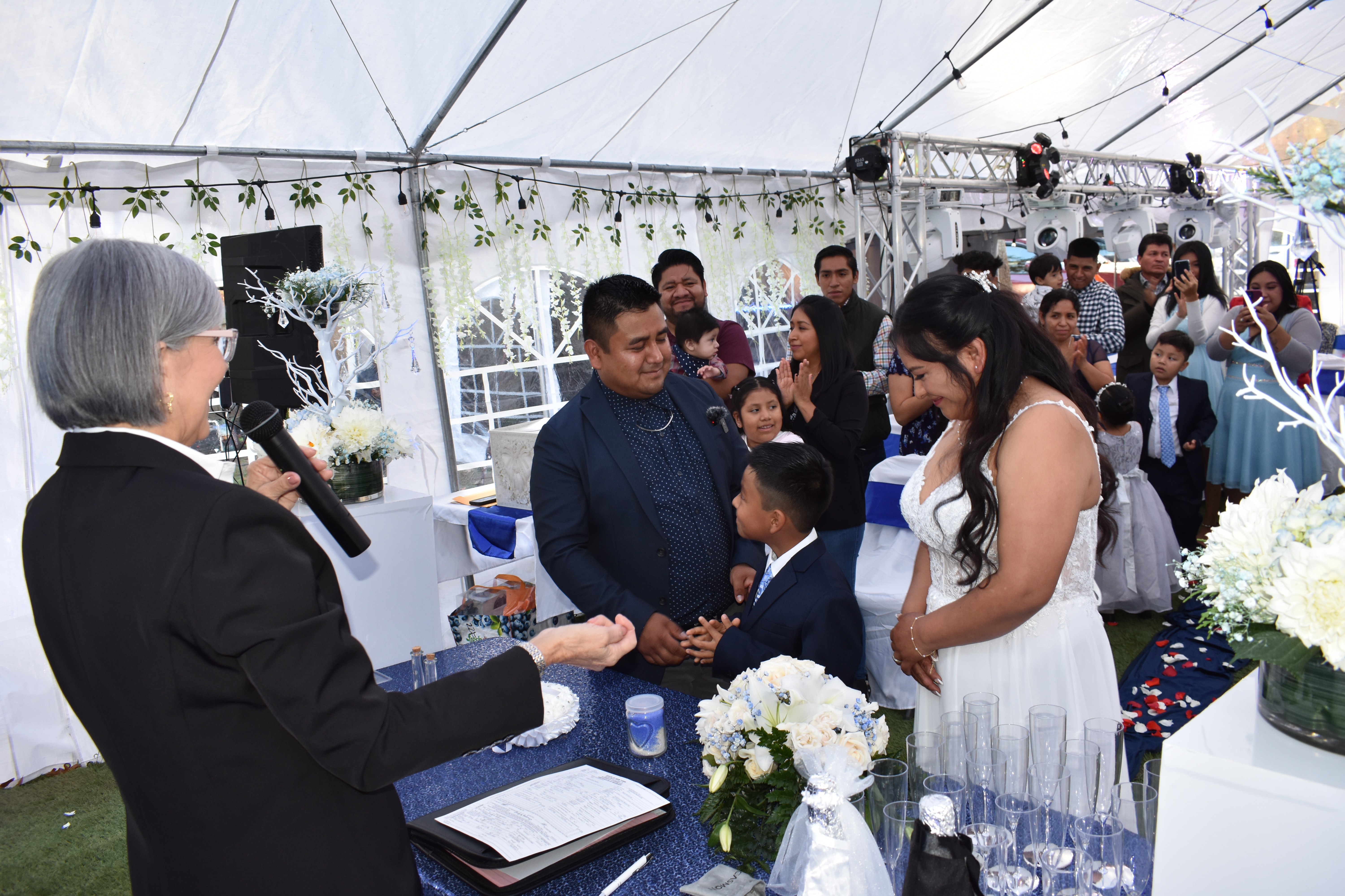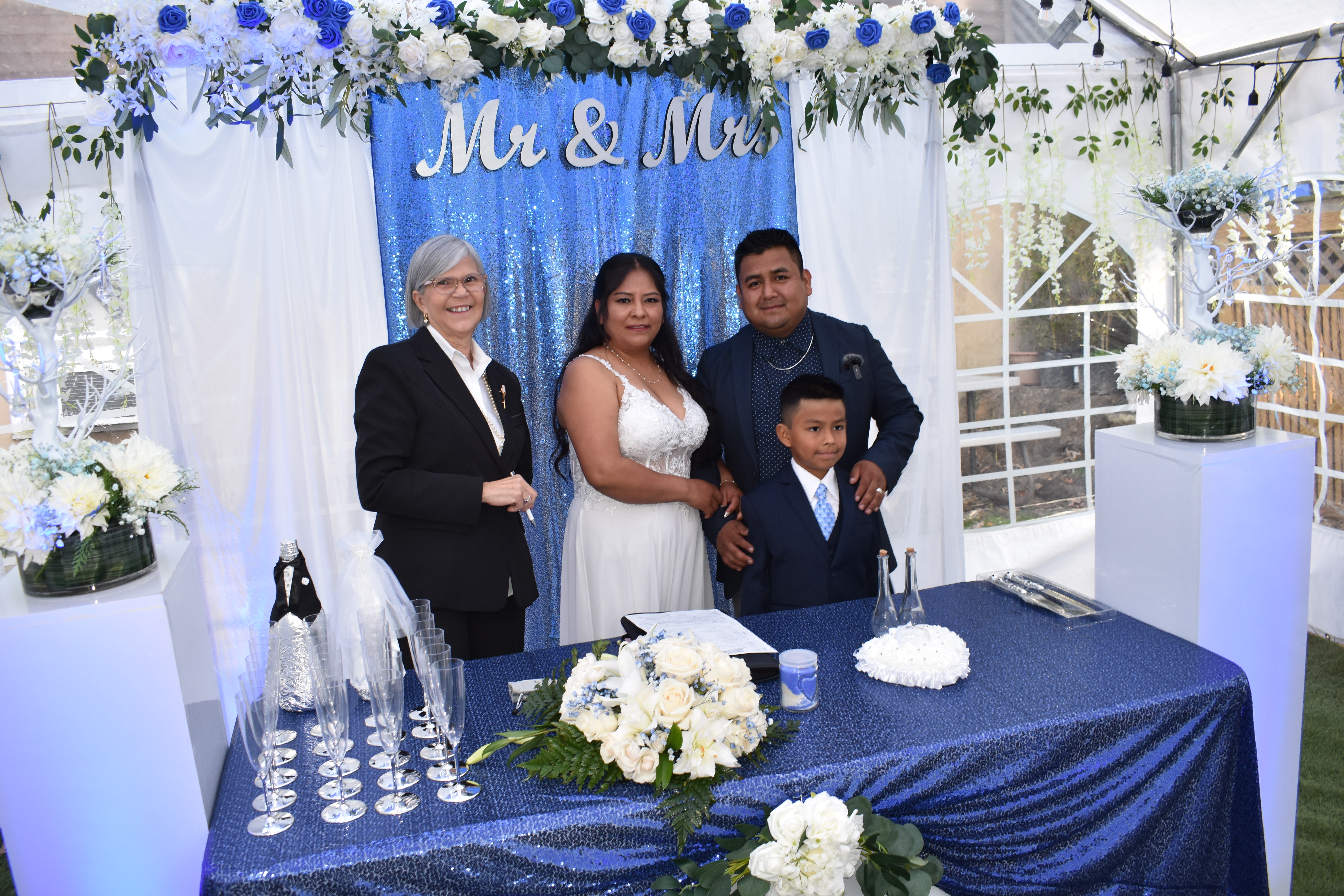En Julio 2022, visité el hogar de Antonia y Pedro para casarlos. En el jardin habían estufas gigantes, donde colocaban los ingredientes de la comida mexicana que iban a servir. El agradable olor era muestra de lo bueno que iba a estar el festín. El 5 de noviembre, 2022 regresé al mismo jardin, esta vez para casar a la hija de Pedro; Laura con su novio, Javier. En esta oportunidad, Pedro estaba a cargo de los fogones y de que la comida quedara como debe ser. A la hora fijada, ya estaban todos los familiares y comenzamos el evento. Laura y Javier tienen muchos años juntos y un hijo de 10 años de edad, quien participó con ellos en la ceremonia de la arena.