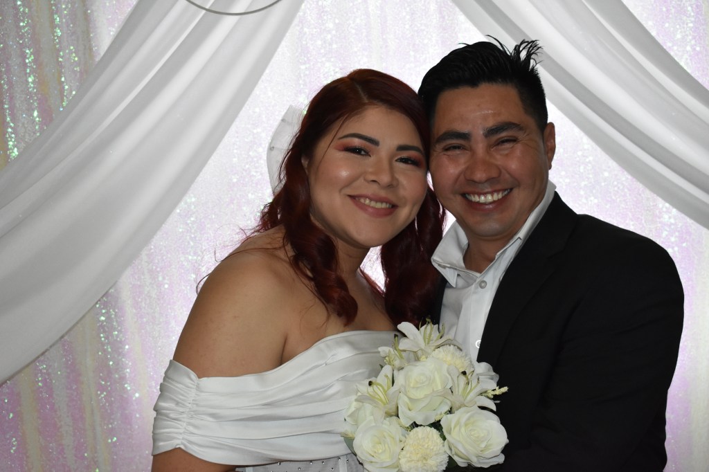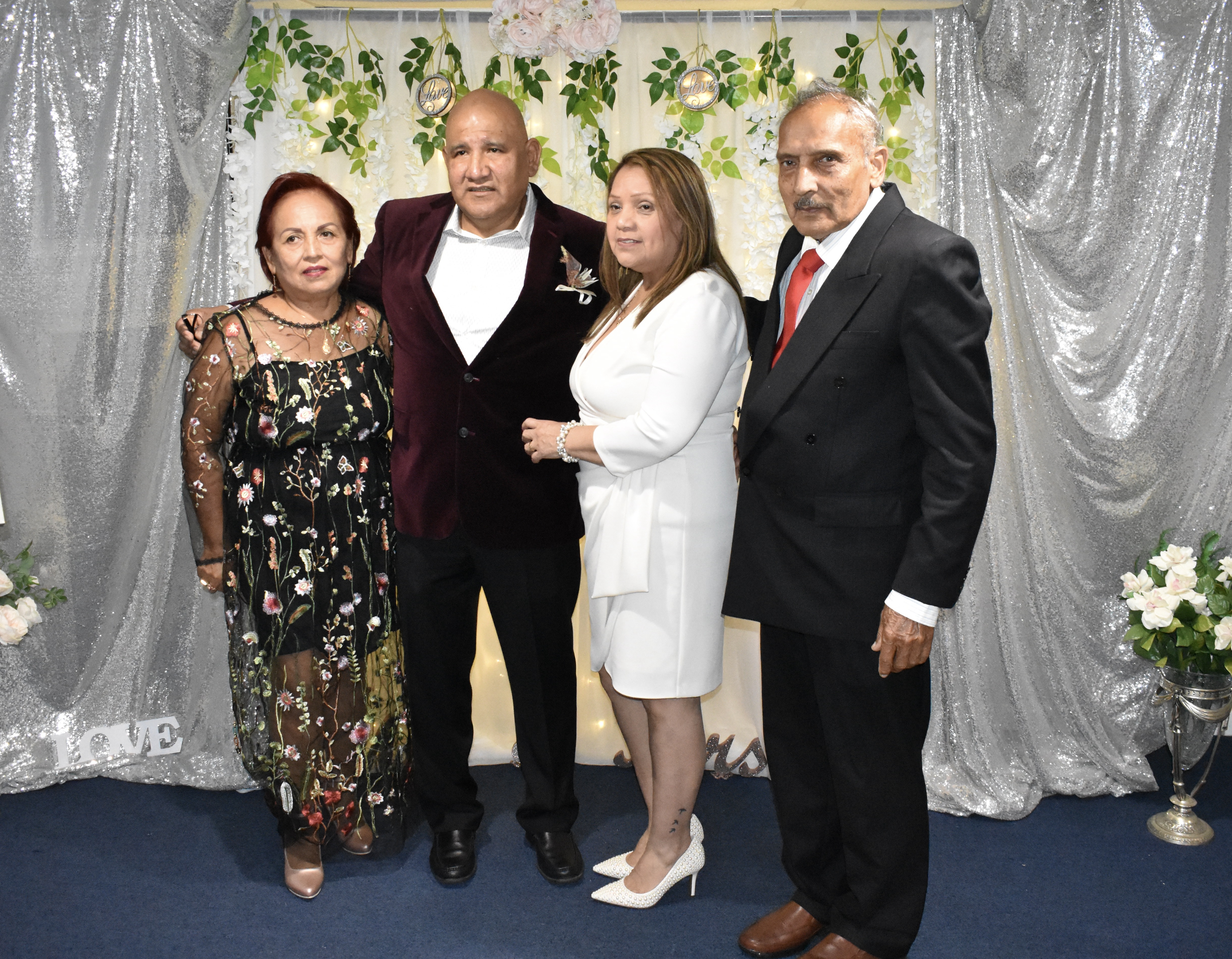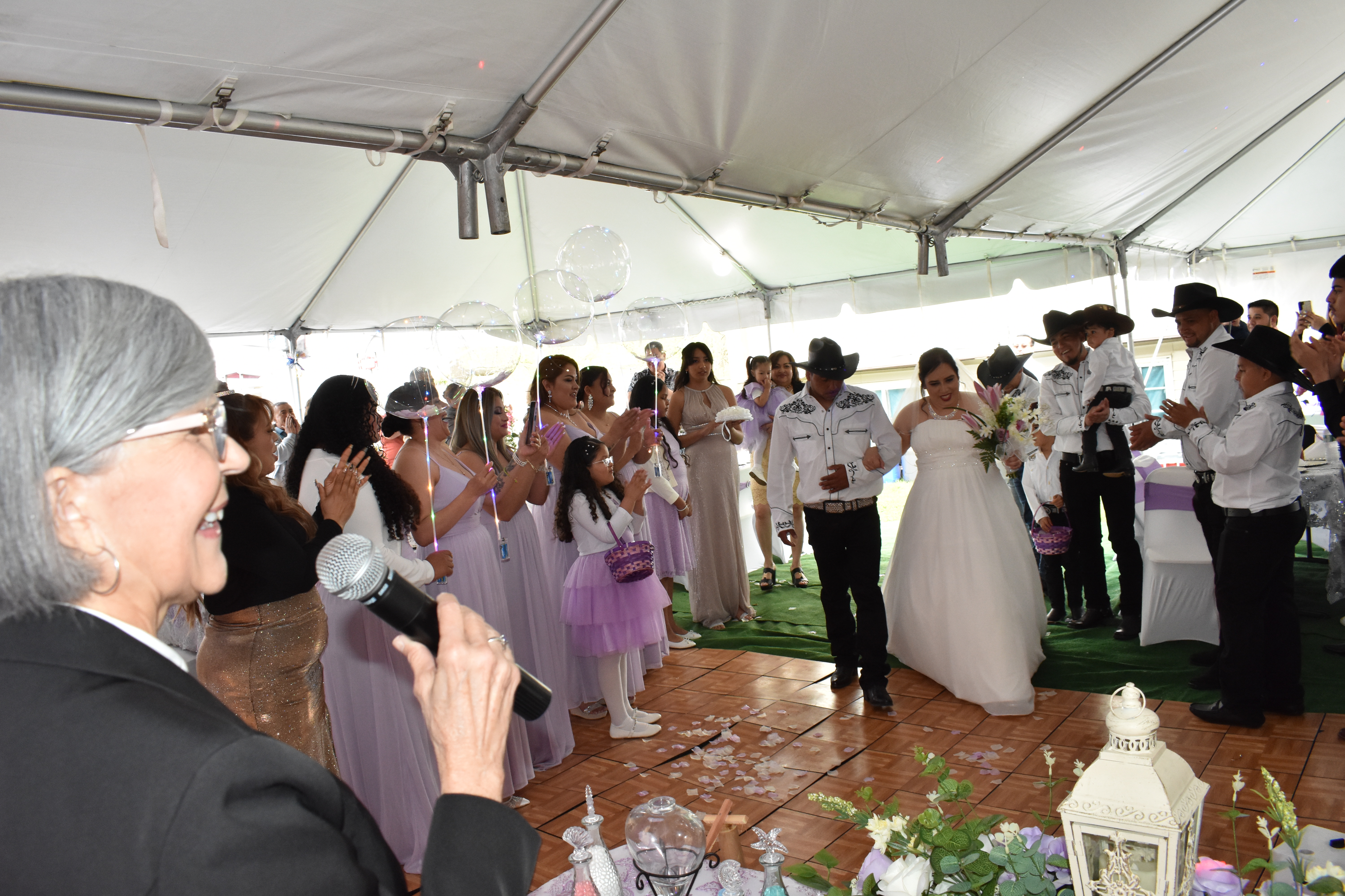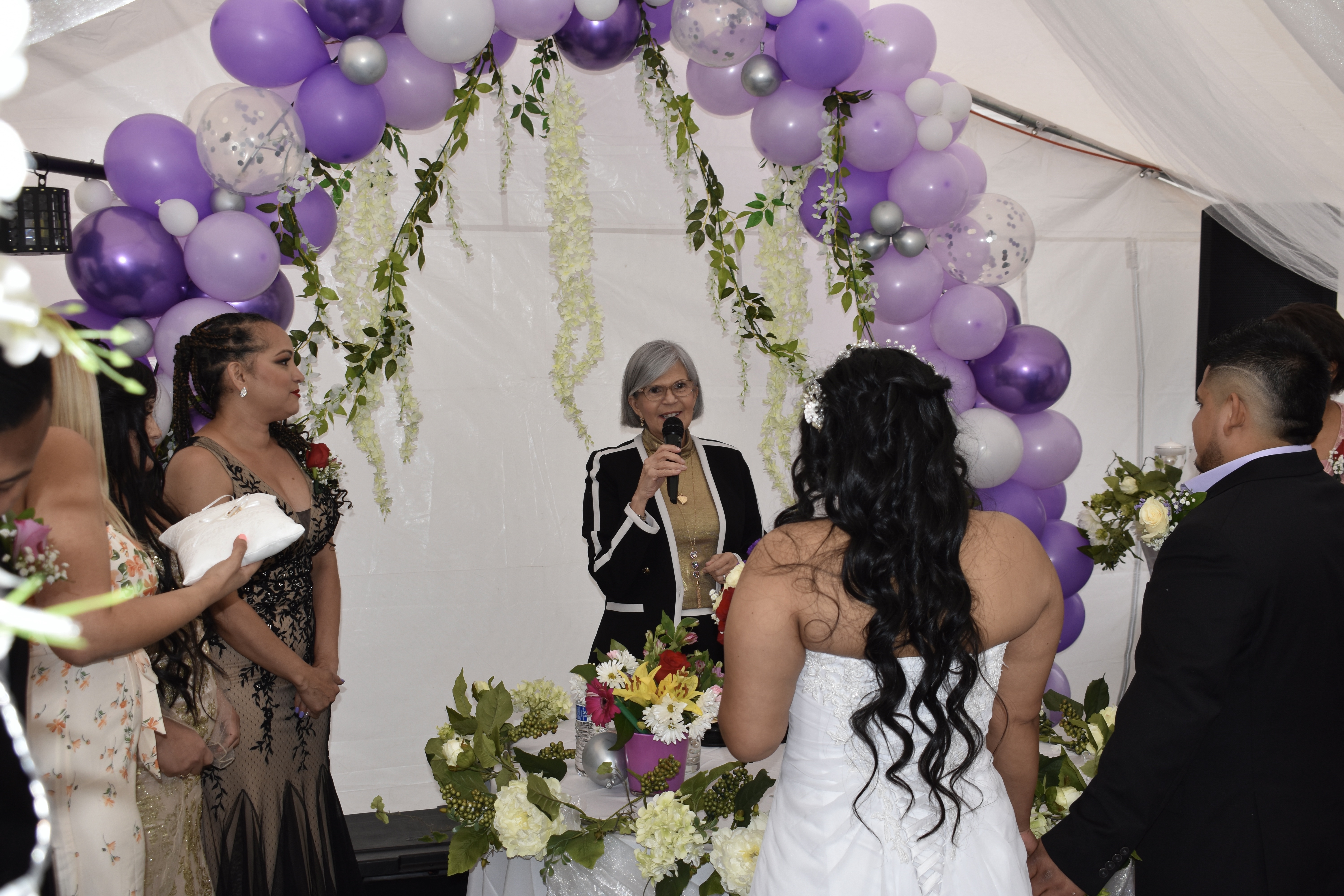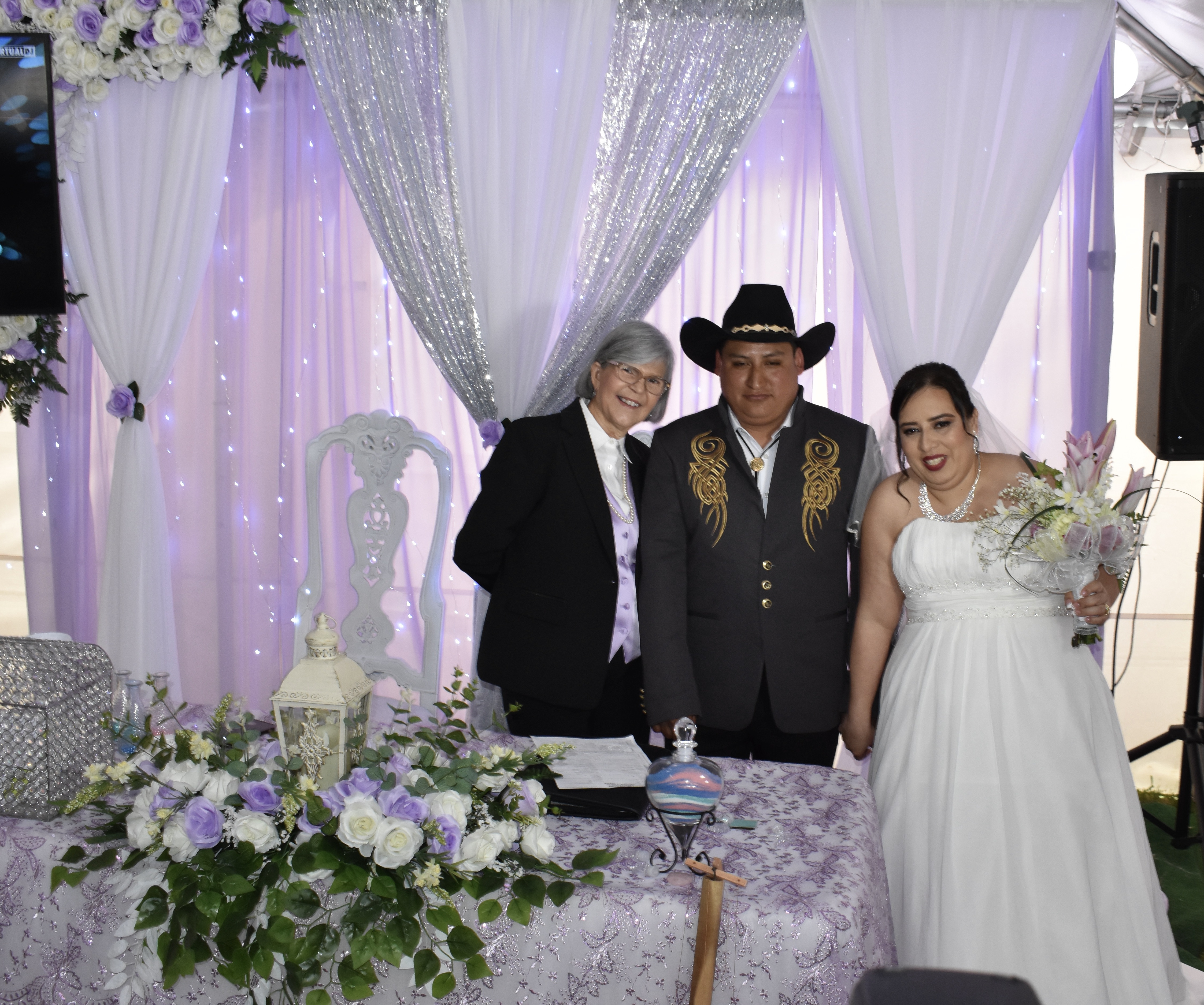 Alma Nayeli y Rafael son mexicanos. El novio y los caballeros de honor, vistieron con ropa típica de su país. Todo estaba lindamente decorado en fondo blanco con detalles lila, que fue el color de los trajes de las damas de honor. Los padres de la novia están en Mexico y enviaron unos lindos muñecos para ser colocados en el altar, representando la presencia de ambos. Tanto los padres de la novia, como del novio, estuvieron presentes por video llamada y pudieron enviarle bendiciones a sus hijos. Los novios tienen 13 años juntos, dos hijas y un bebe en camino. Una boda divertida, diferente y familiar. 15/4/23.
