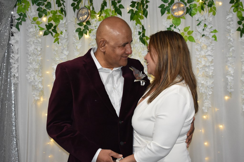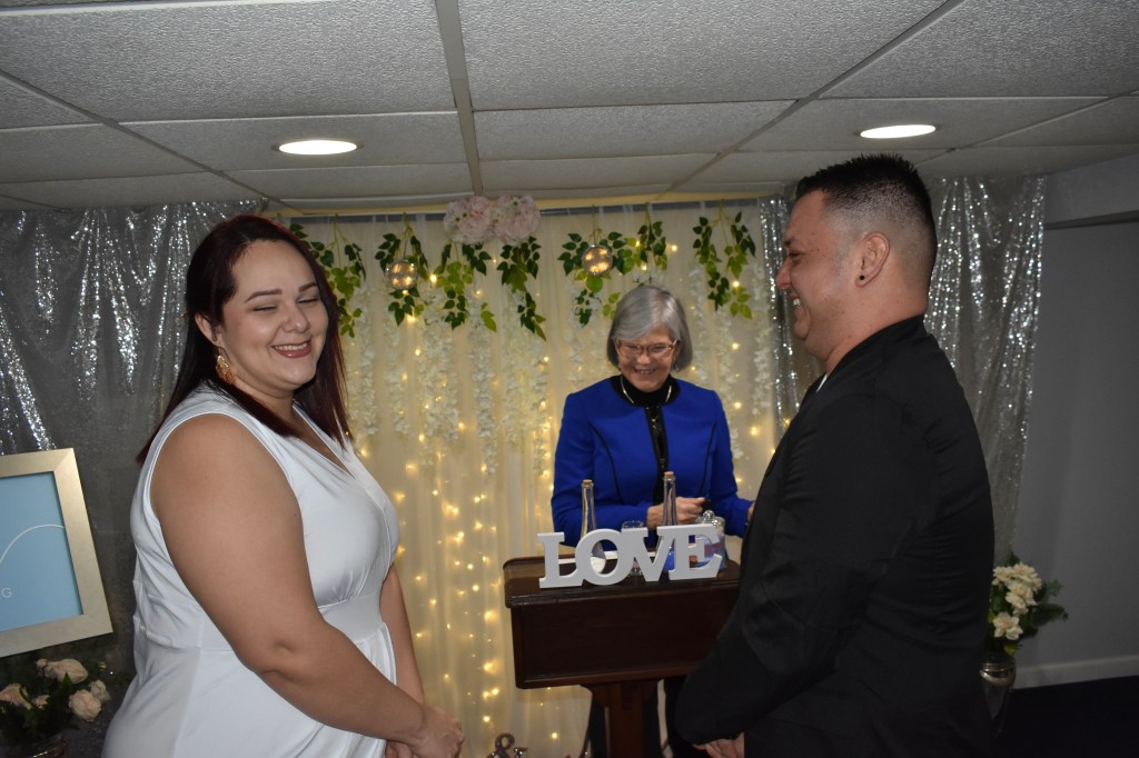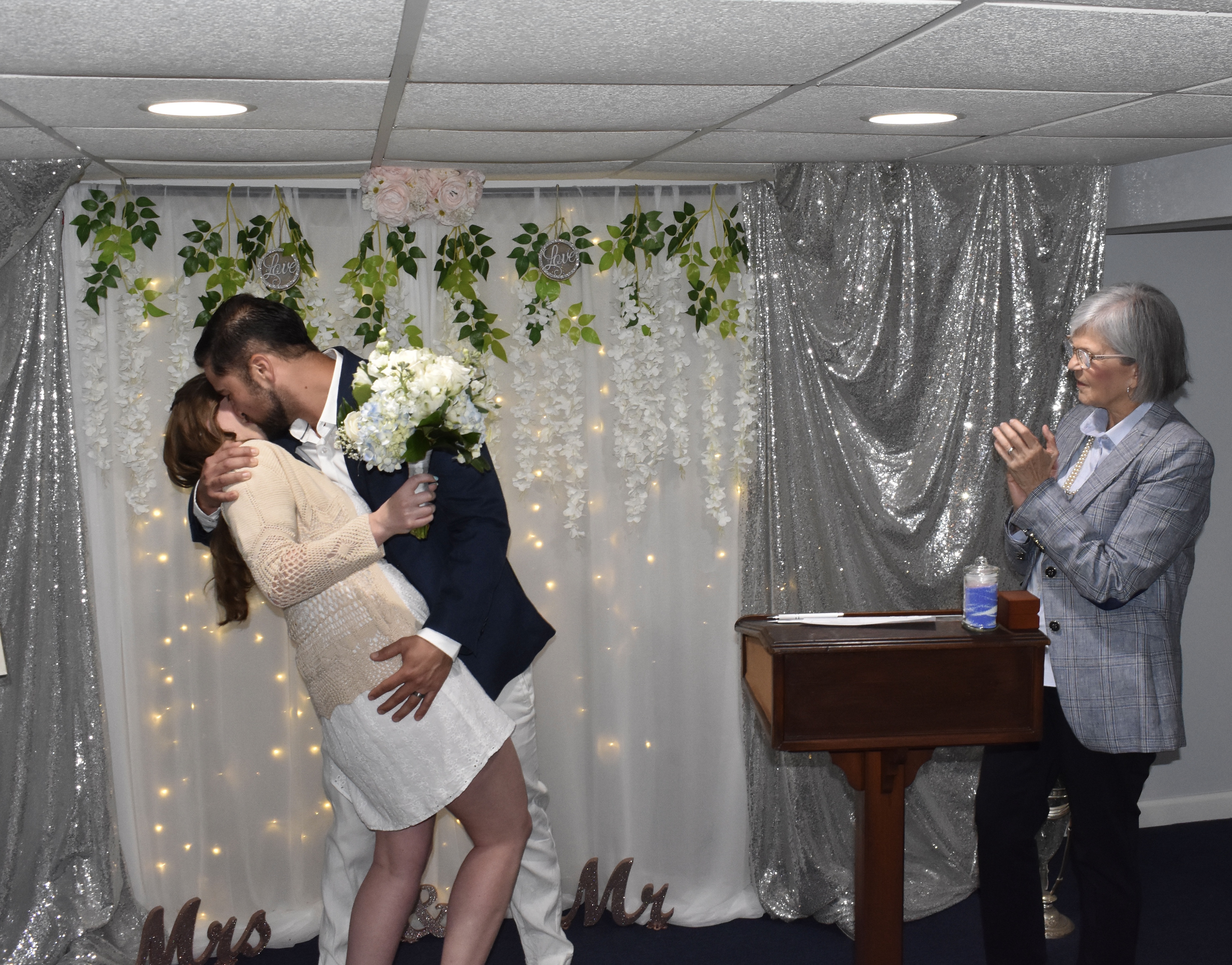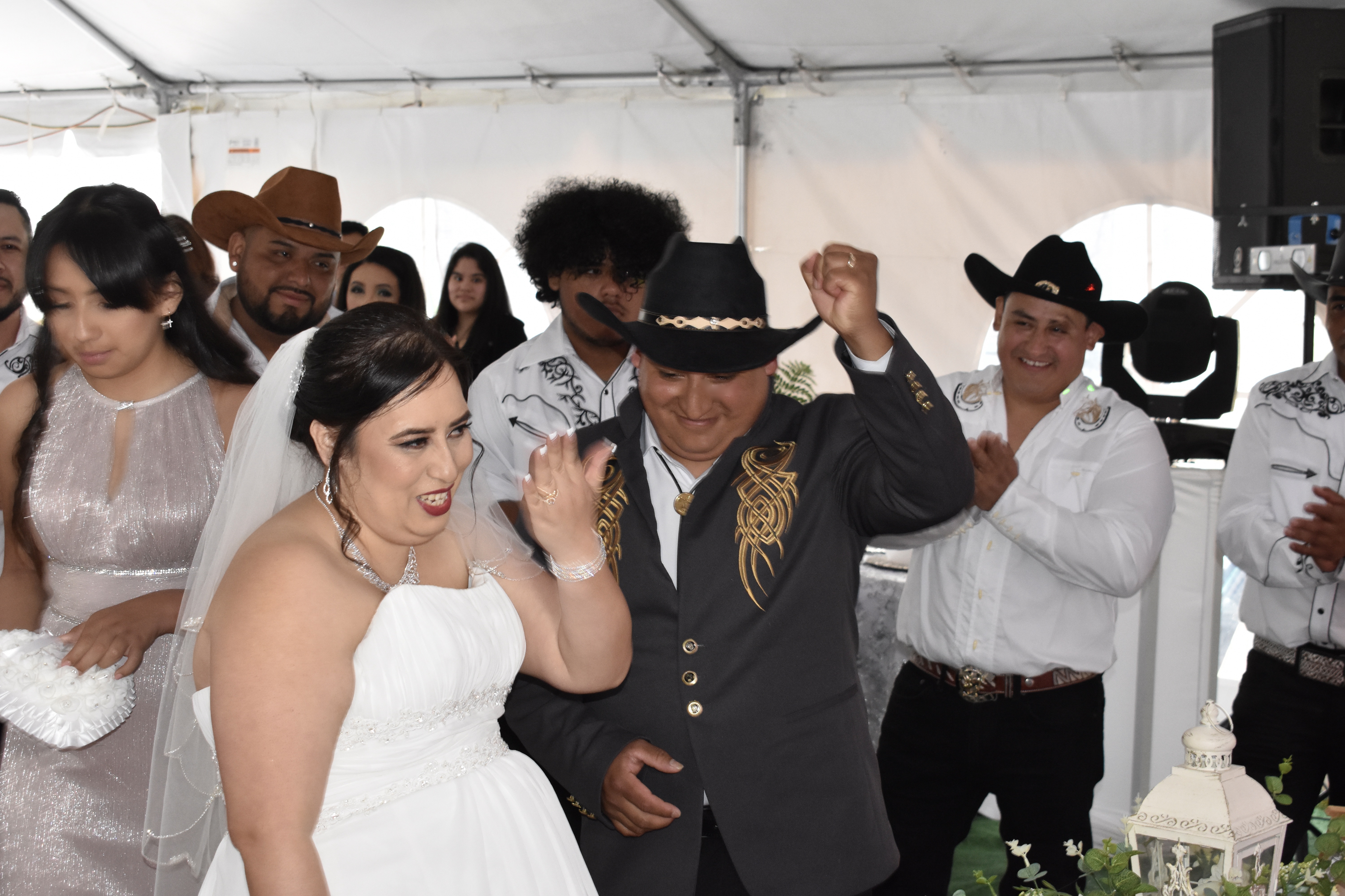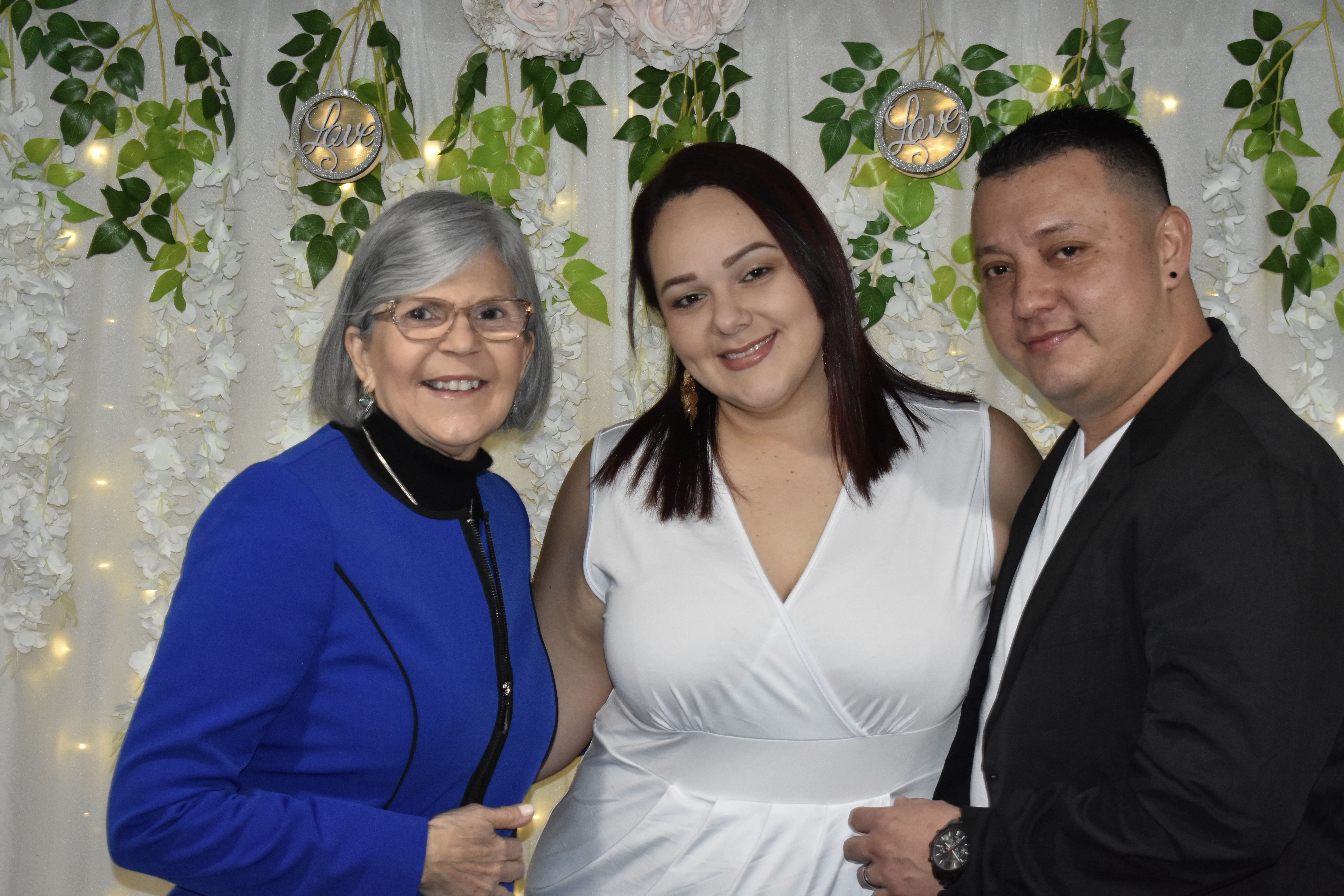 Alma Nayeli y Rafael son mexicanos. El novio y los caballeros de honor, vistieron con ropa típica de su país. Todo estaba lindamente decorado en fondo blanco con detalles lila, que fue el color de los trajes de las damas de honor. Los padres de la novia están en Mexico y enviaron unos lindos muñecos para ser colocados en el altar, representando la presencia de ambos. Tanto los padres de la novia, como del novio, estuvieron presentes por video llamada y pudieron enviarle bendiciones a sus hijos. Los novios tienen 13 años juntos, dos hijas y un bebe en camino. Una boda divertida, diferente y familiar. 15/4/23.