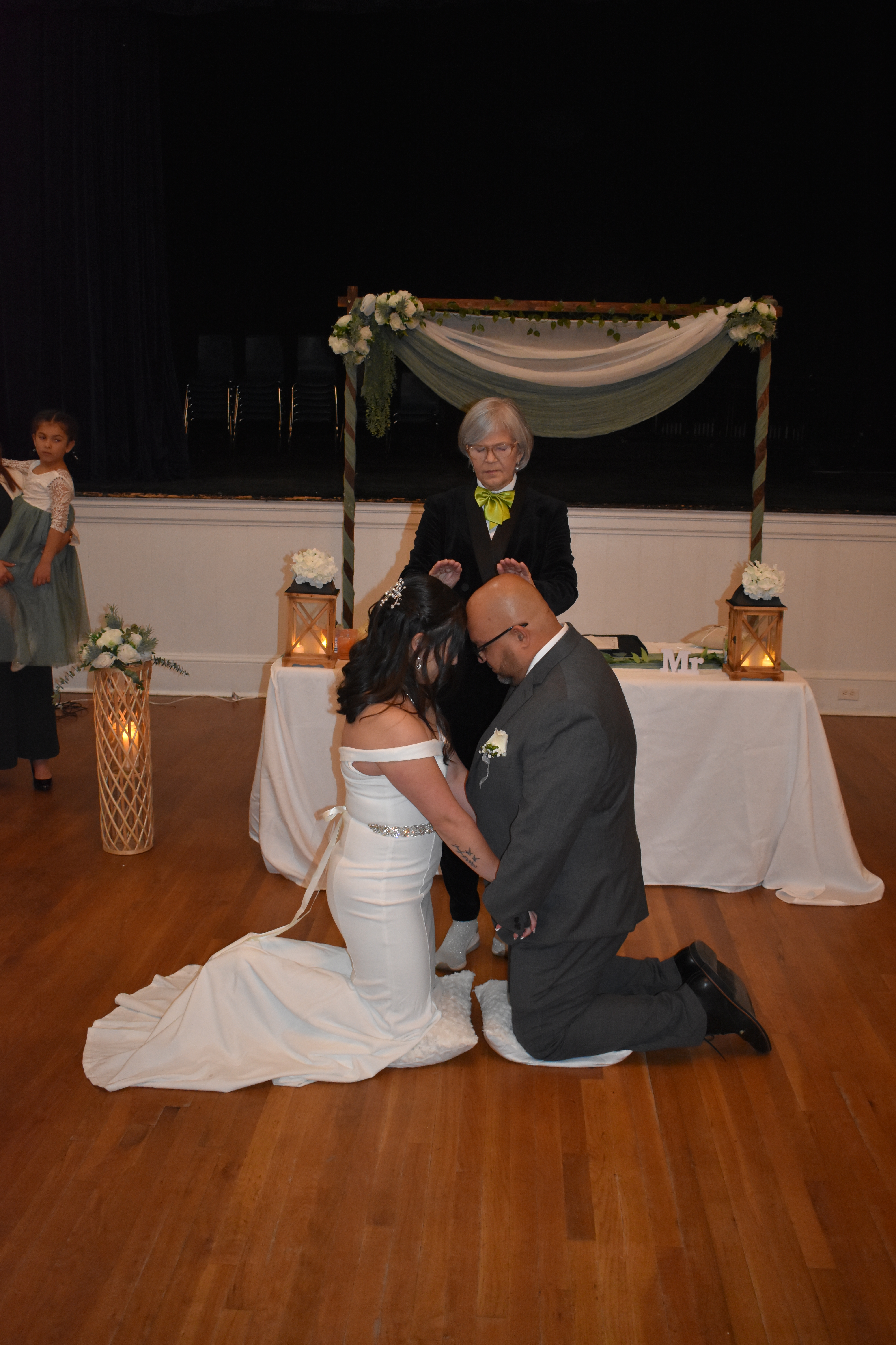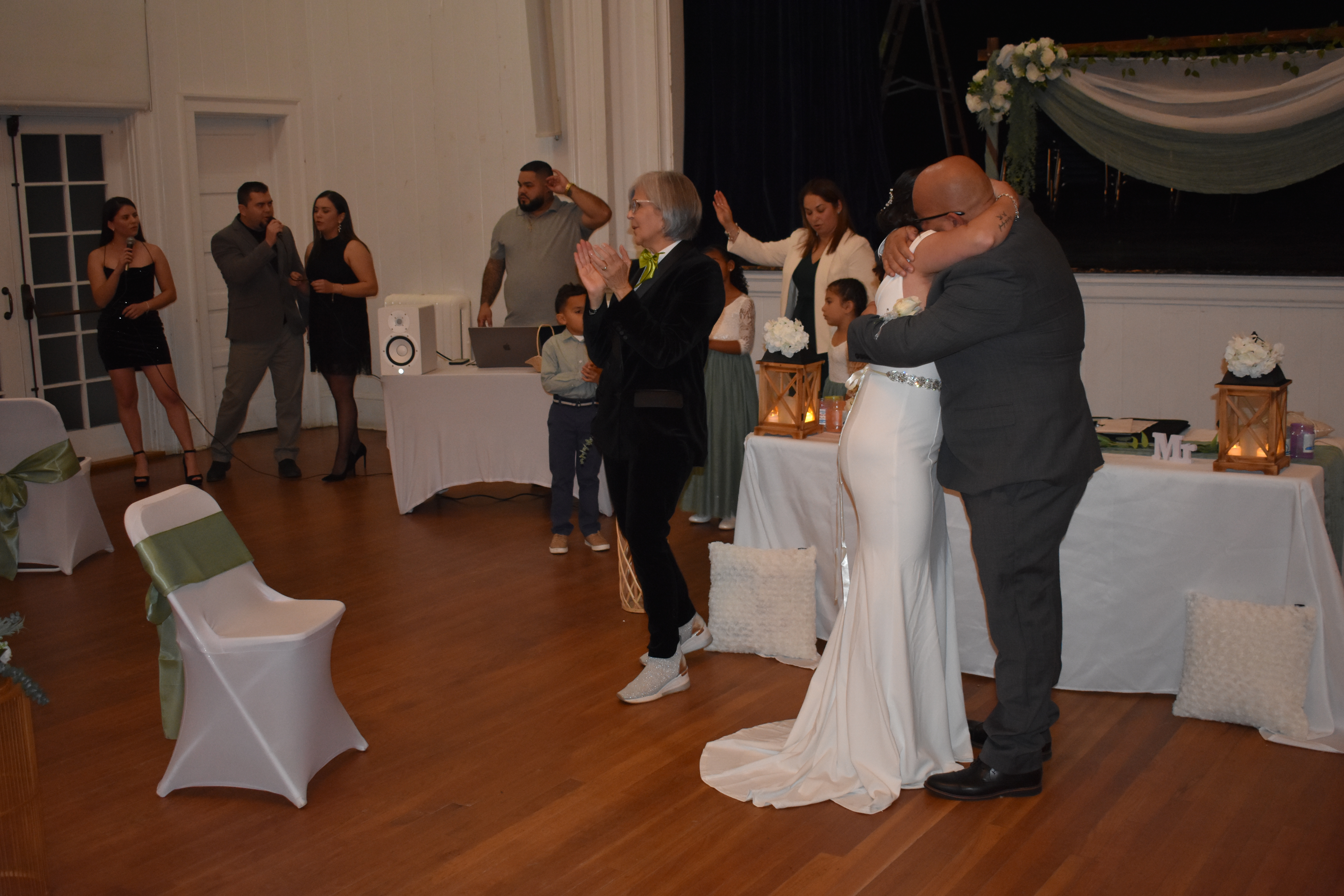El salón estaba lindamente decorado en tonos blancos con detalles verdes, mismo color que lucían las personas del cortejo. El novio, Wilber llegó con su madre, Geraldine, y su hijo, Noah. Las damas fueron, hija del novio, Sofia y dos hijas de ambos , Enma y Leah. Los testigos fueron hermanos de Wilber, Jeimy y Jesus. La novia, Eimy, fue entregada por sus padres, Carmen y Mario. Después de una boda llena de rituales y momentos hermosos, Vanesa, Dayana y Andres, primos del novio, cantaron Aleluya, trayendo emoción y admiración en todos los presentes. Mientras lo entonaban, los recién casados, recibieron bendiciones de Reiki, mientras oraban por el futuro de su familia.