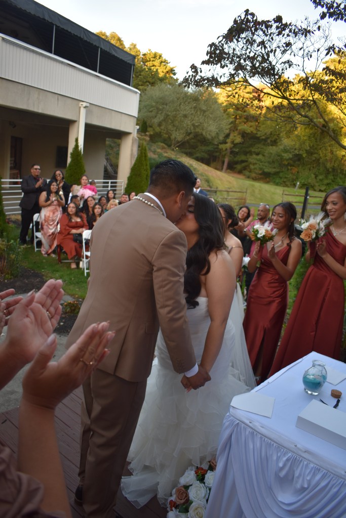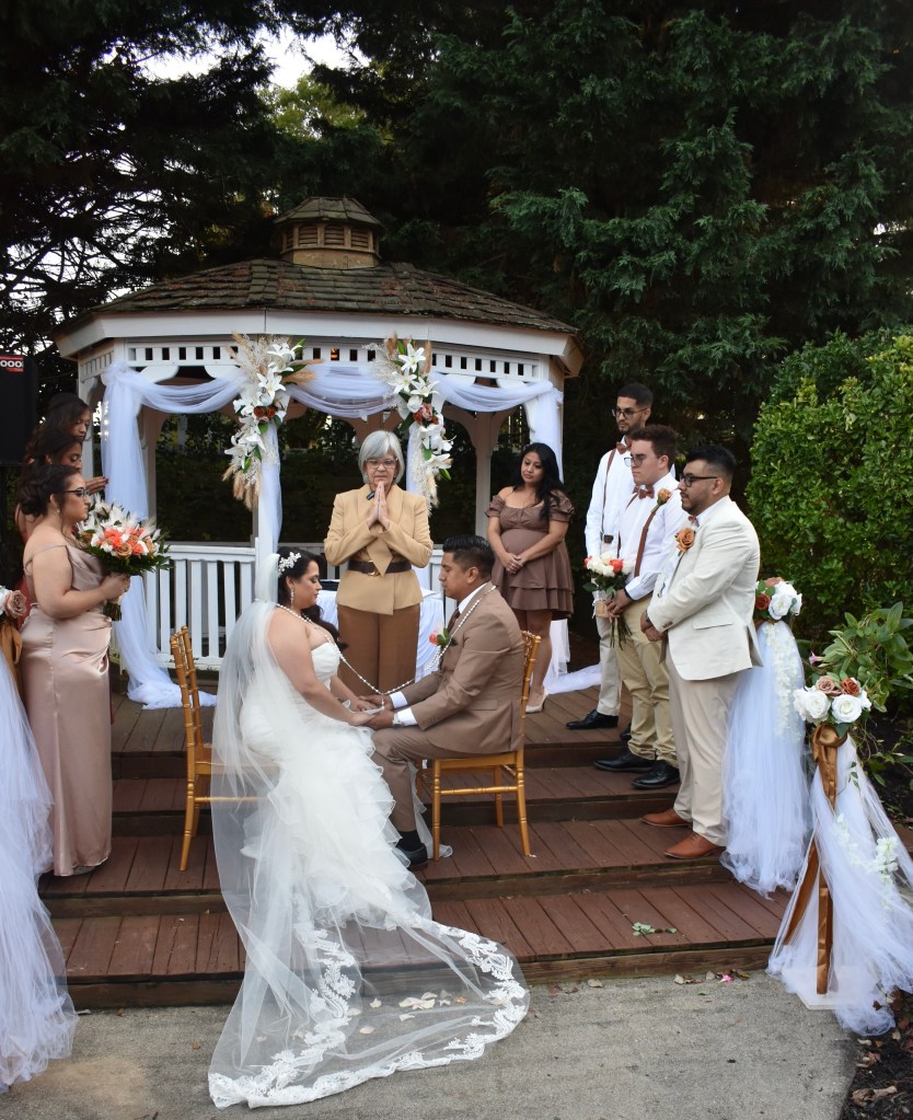 En el hermoso jardin del Restaurante Trio, en Patchogue, tuve el honor de casar a Jennifer, de Puerto Rico, con Andres Ivan, de Mexico. Los tonos del vestuario de novio y cortejo, y la decoración fue con detalles dorados. Excelente elección para una boda en otoño. Todo lucia brillante y maravilloso. Una hermosa ceremonia que recordaran por siempre. Mi voz estuvo acompañada por la musica de piano y violines.