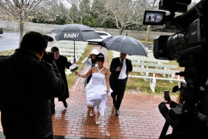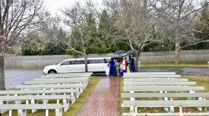 A las dos en punto, llegué al Wagner Cove con mi esposo.  Para nuestra sorpresa, encontramos una pareja con dos hijos adolescentes; eran turistas que venían de Dubai y se acobijaban de la lluvia en el pequeño lugar.  Les contamos que íbamos a hacer una boda, sonrieron emocionados de poder verla, participar como testigos e inclusive aguantar los paraguas para que los novios se mojaran lo menos posible.