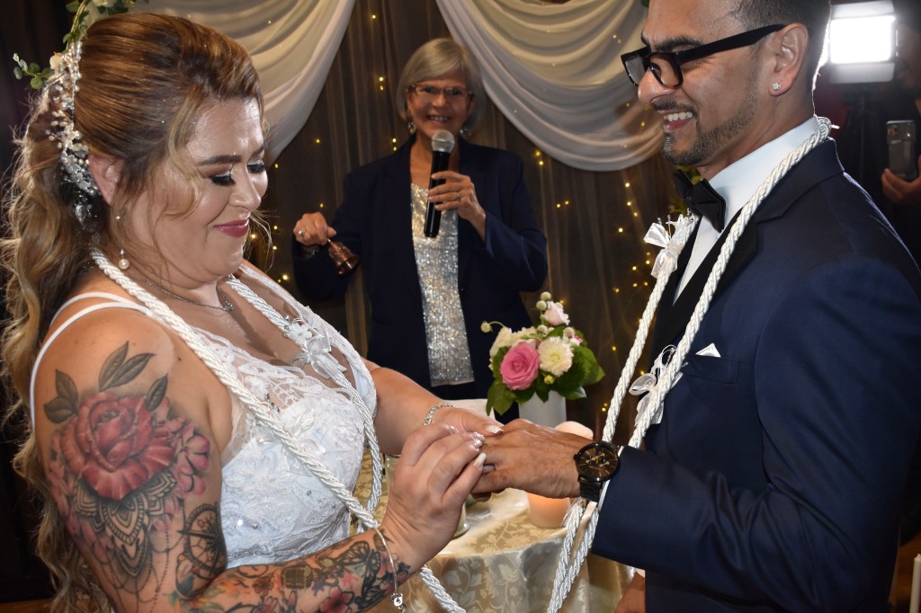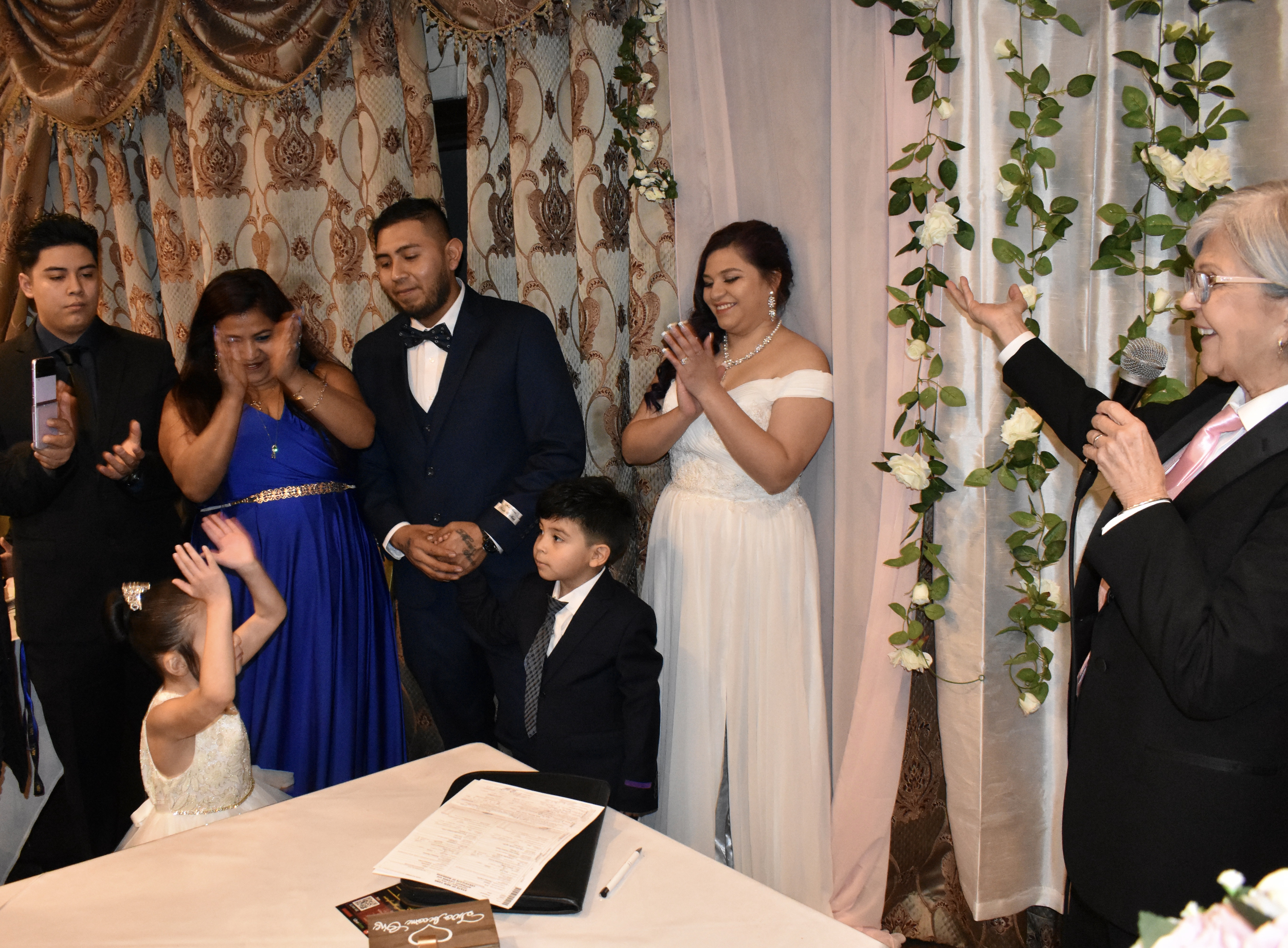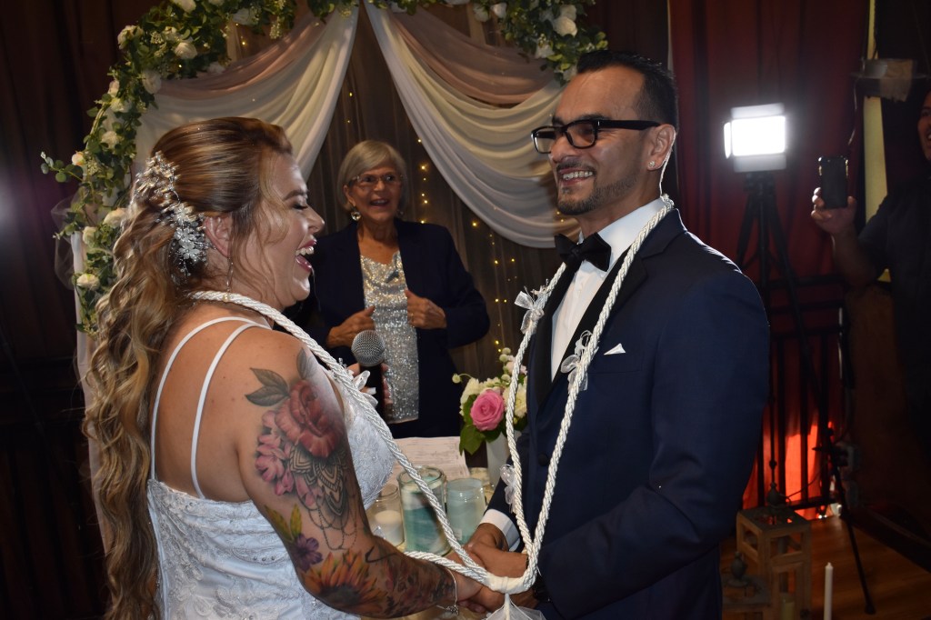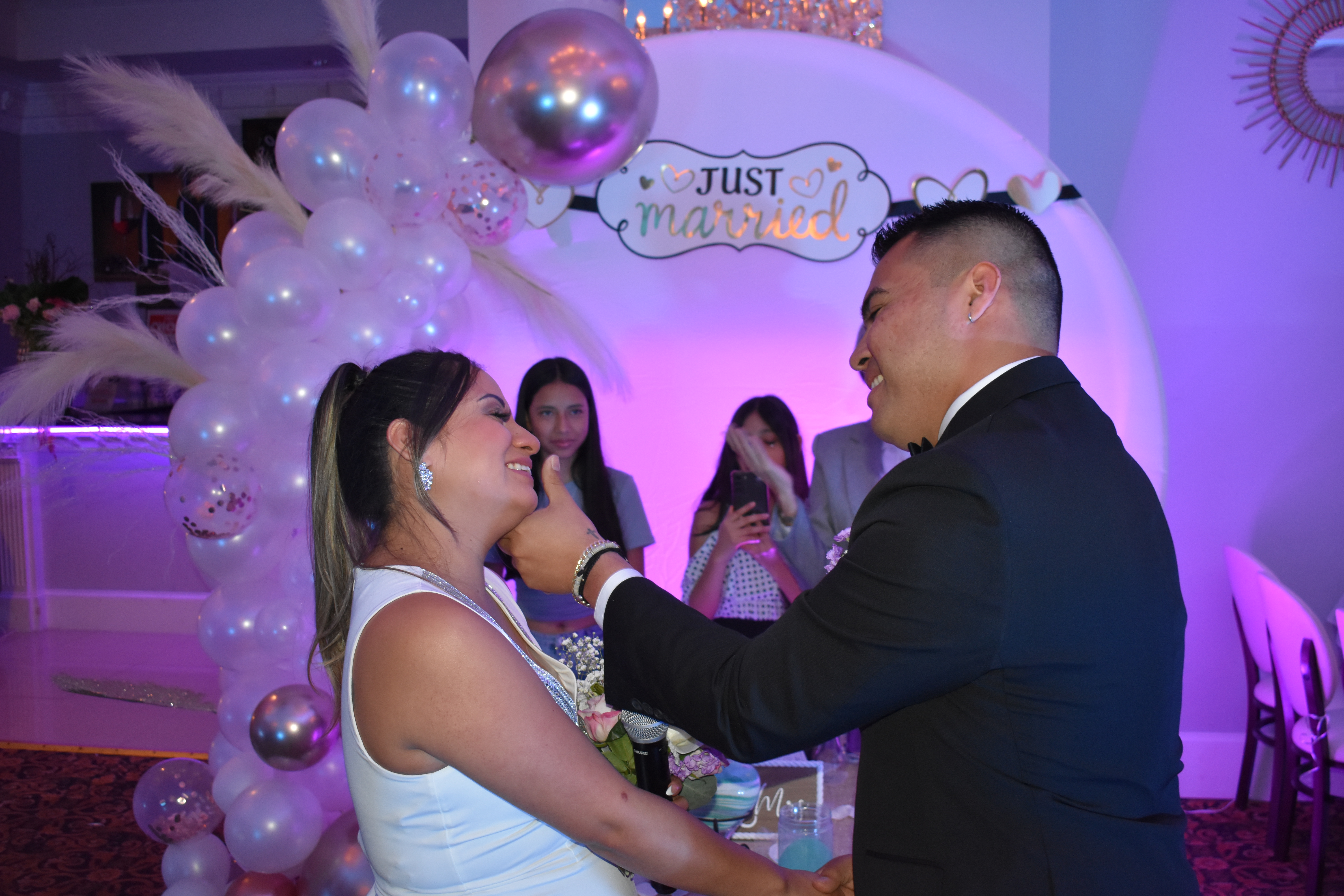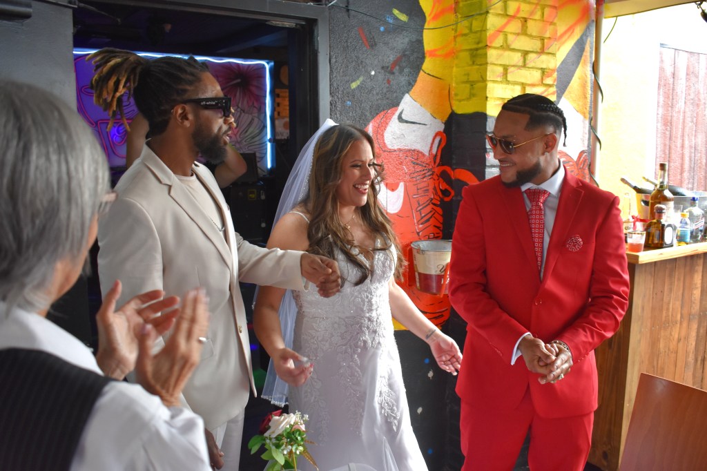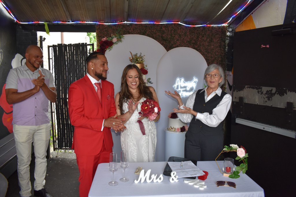En Long Island, es usual, que se casen personas, con diferentes nacionalidades. Ver la union de culturas en las bodas es sublime. Amanda nació en New York, de padre mexicano y madre americana. Angel es dominicano y sus padres también. La boda fue bilingüe para entendimiento de los presentes. El evento se realizó en Copas Bar, restaurante dominicano. Un ambiente alegre y festivo con decoración en rojo, color del traje del novio.