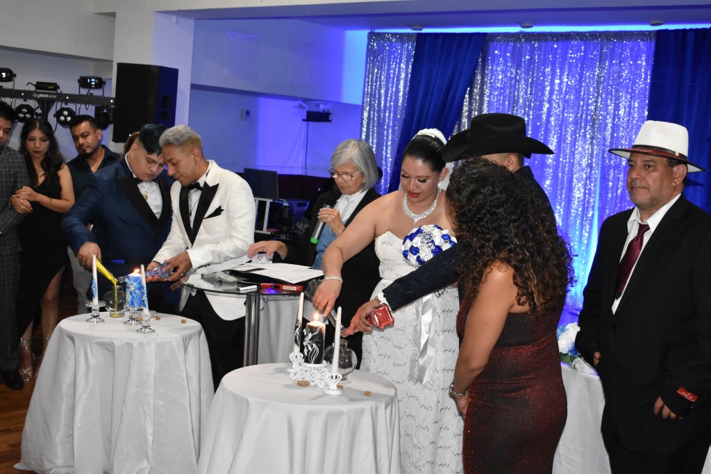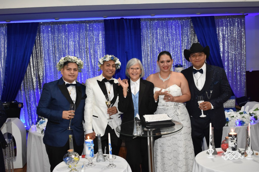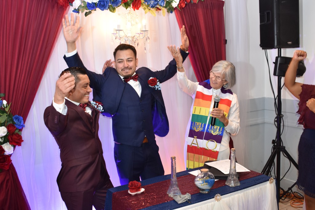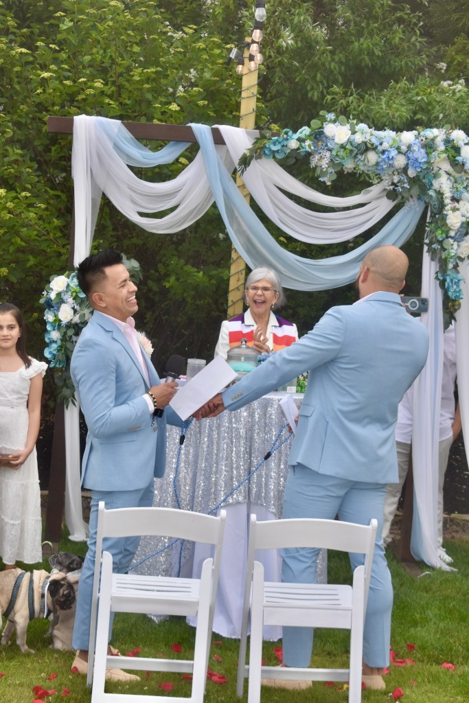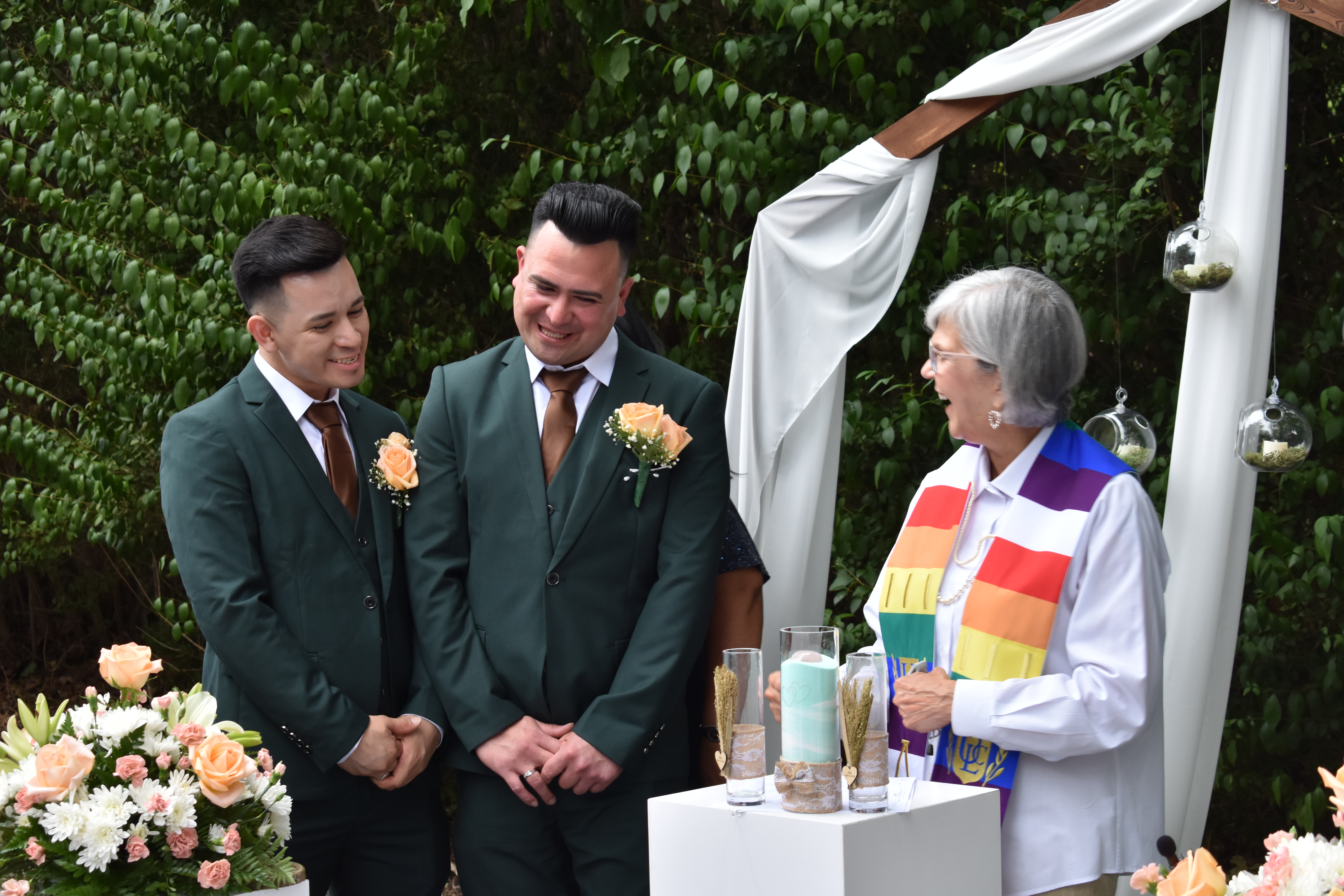 Hacer una boda doble es para parte de la diversión de consentir a las parejas y lograr eventos diferentes. Ambas parejas son muy divertidas y el buen humor reinó en todo el evento. Eric y Luis se conocieron online, tienen un año de noviazgo y Luis viajó desde Peru para casarse con Eric. Giessy Edwin se conocieron online tienen siete meses de noviazgo. Las dos parejas estaban ubicadas a cada lado de mi persona, con su propia mesa para rituales. Compartieron hacer arena, velas y cristal del amor. Eric y Luis hicieron la. coronación de las rosas. Al final de la ceremonia, de inmediato hicimos un brindis por el futuro de las dos parejas.