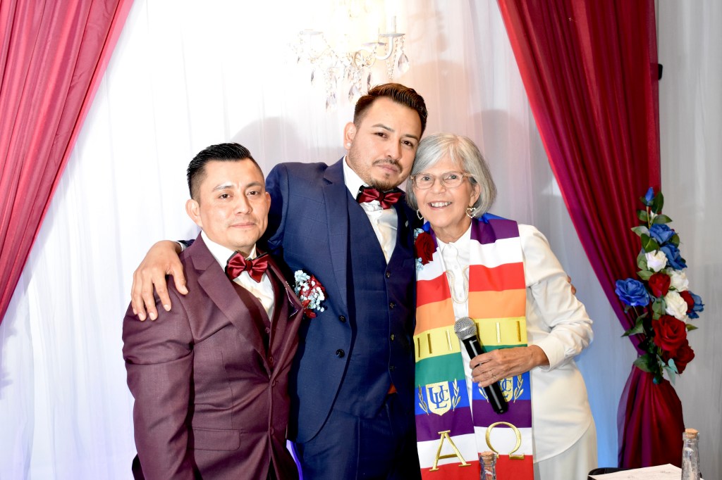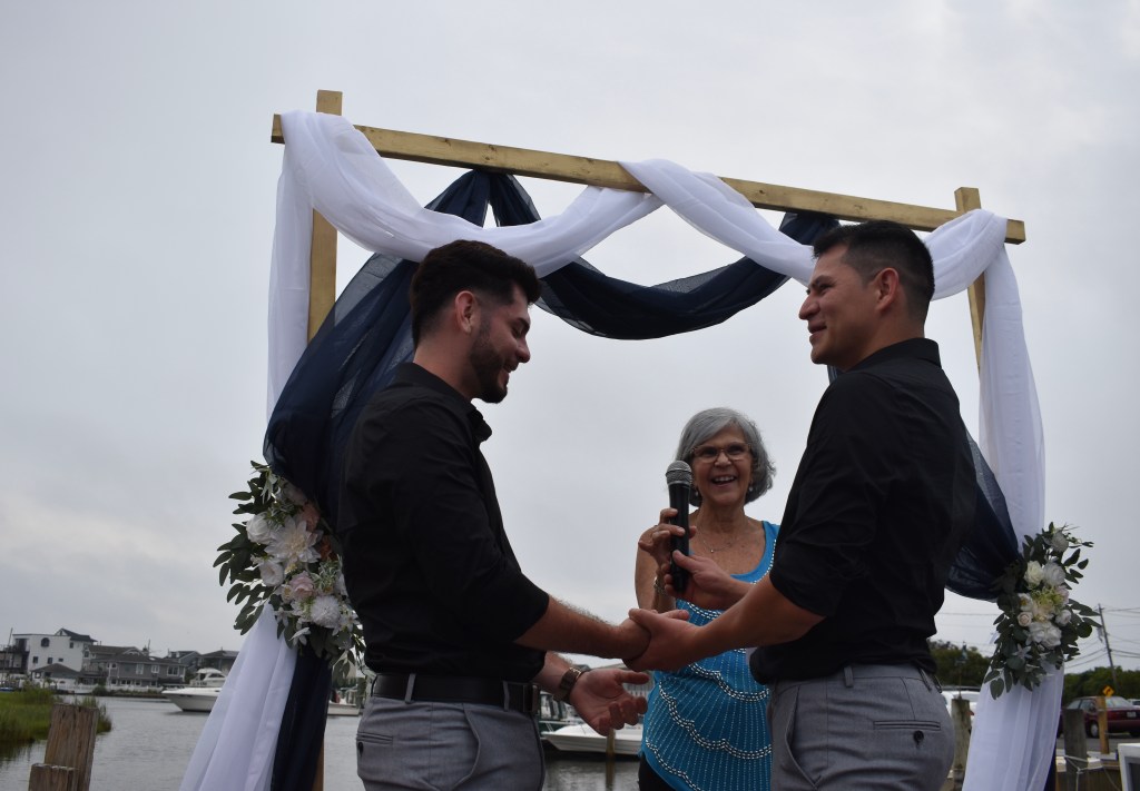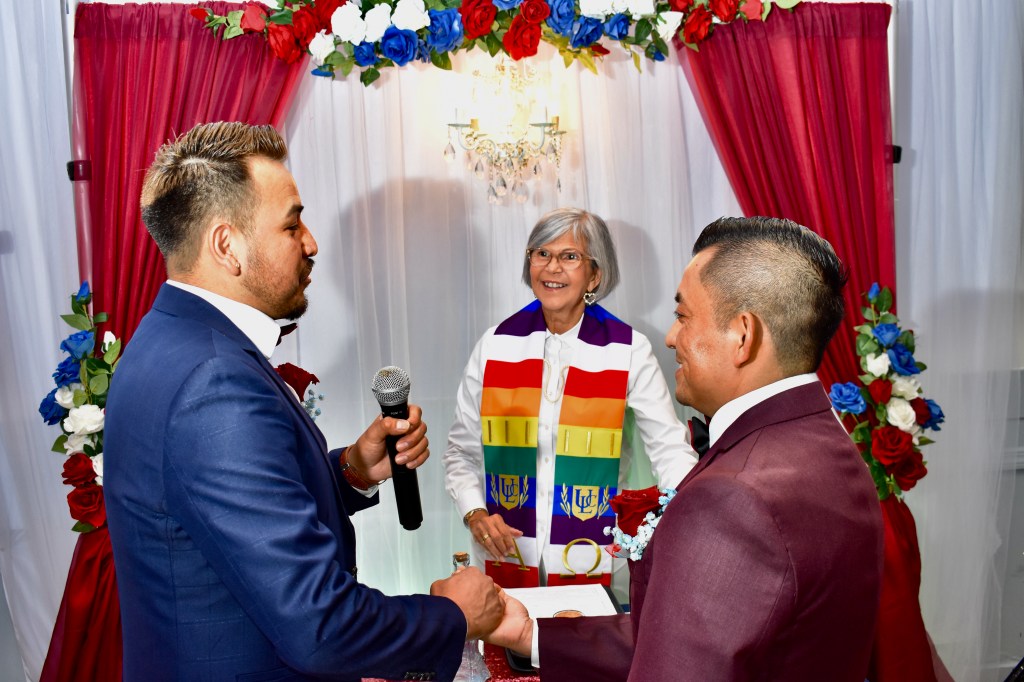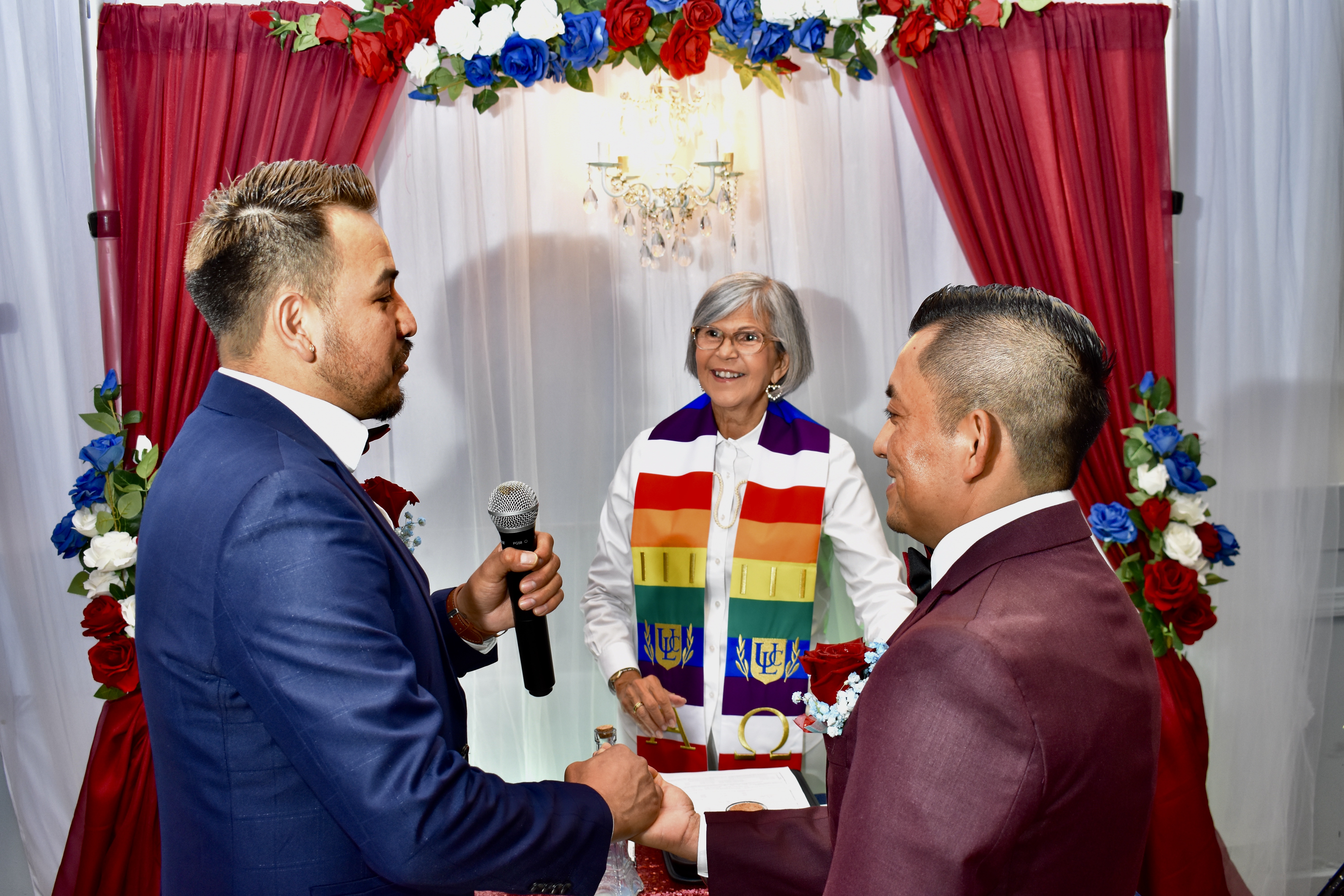 Hacer una boda doble es para parte de la diversión de consentir a las parejas y lograr eventos diferentes. Ambas parejas son muy divertidas y el buen humor reinó en todo el evento. Eric y Luis se conocieron online, tienen un año de noviazgo y Luis viajó desde Peru para casarse con Eric. Giessy Edwin se conocieron online tienen siete meses de noviazgo. Las dos parejas estaban ubicadas a cada lado de mi persona, con su propia mesa para rituales. Compartieron hacer arena, velas y cristal del amor. Eric y Luis hicieron la. coronación de las rosas. Al final de la ceremonia, de inmediato hicimos un brindis por el futuro de las dos parejas.