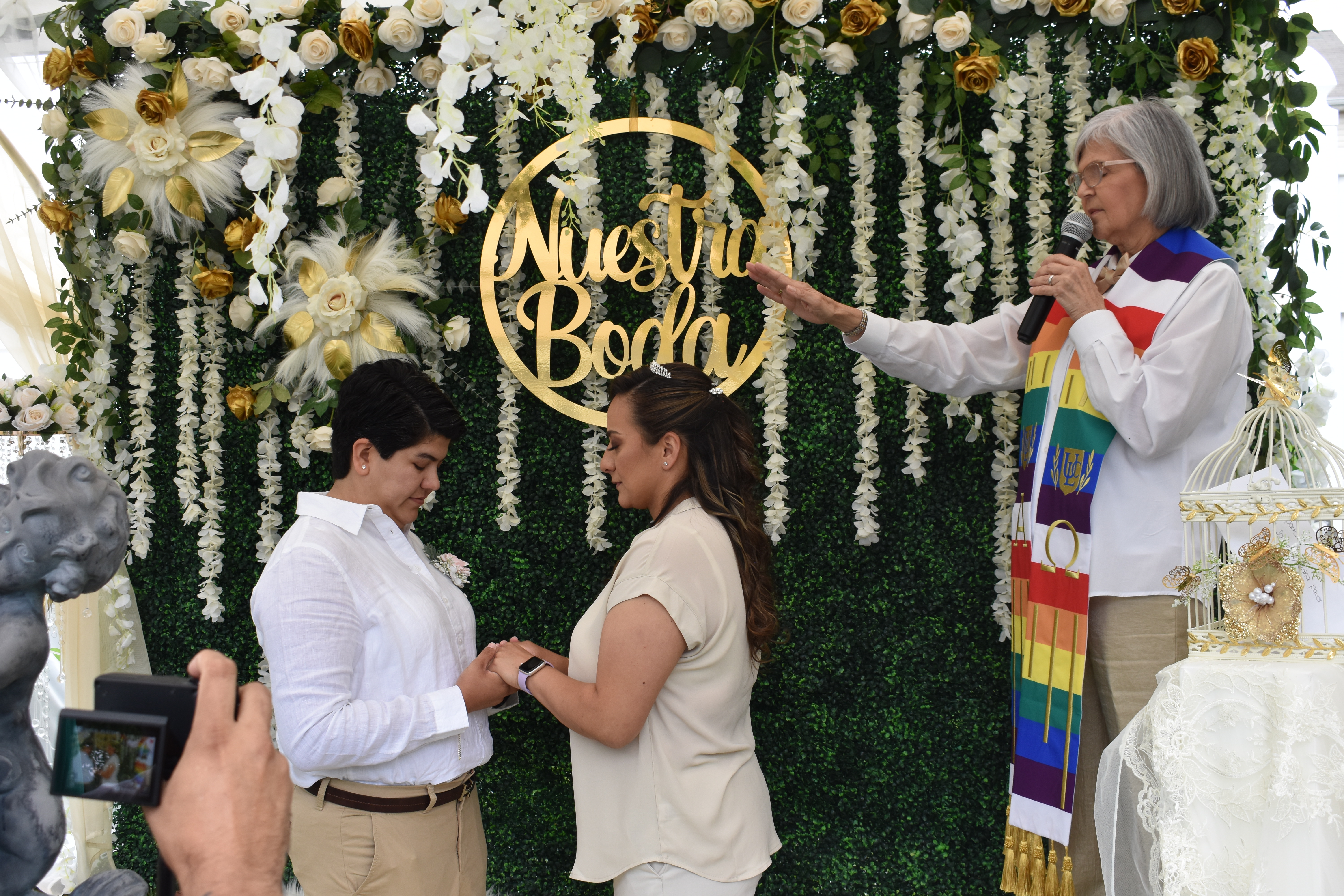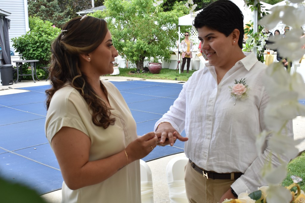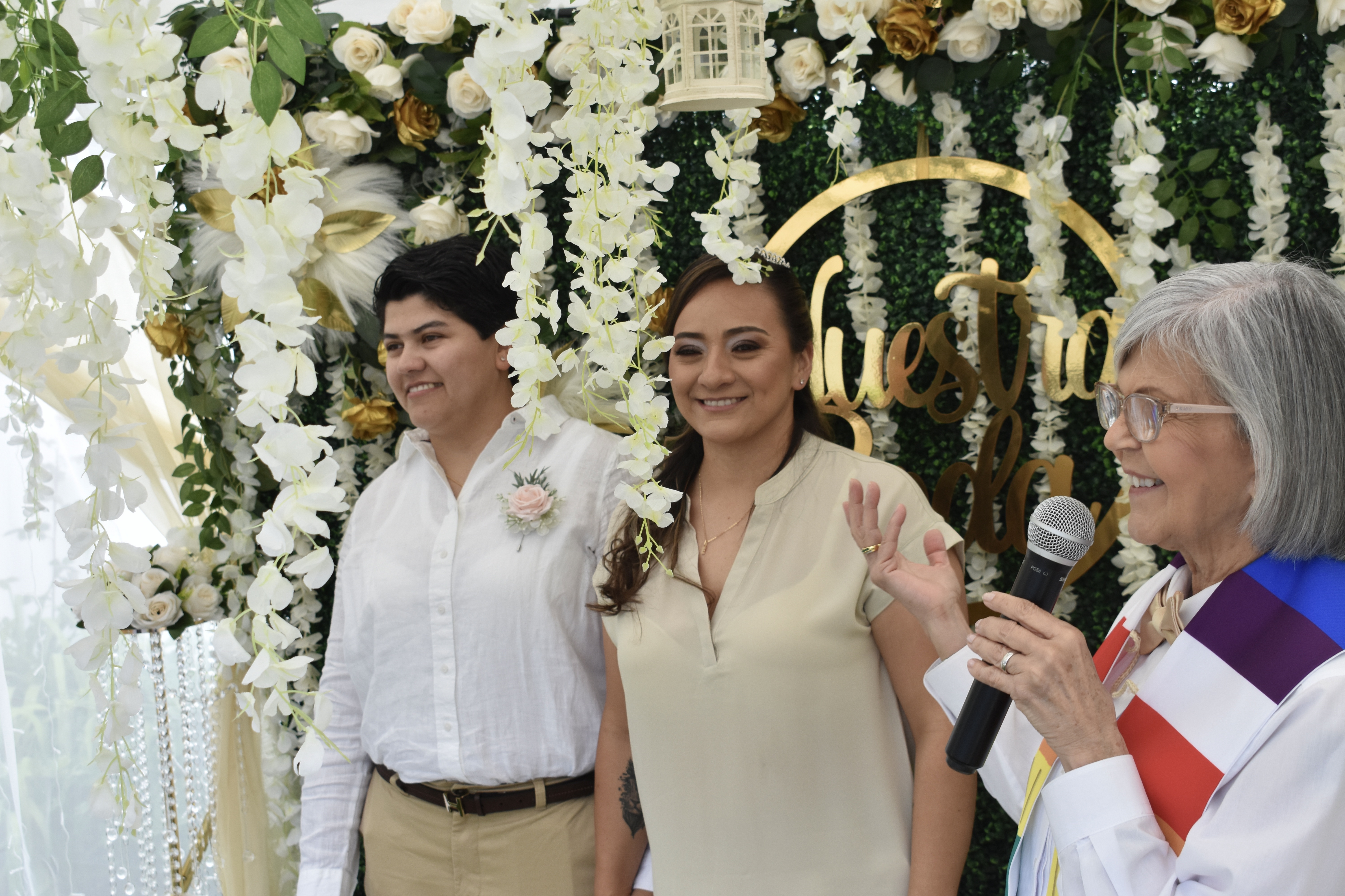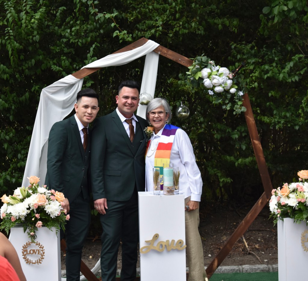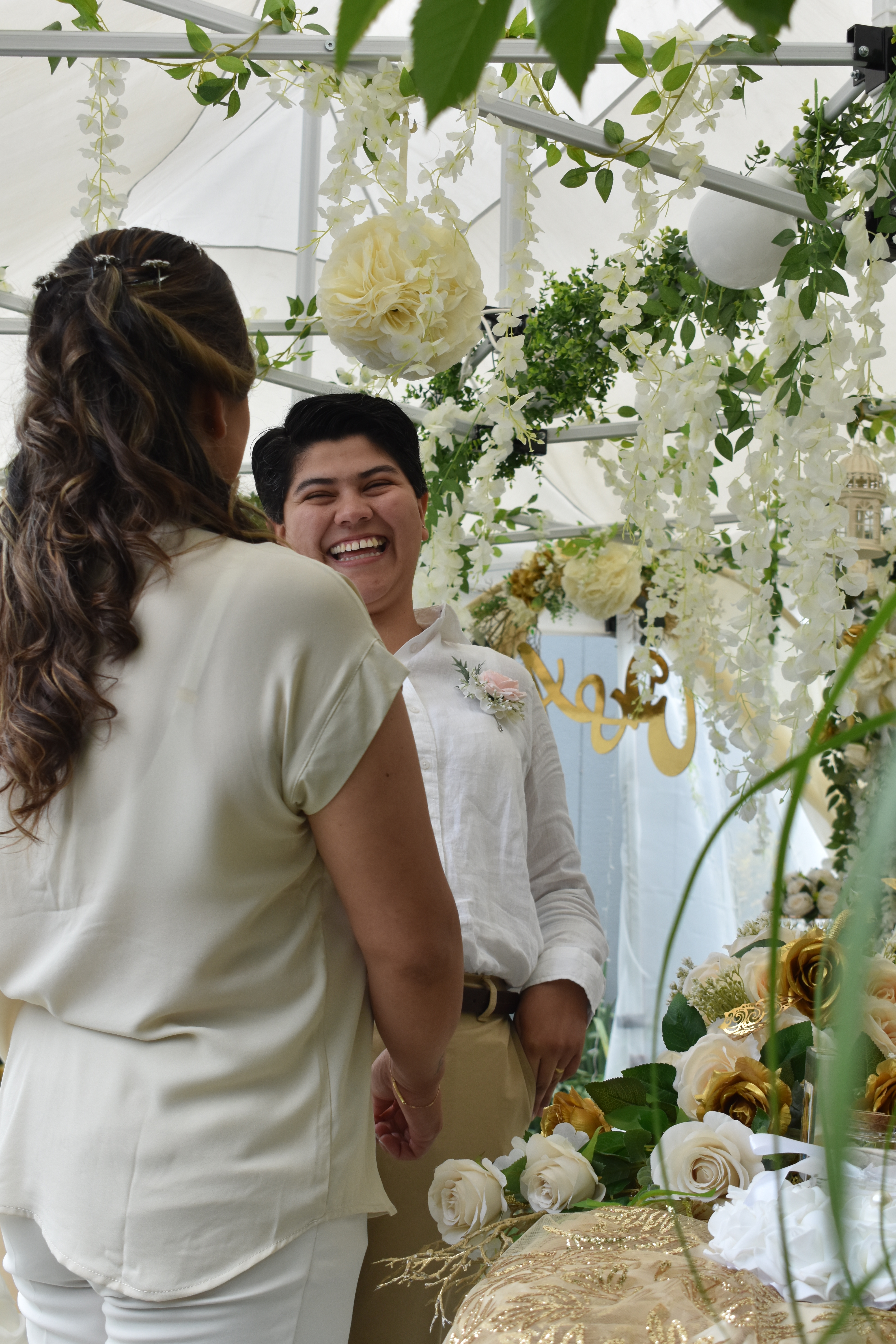 El 3 de junio, 2023 tuve el placer de visitar el jardin del hogar de las novias. Una decoración espectacular realizada por Natasha Contreras de G.A.C. Party. Las novias escogieron el 3 de junio por celebrar el 7mo aniversario de su relación. Realizamos la ceremonia de la arena, cristal del amor y bendiciones de Reiki y Dios. Los familiares desde Colombia, hablaron por video llamada. Adriana entro acompañada de su sobrino Ali Ruiz. El sobrino de Edna, Samuel Pava, trae lo anillos. Los testigos fueron Sina Sanchez y Ramiro Zumba. Edna entró escoltada por su hermana, Zulena Pava.