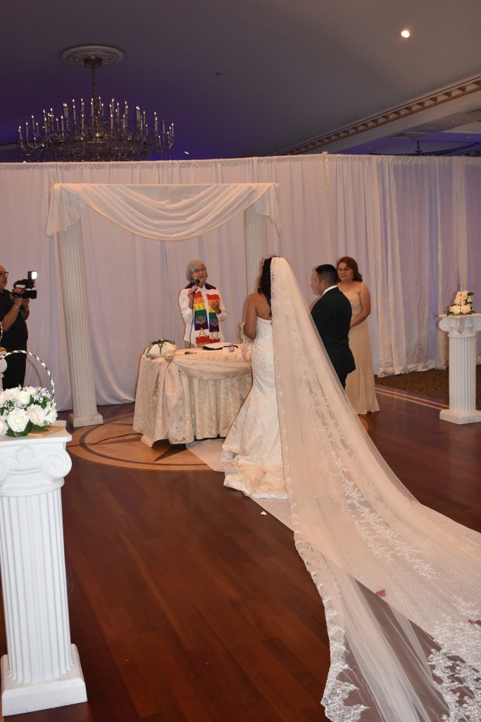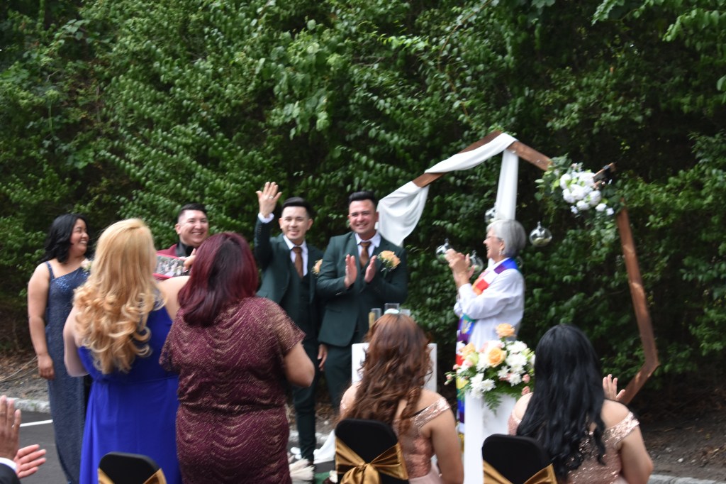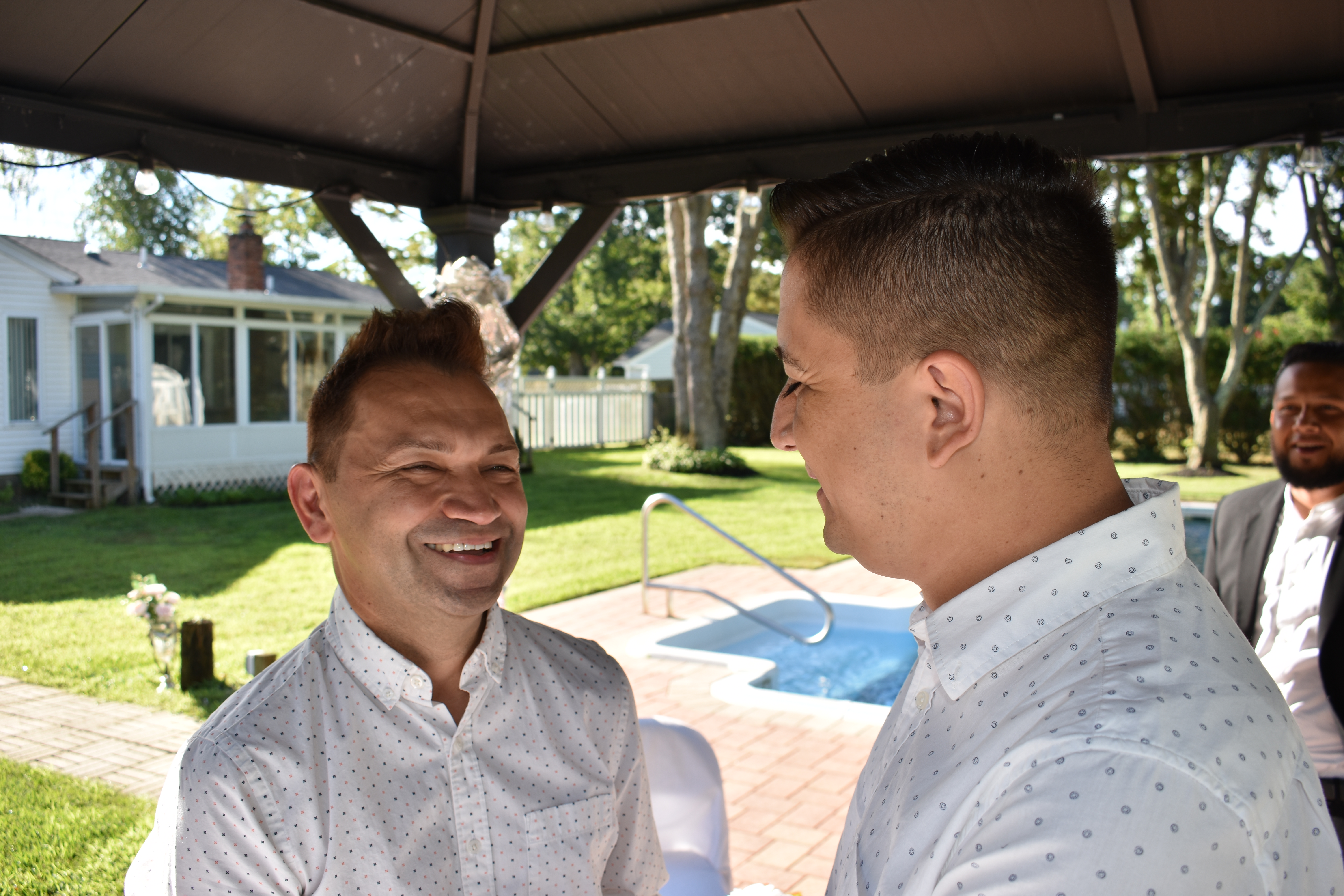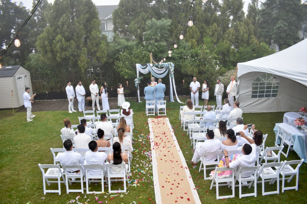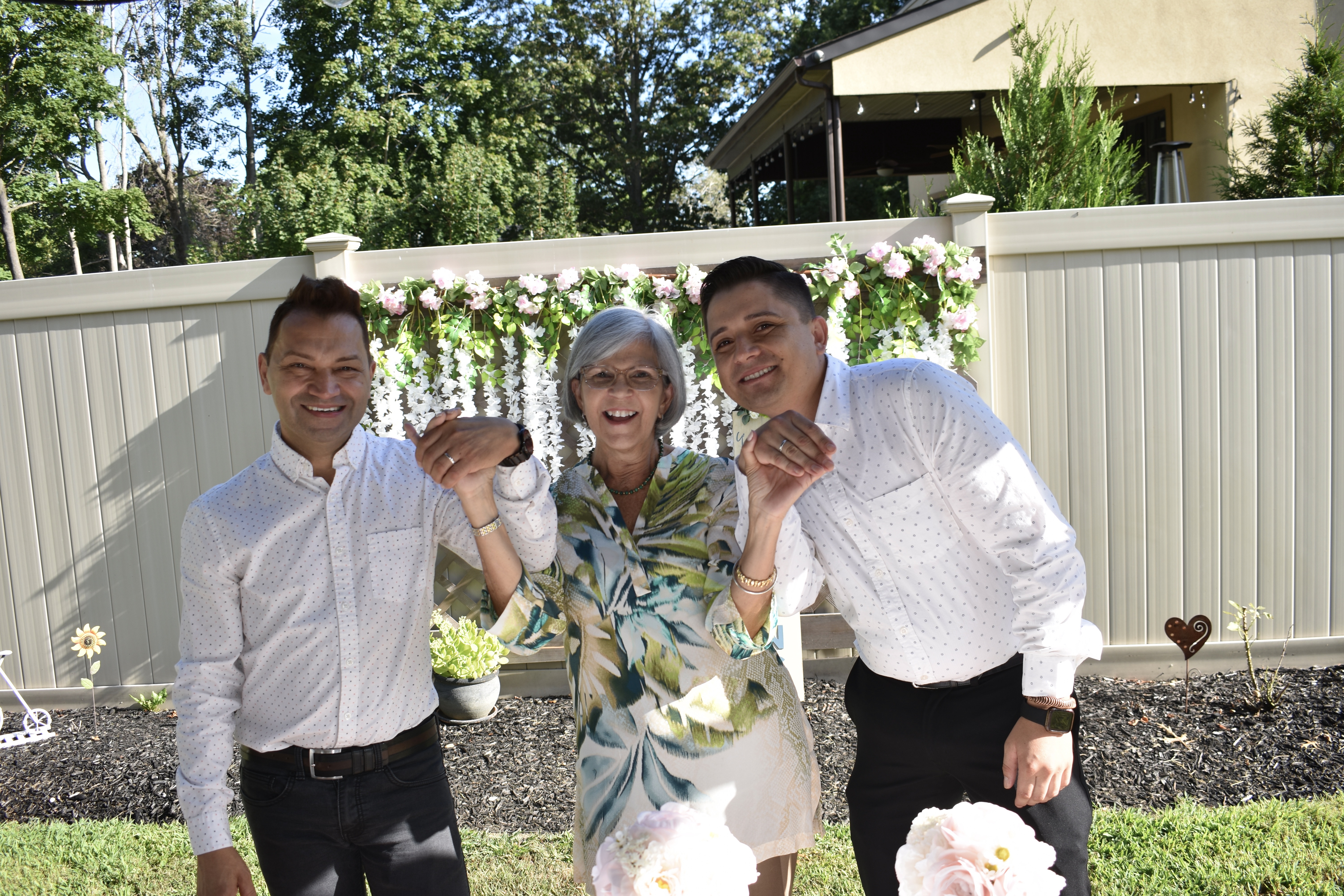 “Catorce años y los que faltan” me contestan los novios, cuando les pregunto: “¿cuanto tiempo tienen juntos?”. Carlos y Zahir, se conocieron online, en su país natal, Colombia. Después de siete años de noviazgo, Carlos se viene a New York. El amor sigue a pesar de la distancia y dos años después, Zahir logra venirse y logran su sueño de estar juntos. El 12 de junio, 2023, después de 14 años de amor, la adopción de dos perritos, que participaron en la ceremonia, y festivos amigos que alegraban el evento, ambos dijeron el “si acepto”. Una linda decoración en blanco, igual color de la vestimenta de los invitados, excelente humor y gran alegría. Felicidades !! PD: ya anteriormente he casado dos familiares de Zahir. Me encanta realizar bodas en familias tan unidas y lindas.