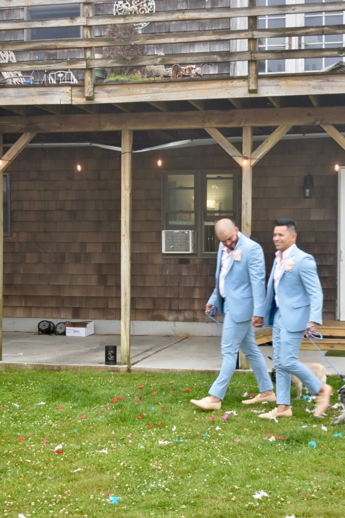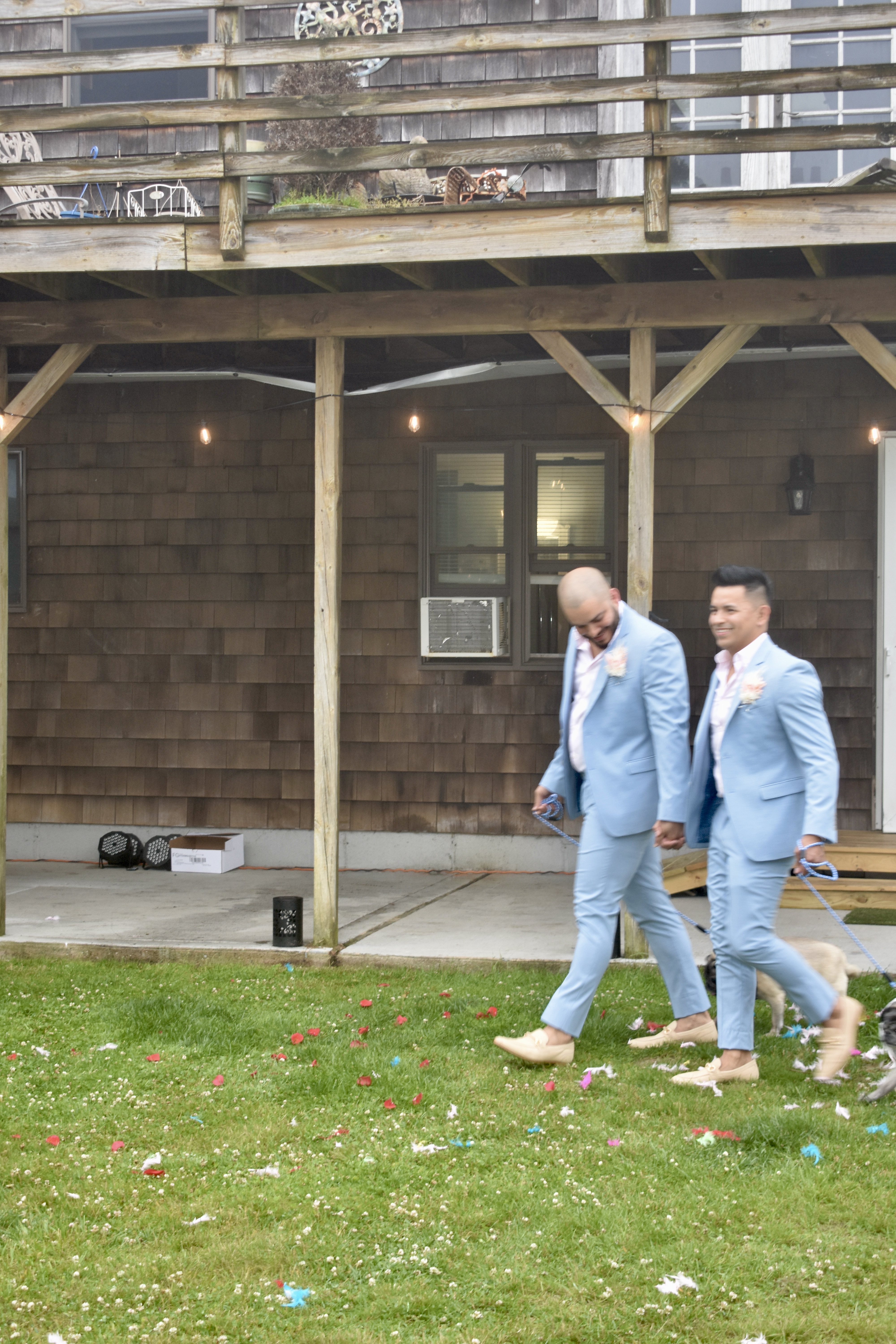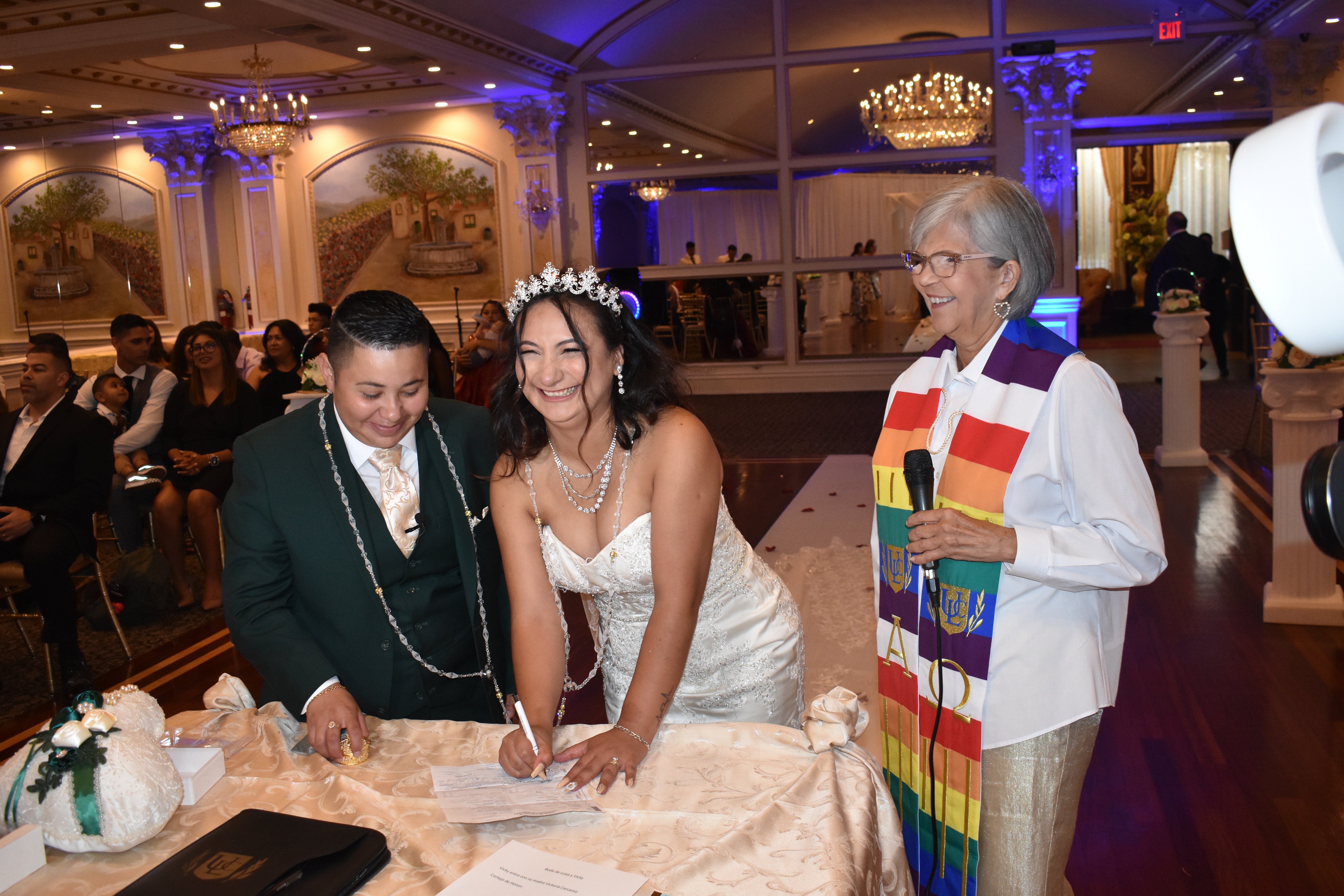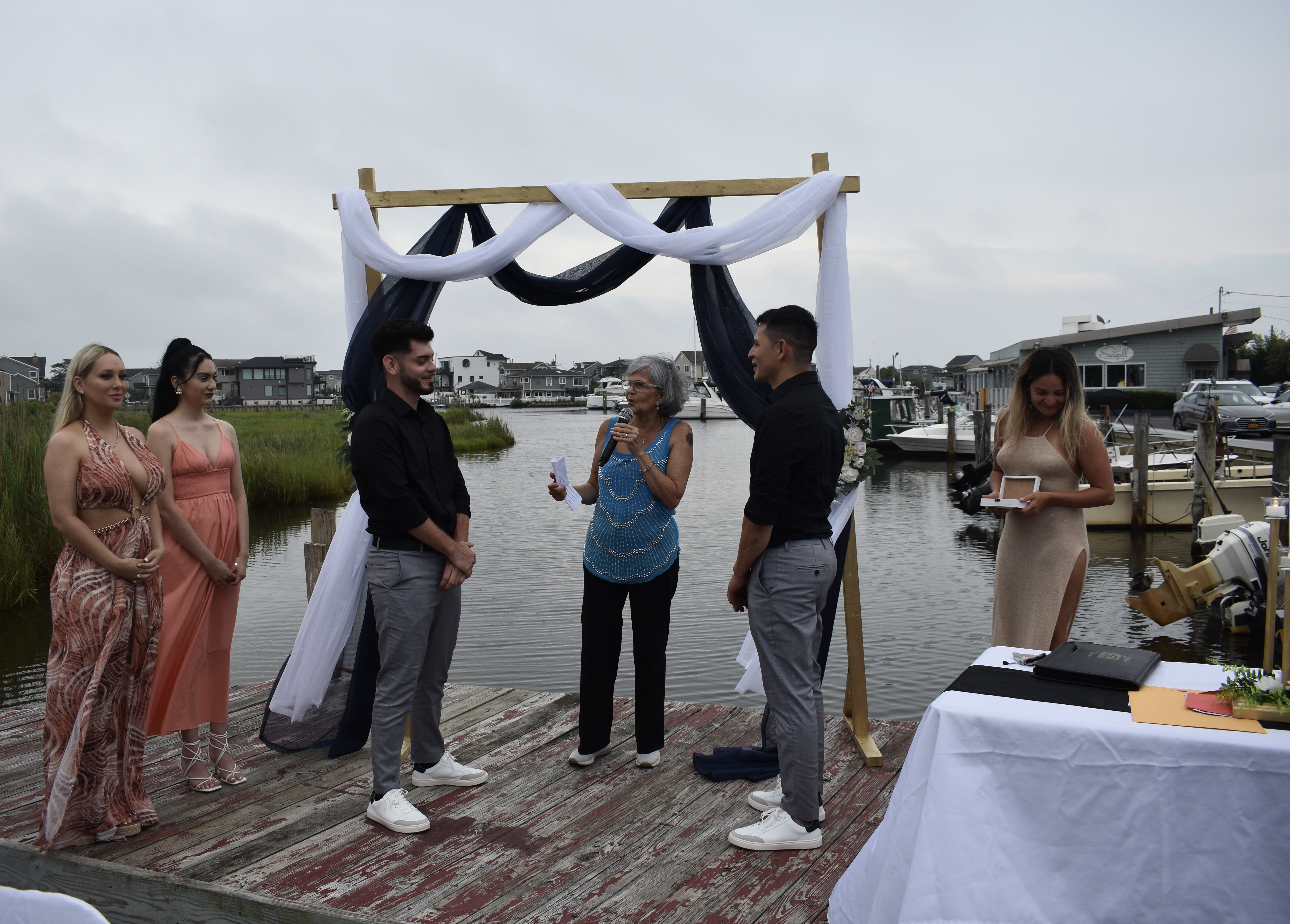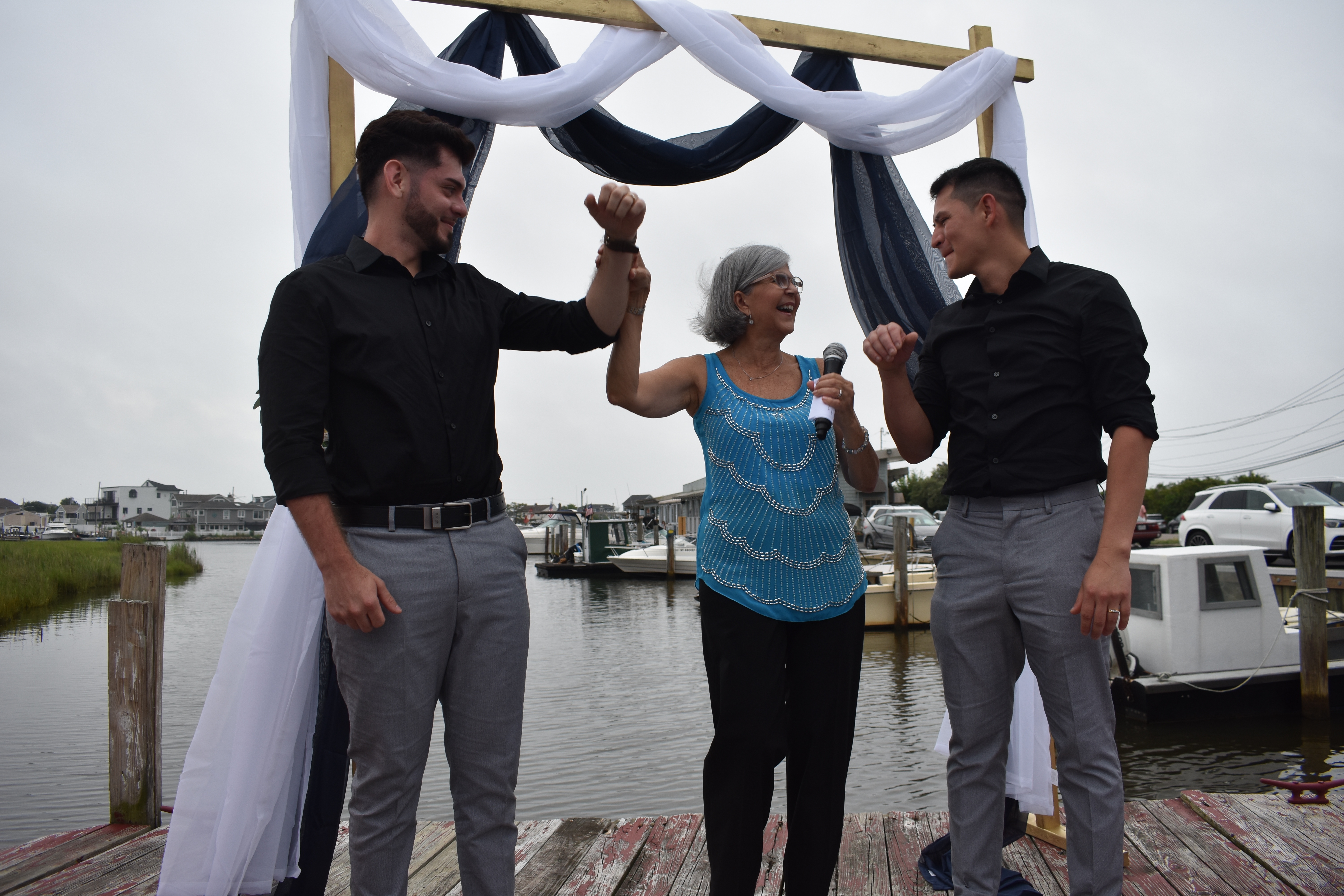 “Catorce años y los que faltan” me contestan los novios, cuando les pregunto: “¿cuanto tiempo tienen juntos?”. Carlos y Zahir, se conocieron online, en su país natal, Colombia. Después de siete años de noviazgo, Carlos se viene a New York. El amor sigue a pesar de la distancia y dos años después, Zahir logra venirse y logran su sueño de estar juntos. El 12 de junio, 2023, después de 14 años de amor, la adopción de dos perritos, que participaron en la ceremonia, y festivos amigos que alegraban el evento, ambos dijeron el “si acepto”. Una linda decoración en blanco, igual color de la vestimenta de los invitados, excelente humor y gran alegría. Felicidades !! PD: ya anteriormente he casado dos familiares de Zahir. Me encanta realizar bodas en familias tan unidas y lindas.