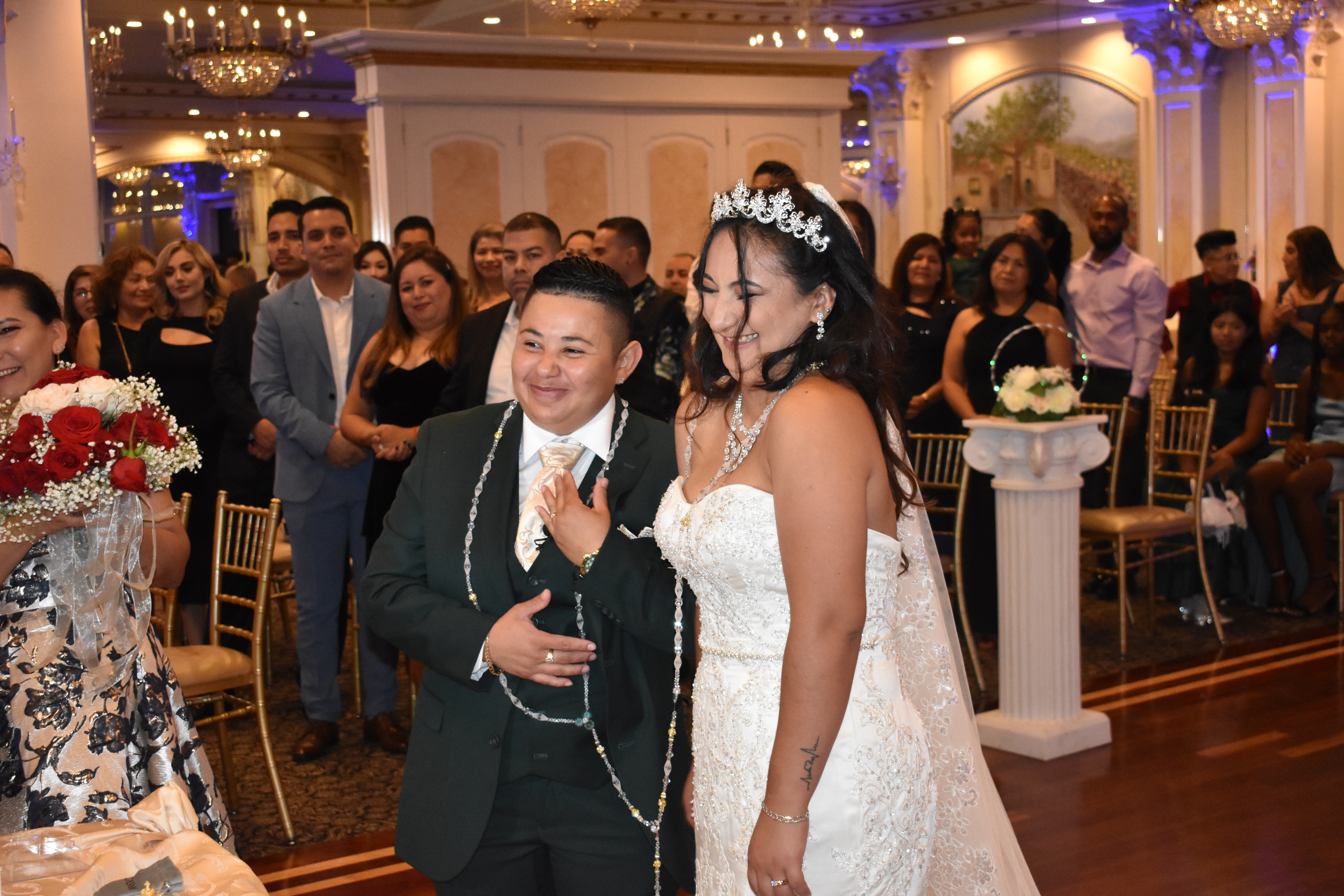 Las novias son salvadoreñas, se conocieron en Nueva York y tienen casi tres años de noviazgo. Querían cumplir su sueño de detalles religiosos en la ceremonia, por lo cual, incluimos el lazo, las arras, y bendiciones. Vicky entró con su madre, Victoria Cárcamo. Cortejo de honor fue Alex y Juan; Yeini y Ana; Claudia y José; Teresa y Henry; Joheny y Kelvin. Los pétalos fueron regados por las gemelas Summer y Autum que fueron guiadas por su hermana Jukiet. Los capullitos que trajeron los anillos fueron Itzel y Jacob. La novia Luisa llegó con su madre, Lorena Argueta. Todo quedó hermoso y las novias sonrientes desfilaron para ir a tomarse fotos en el jardin del bello salón Verdis en Westbury.