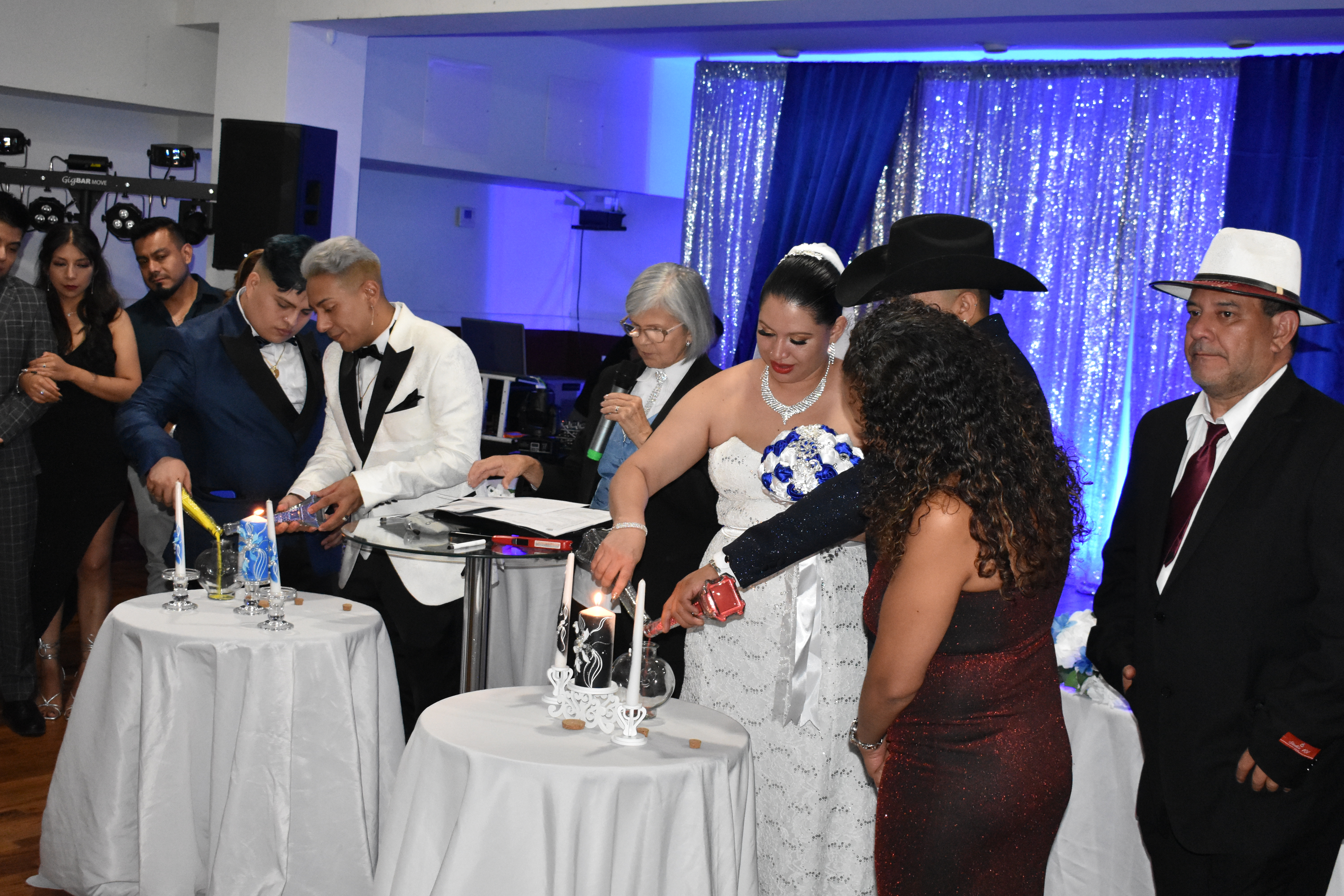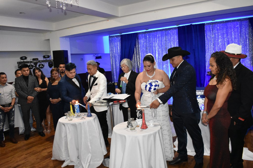 Los novios son dos jóvenes guapos y simpaticos, ambos mexicanos que vinieron a New York en búsqueda de la felicidad y acá encontraron el amor. Se conocieron a través de las paginas sociales, iniciaron amistad y de allí floreció el amor que hoy los hace unirse en matrimonio. Acompañados de familiares y amigos celebraron su boda en un club en Queens. as damas de honor fueron Alexandra Lopez, Alexa Figueroa, Yocely Villaroel, Aracelis Tepos y Gitsel. Los anillos los trajo Yanet y los pétalos estuvieron regados por Dayana. Samantha trajo el anuncio de “Aquí vienen los novios”