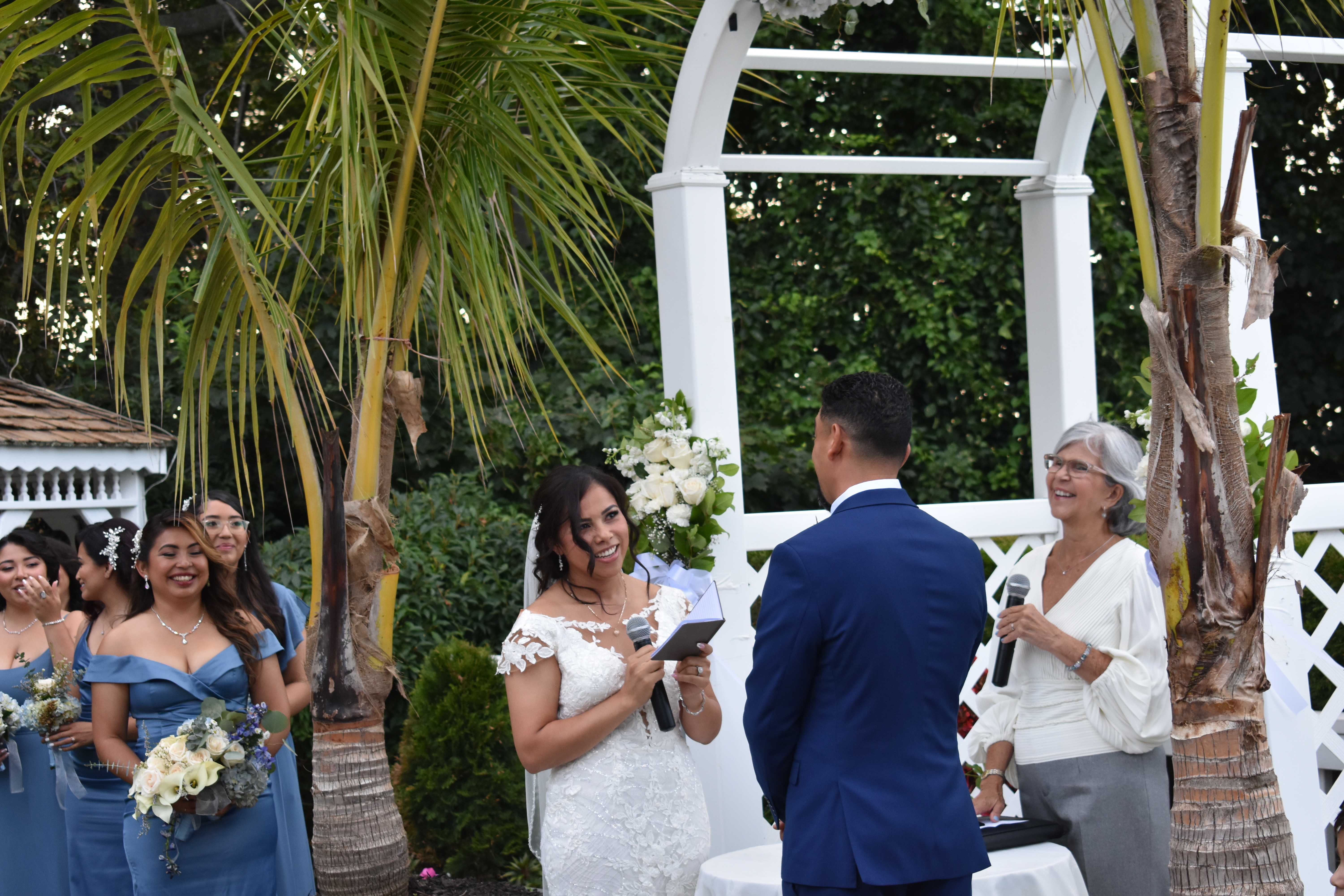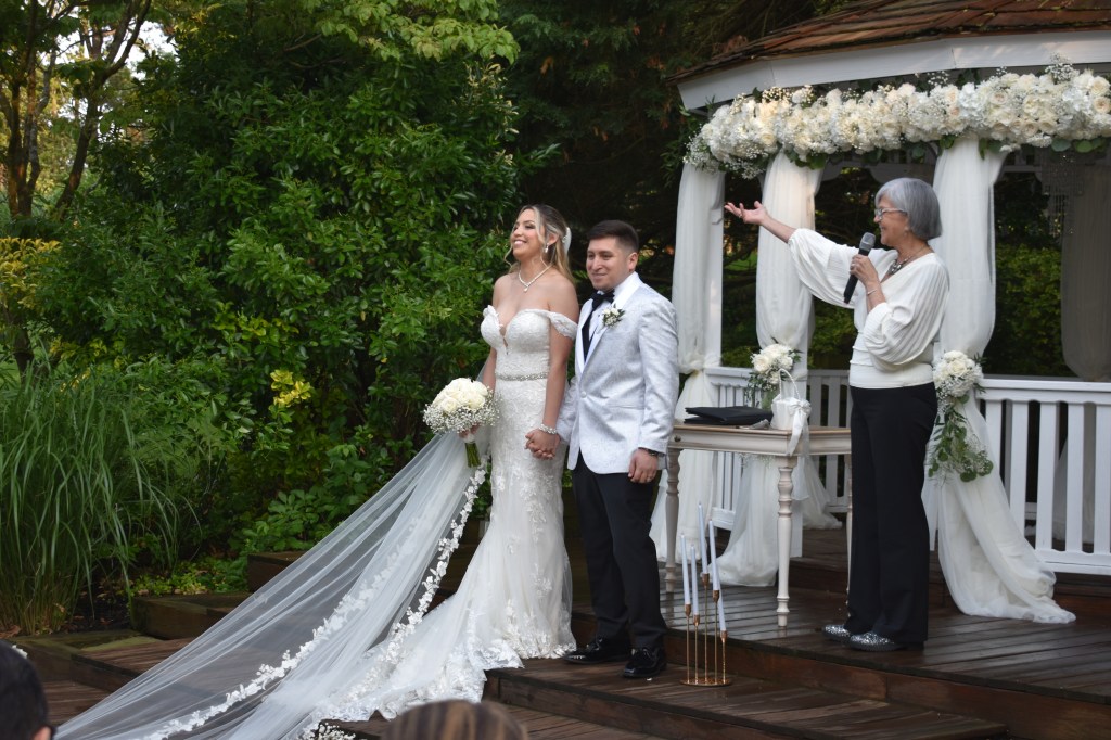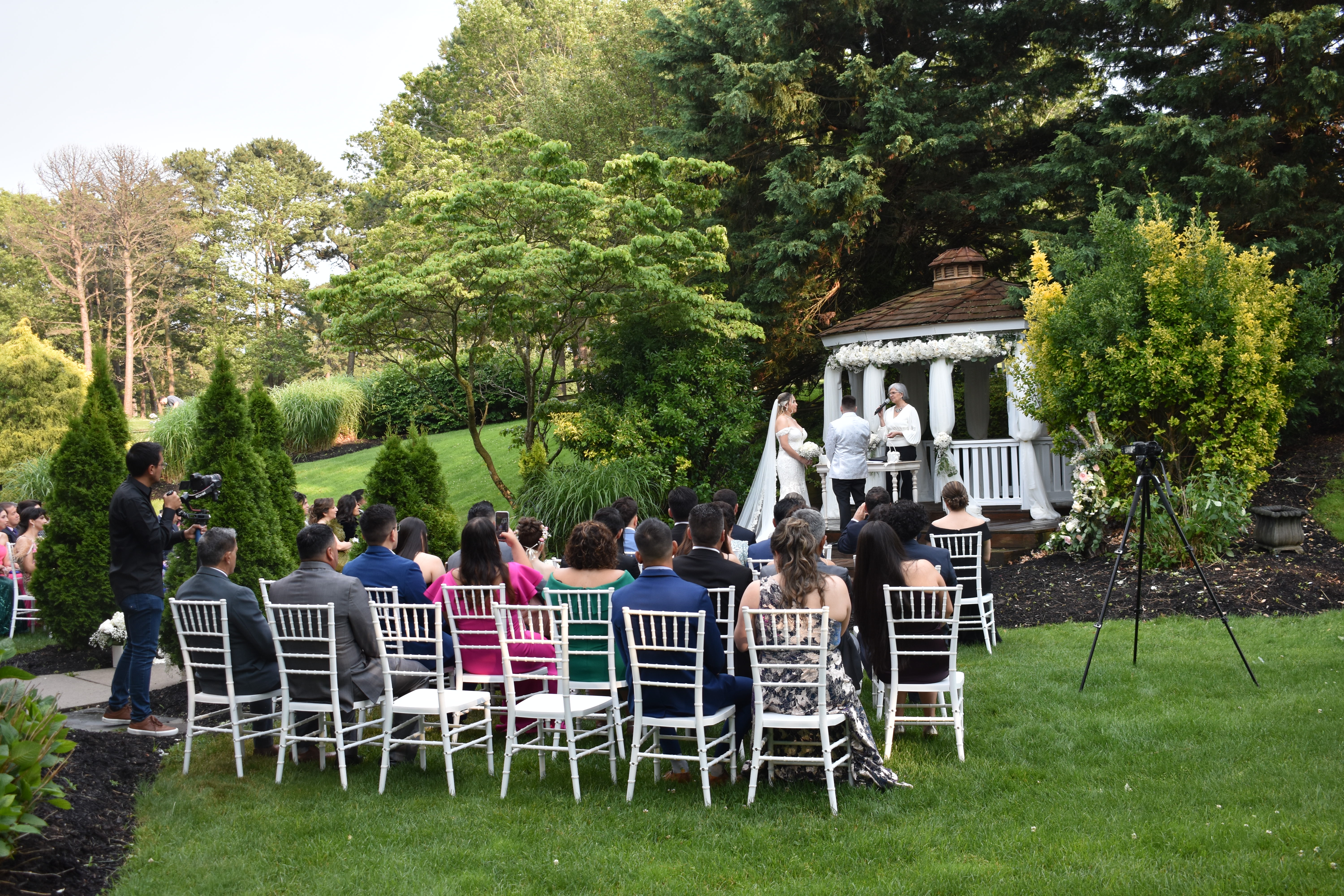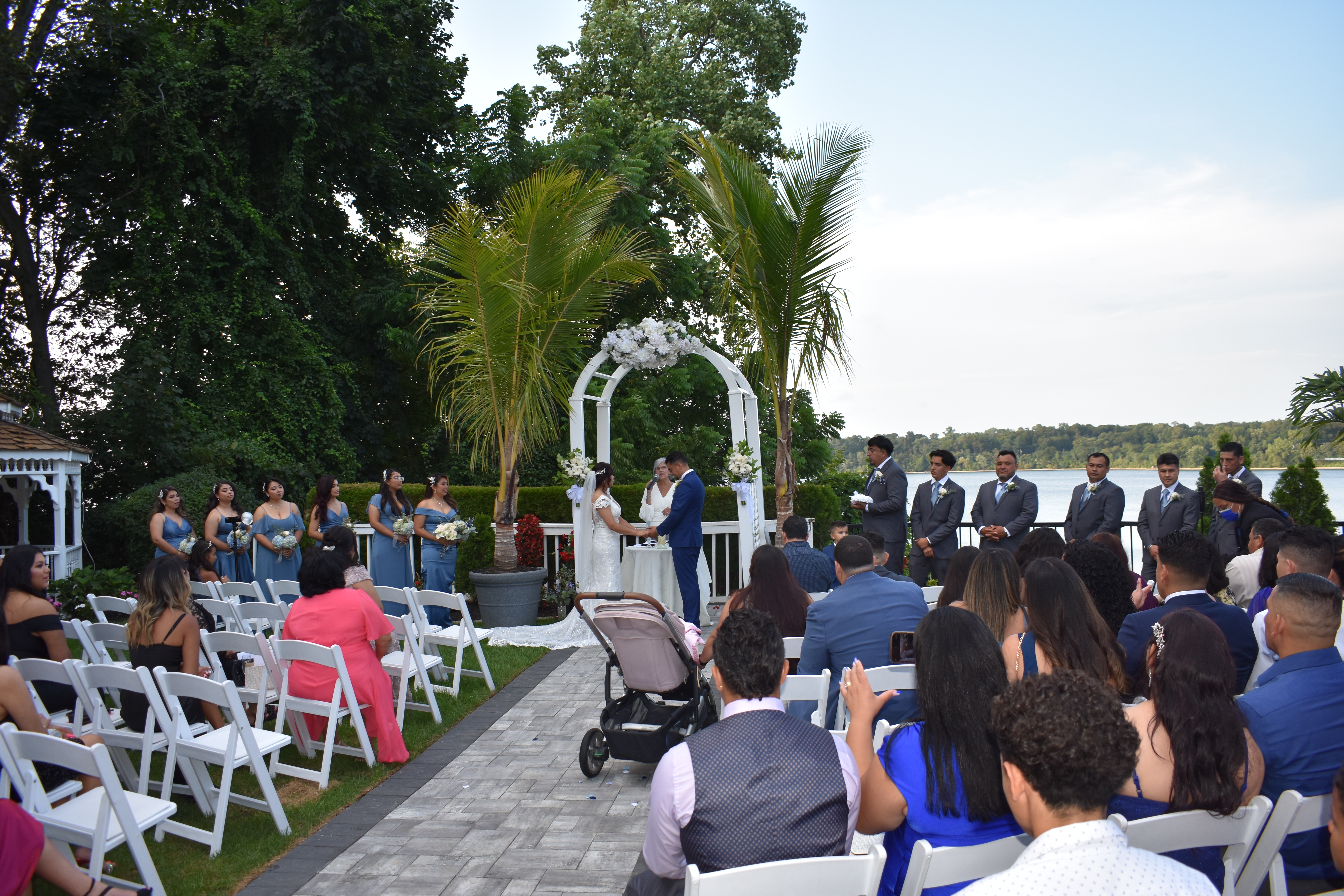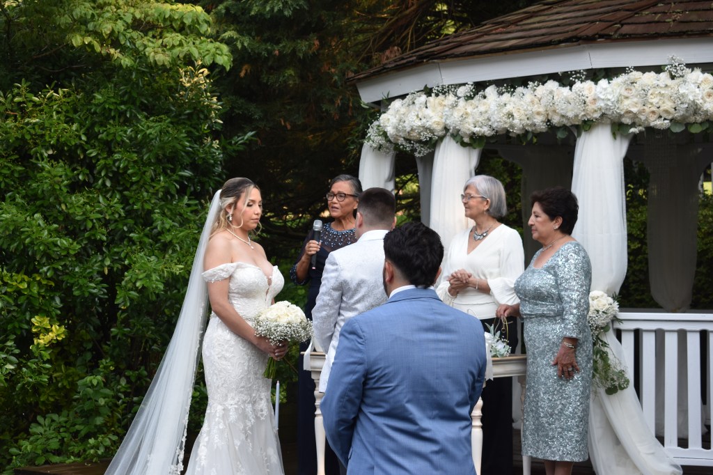 Gilma Mercedes y Oscar Felipe, son ecuatorianos y tienen varios años de noviazgo. Fueron bendecidos con una agradable lluvia, la cual, se detuvo en la hora estimada para el evento. Las abuelas de ambos novios, viajaron desde Ecuador para estar presentes. A ambas les di la palabra y dijeron lindos mensajes para sus nietos. El jardin del Restaurante Trio en Patchogue es extenso, lindo y cuenta con un romántico gazebo.