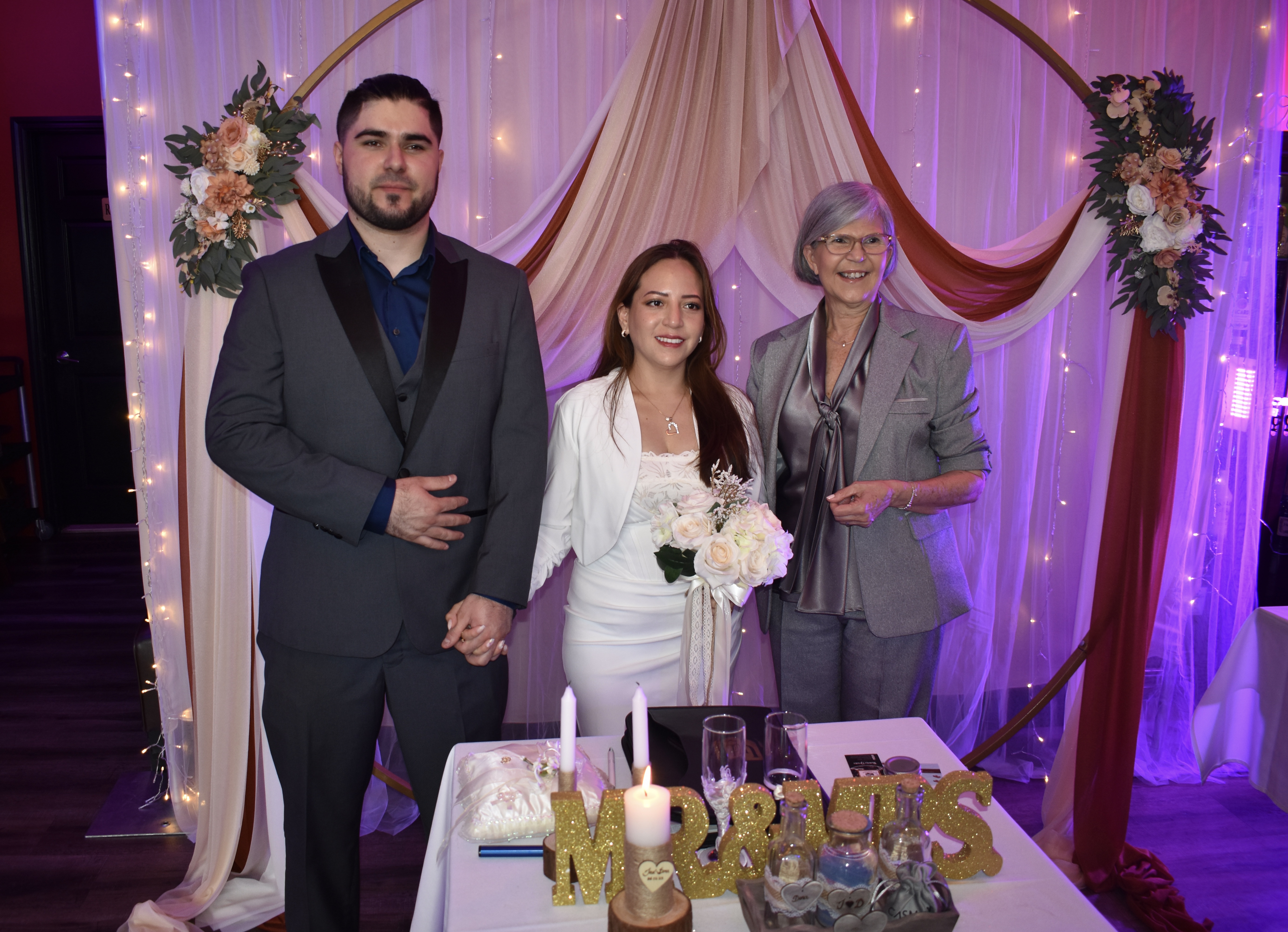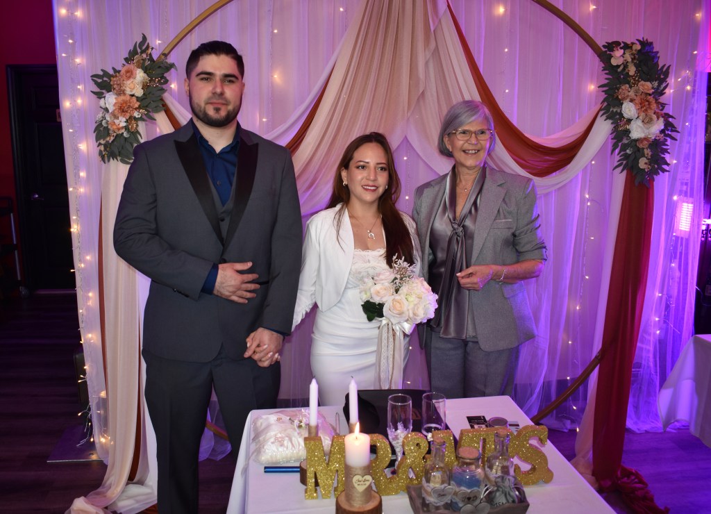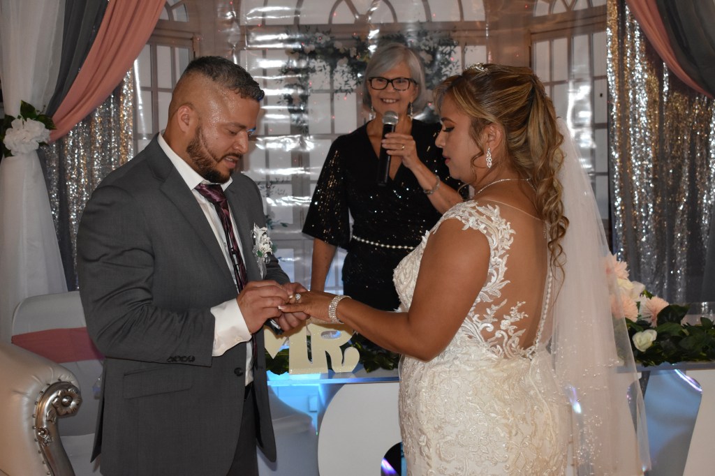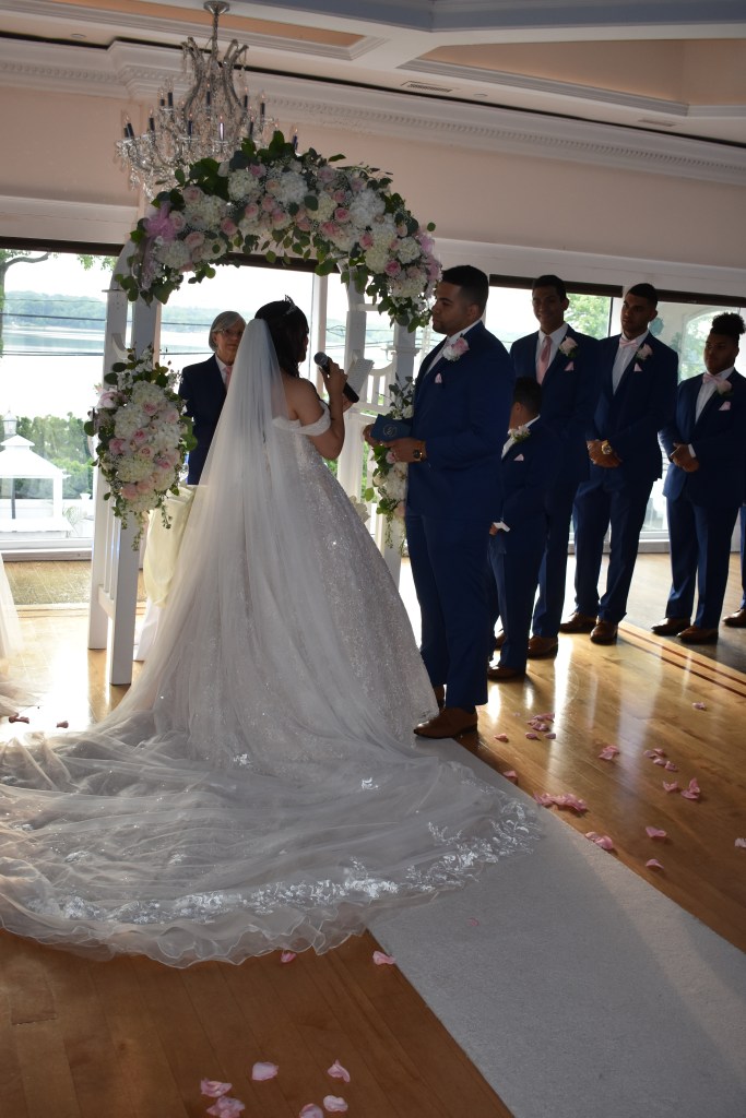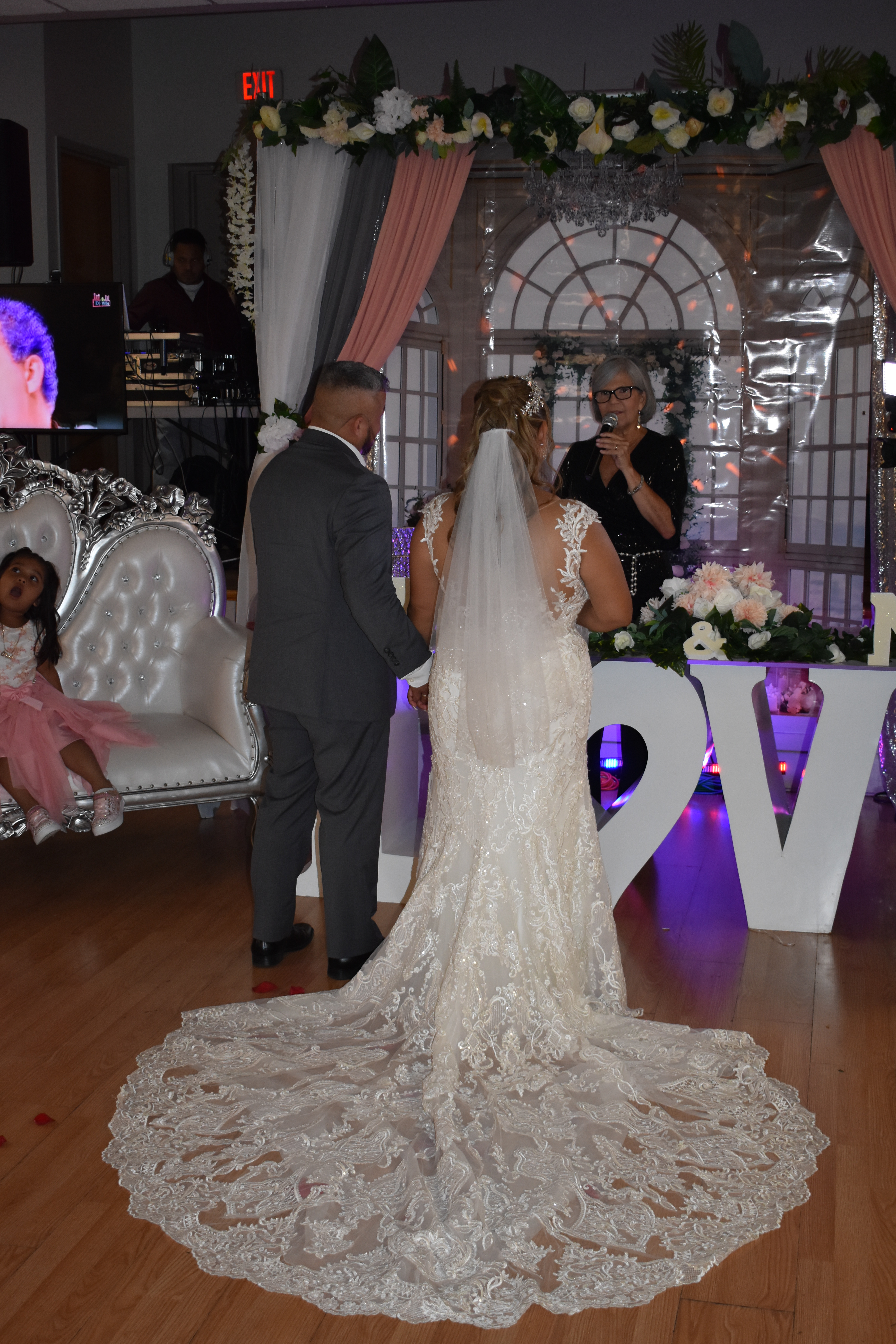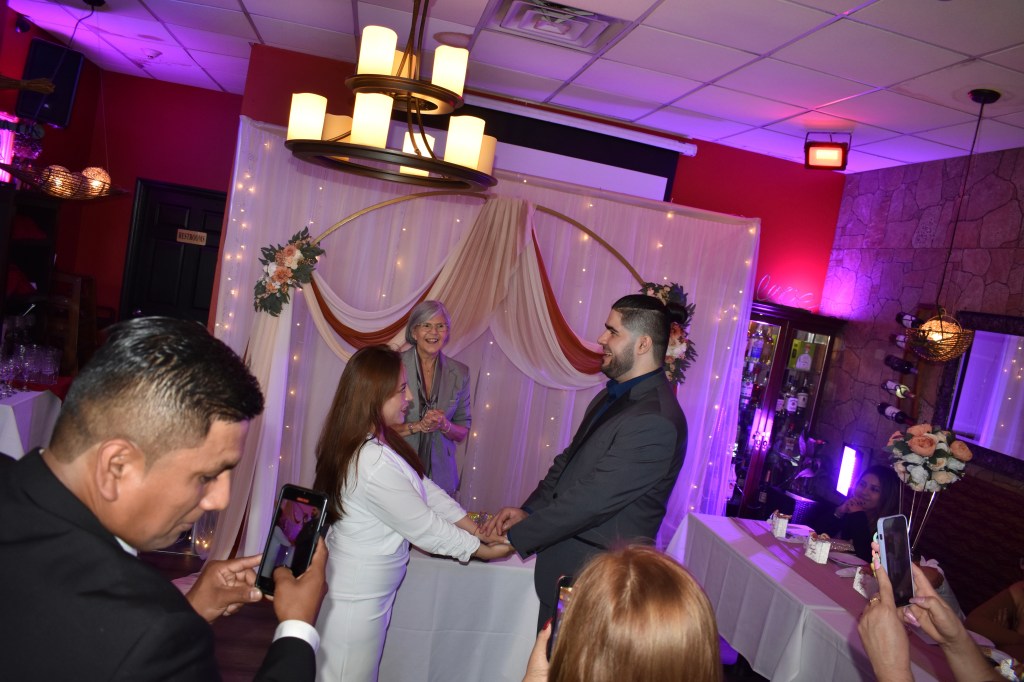 Karen es salvadoreña y Julio es de Guatemala; se conocieron en Long Island y no son tímidos en expresar el gran amor que sienten el uno por el otro. A la hora estimada, ya estaban acompañados de familiares y amigos en el Club American Legion en Riverhead. Julio entró con su madre, Rosario. Karen llegó con su hermano Maikon. Los novios son creyentes y por ello incluimos bendiciones De Dios y el ritual del lazo. Boda 18/12/2022