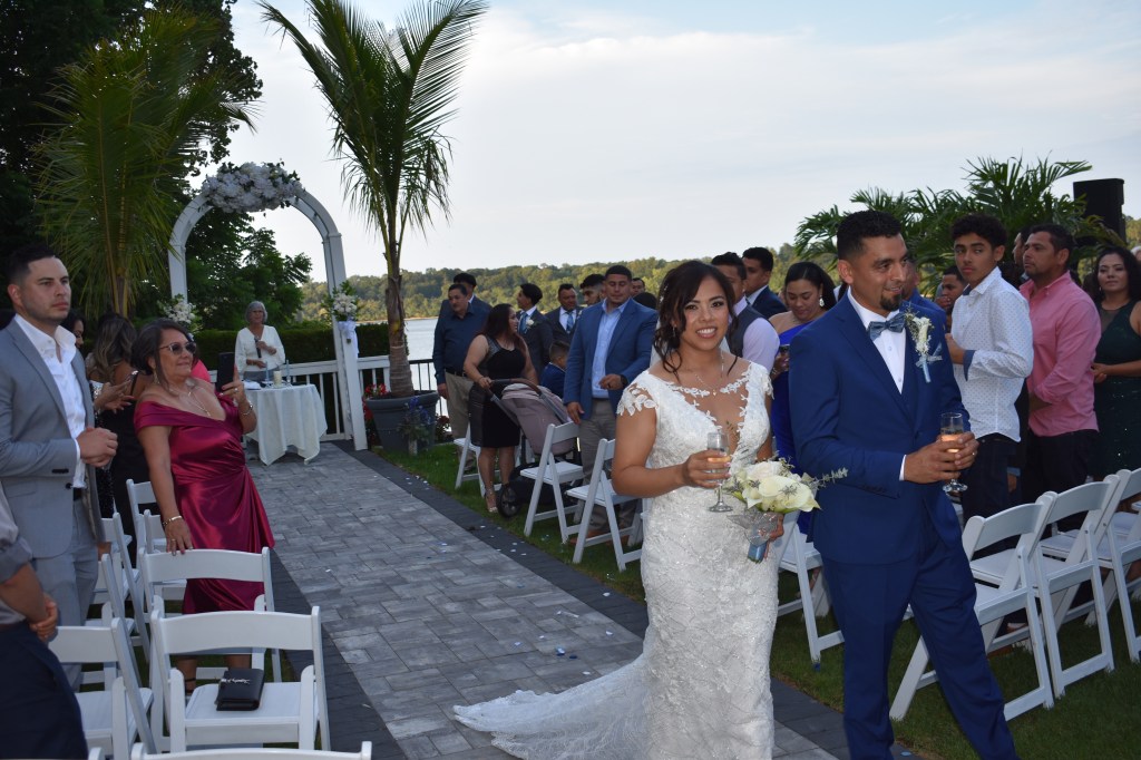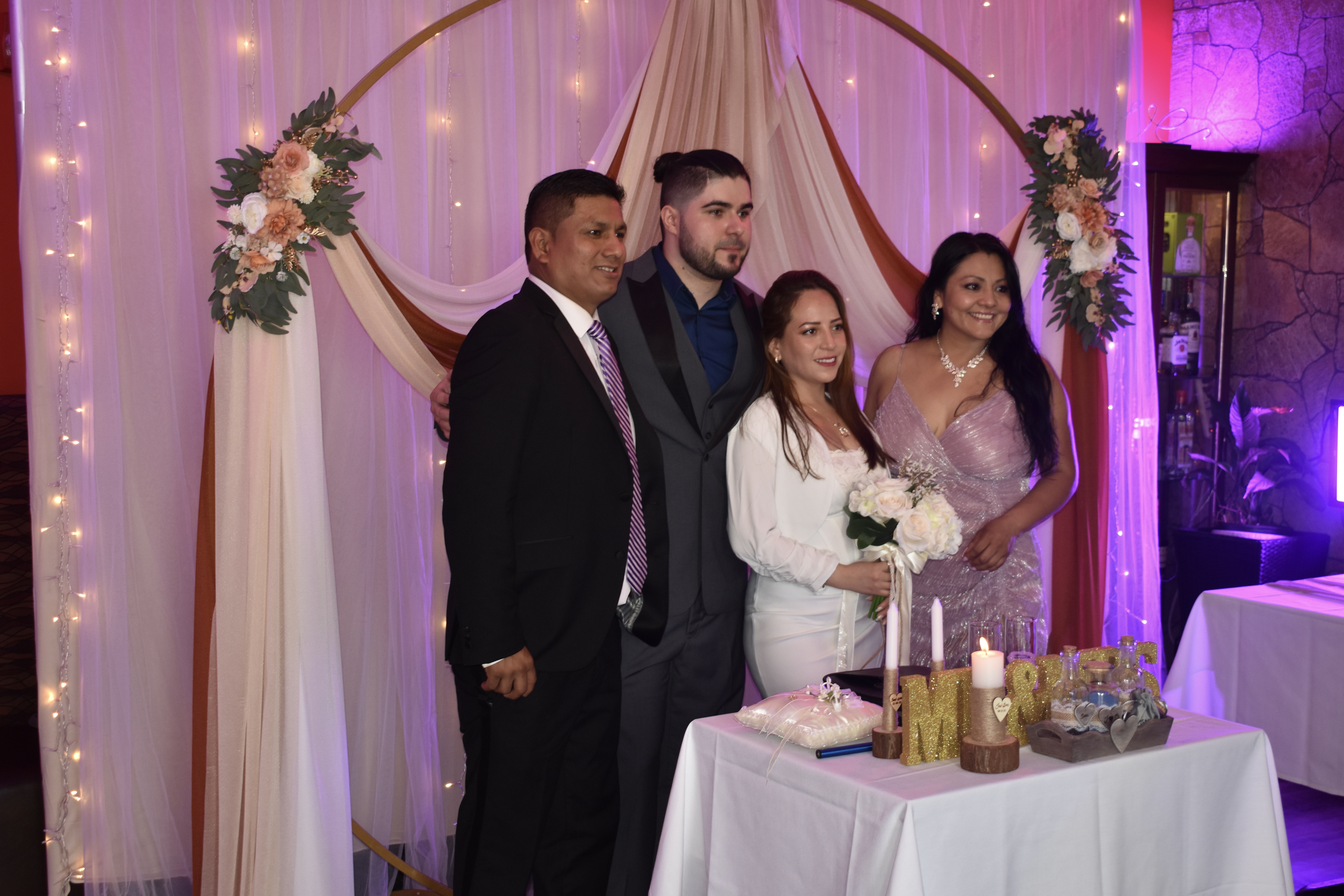 Los novios son salvadoreños, tienen seis años de relación y un hijo de dos años de edad. Los ahora recién casados, lucían radiantes y felices. La novia es hermana del conocido DJ Anthony, quien se encargó de que todo estuviera perfectamente estimado. Lugar, decoración, musica, comida y oficiante. La ceremonia civil fue seguida por la religiosa. Boda 5/8/2023